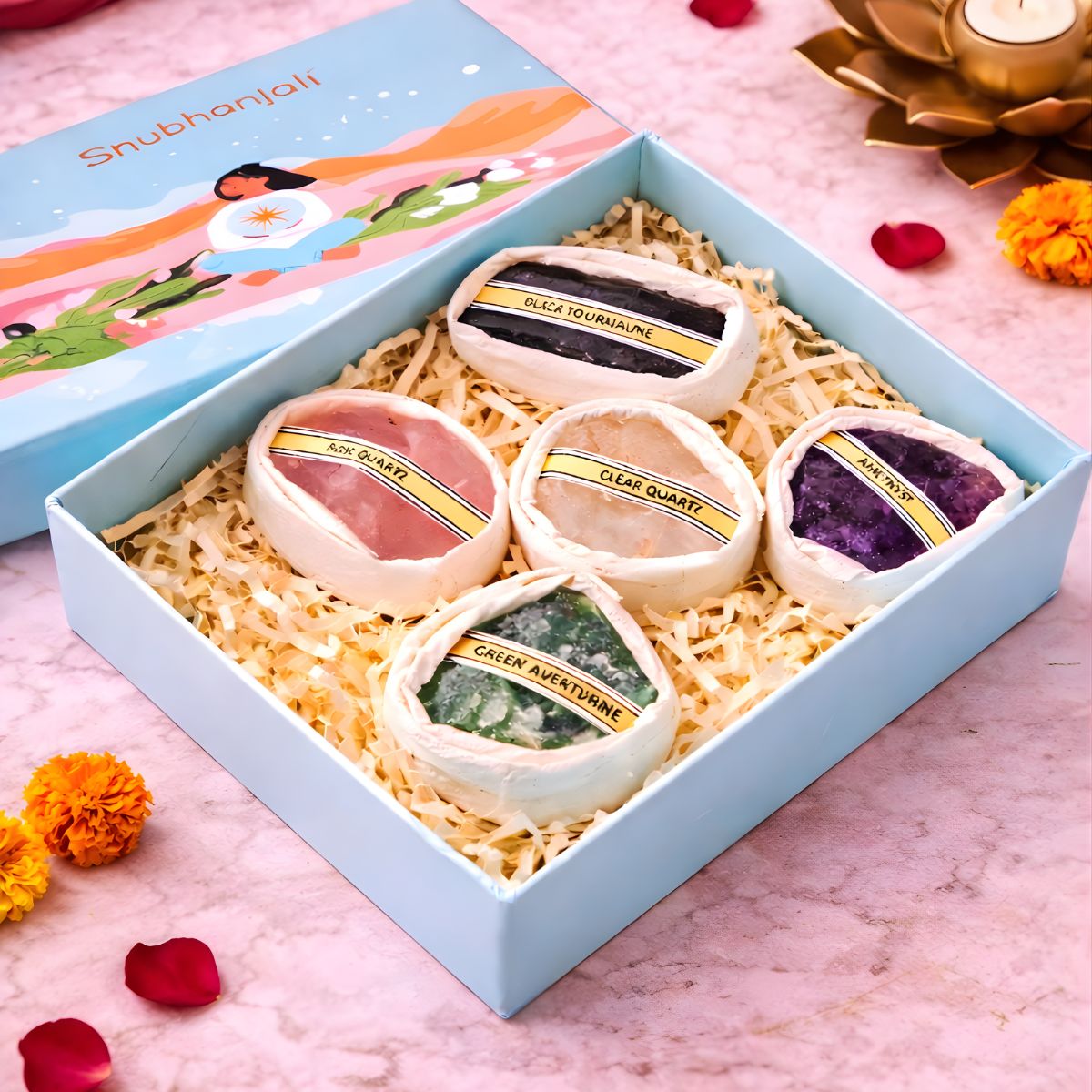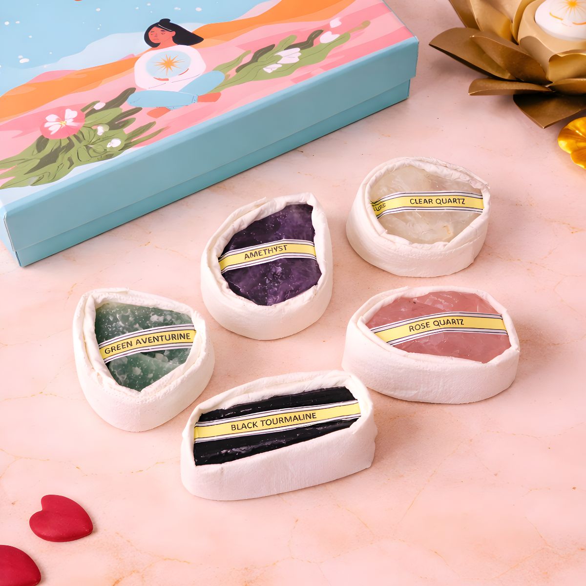 Celebrate the powerful energy of crystals with this 5 Essential Crystal Set, featuring raw, natural stones known for their unique healing properties.