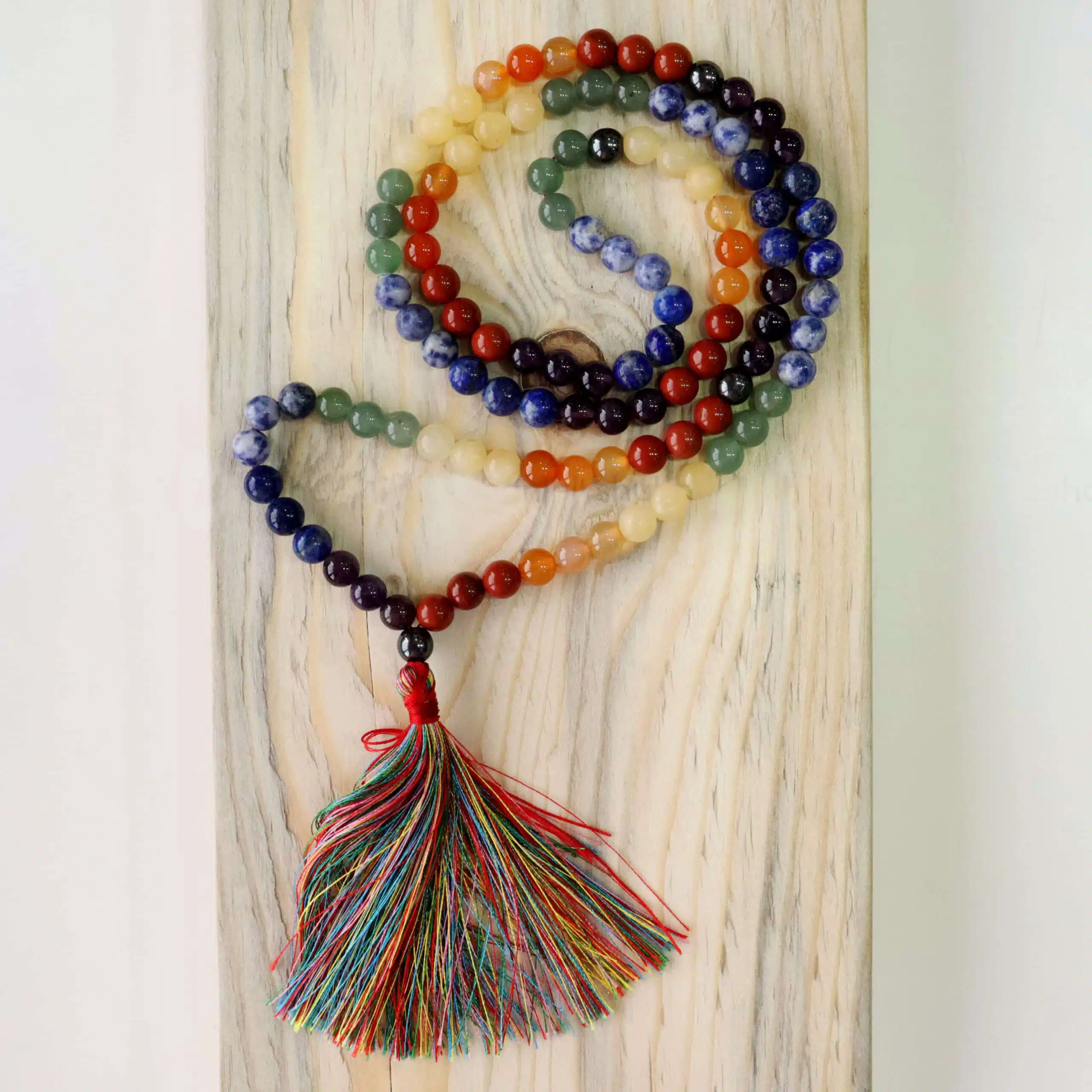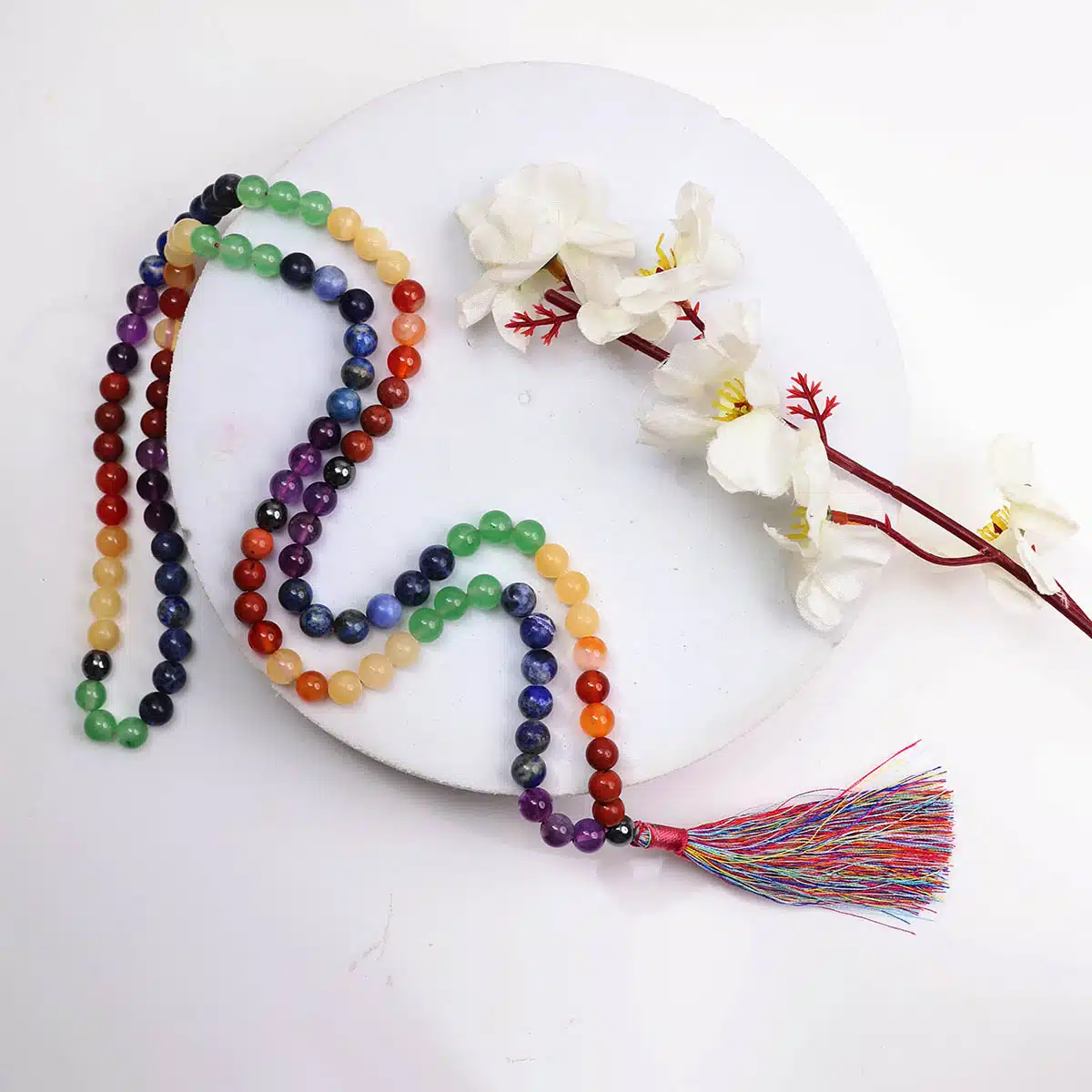 Uplift your spiritual journey by meditating with this 7 chakra Japa Mala. The chakras are associated with a specific symbol and color. Corresponding stones can be used to unlock, cleanse, and balance the different seven chakra points.