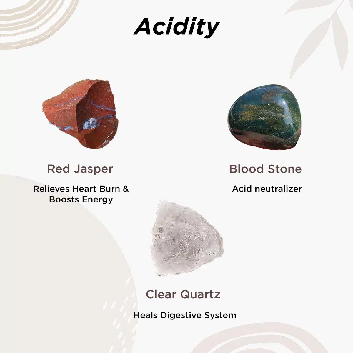Red Jasper – The best variety of Jasper to use for heartburn is red jasper. Relives heart burn & boost energy.