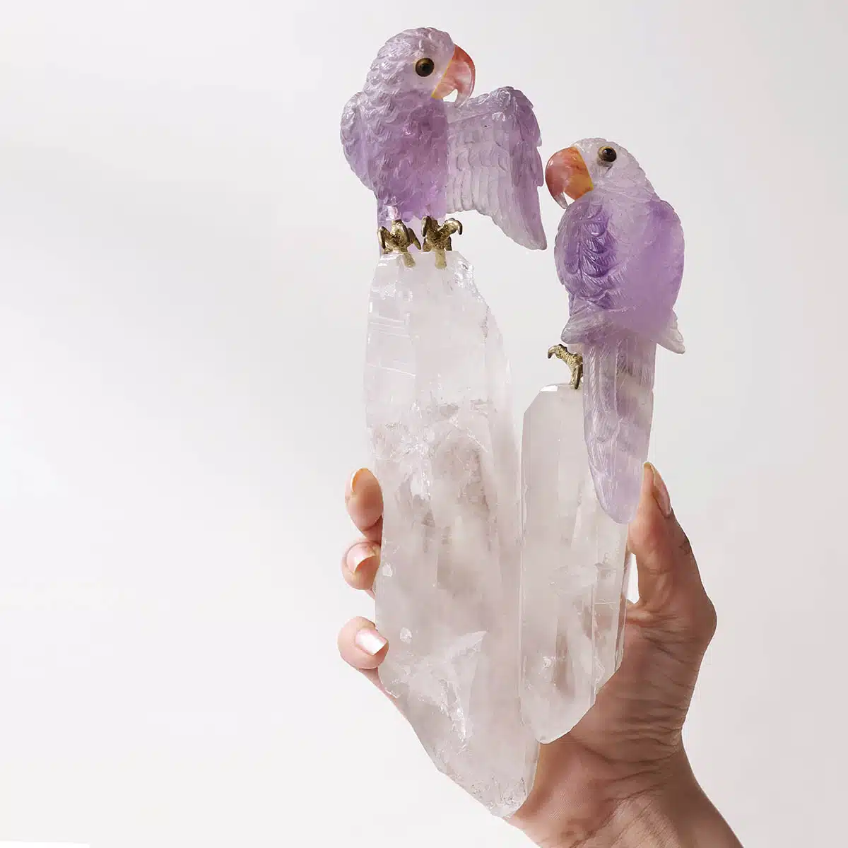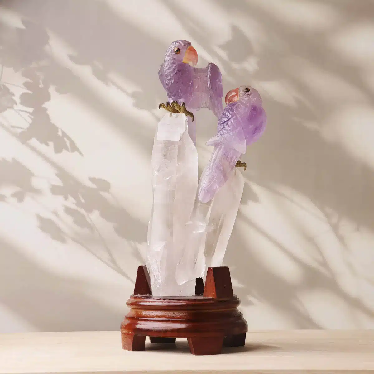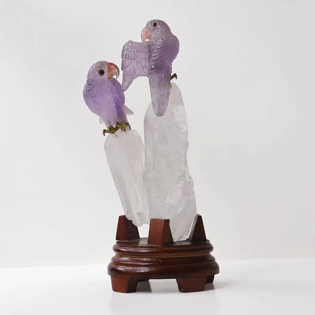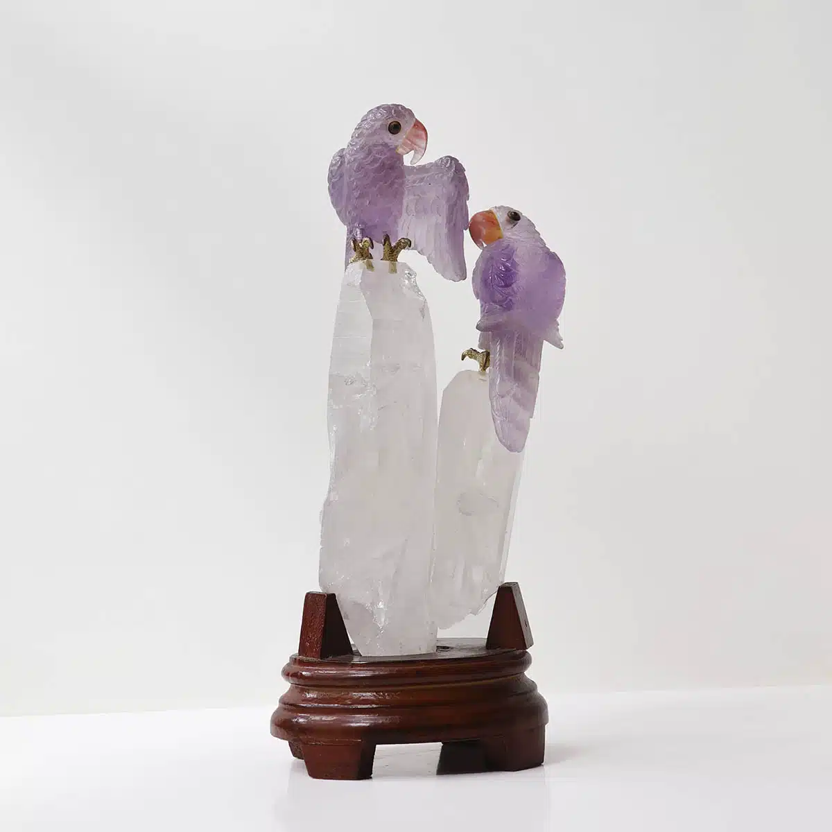 The amethyst parrots gain amplified energy from the clear quartz, making this sculpture ideal for spiritual growth, communication, and emotional clarity.