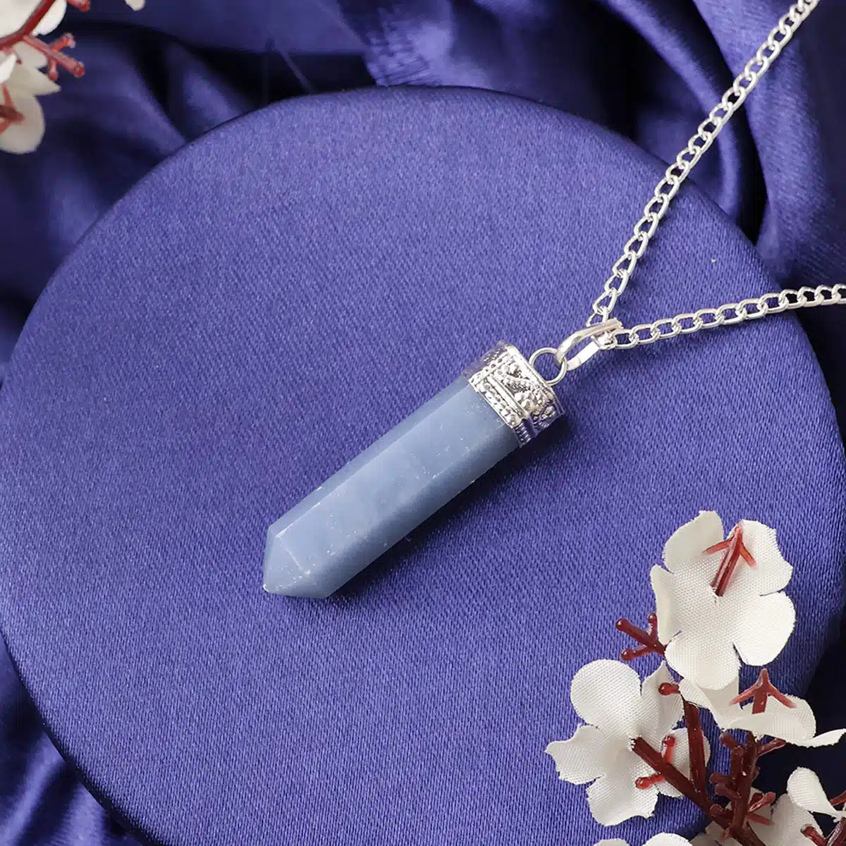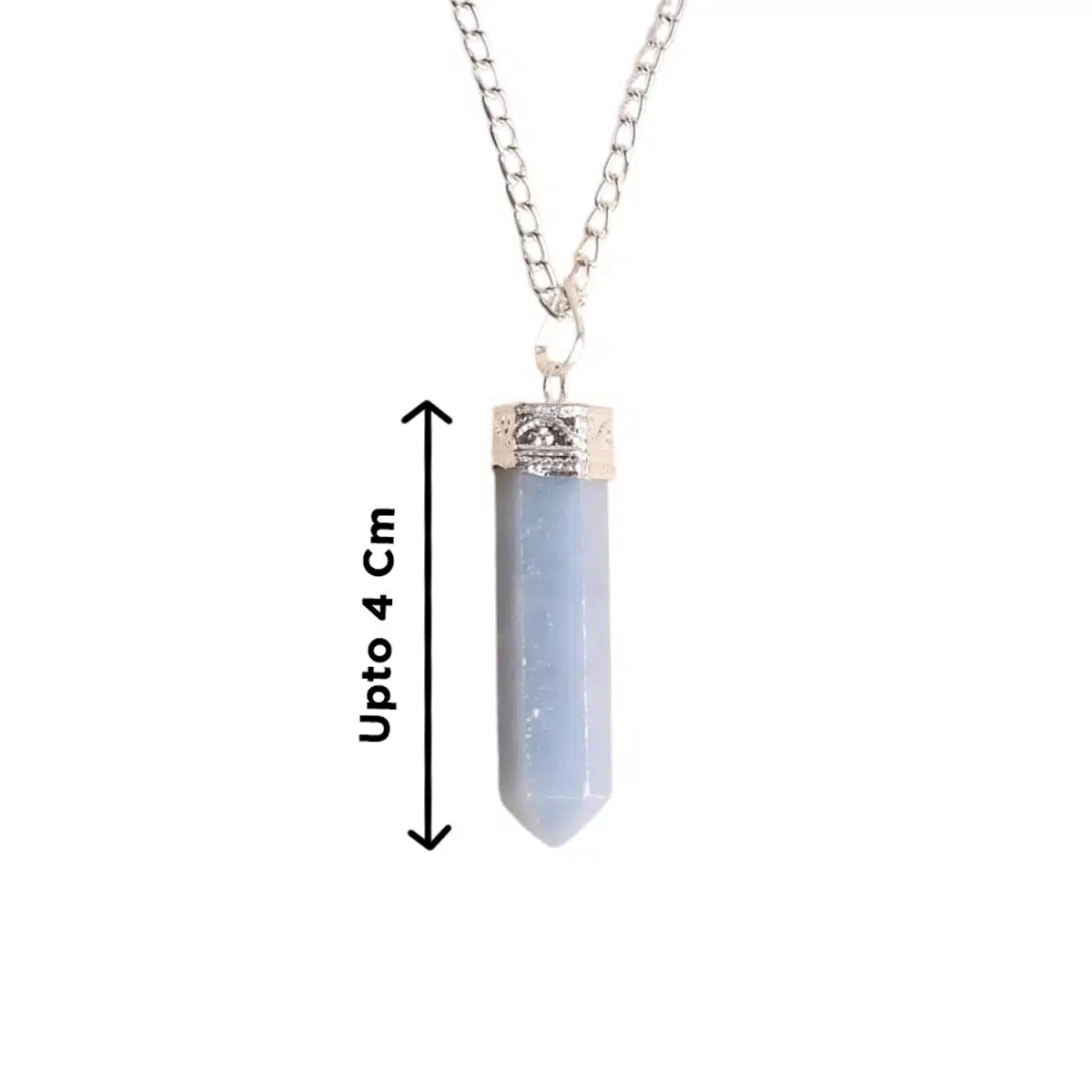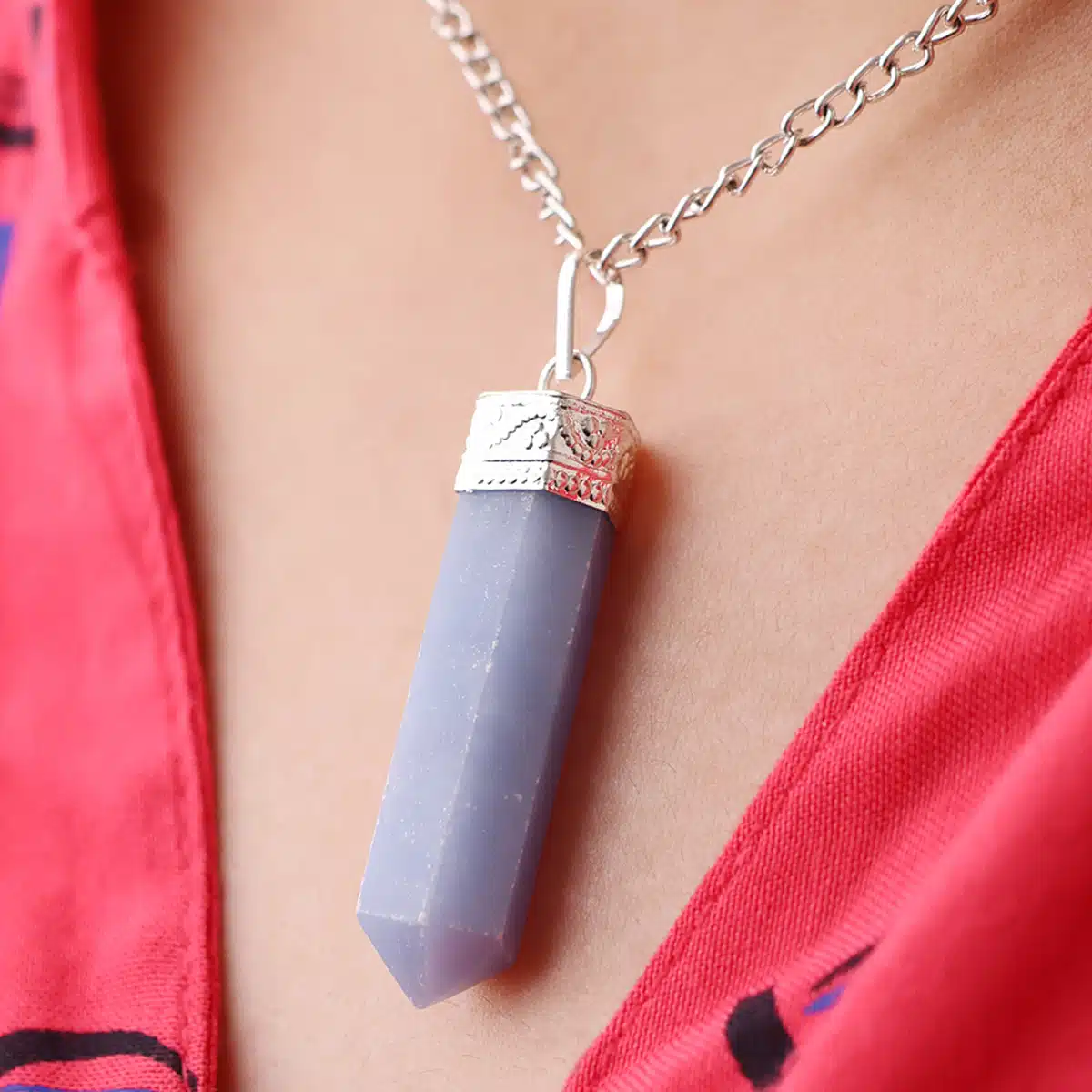 Shubhanjali’s Angelite Pencil Pendant is a serene sky-blue crystal accessory that embodies tranquility, compassion, and spiritual connection. Known as a stone of awareness, Angelite helps you tune into angelic realms, speak your truth with gentleness, and navigate life with calm clarity.