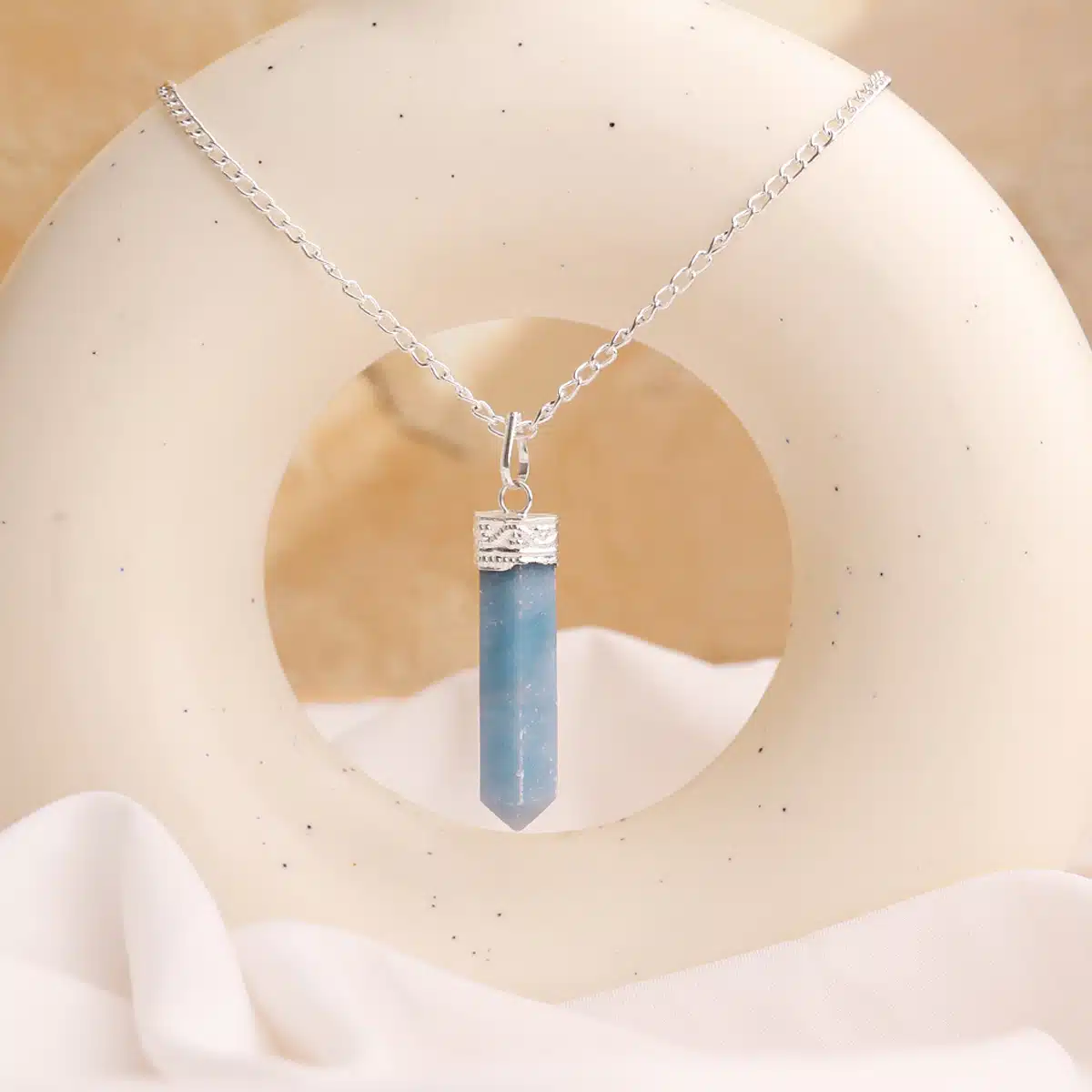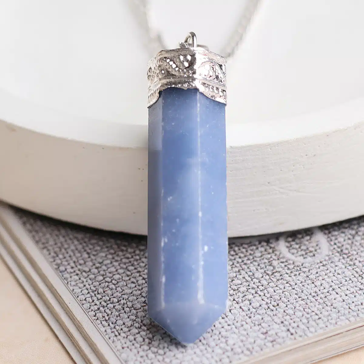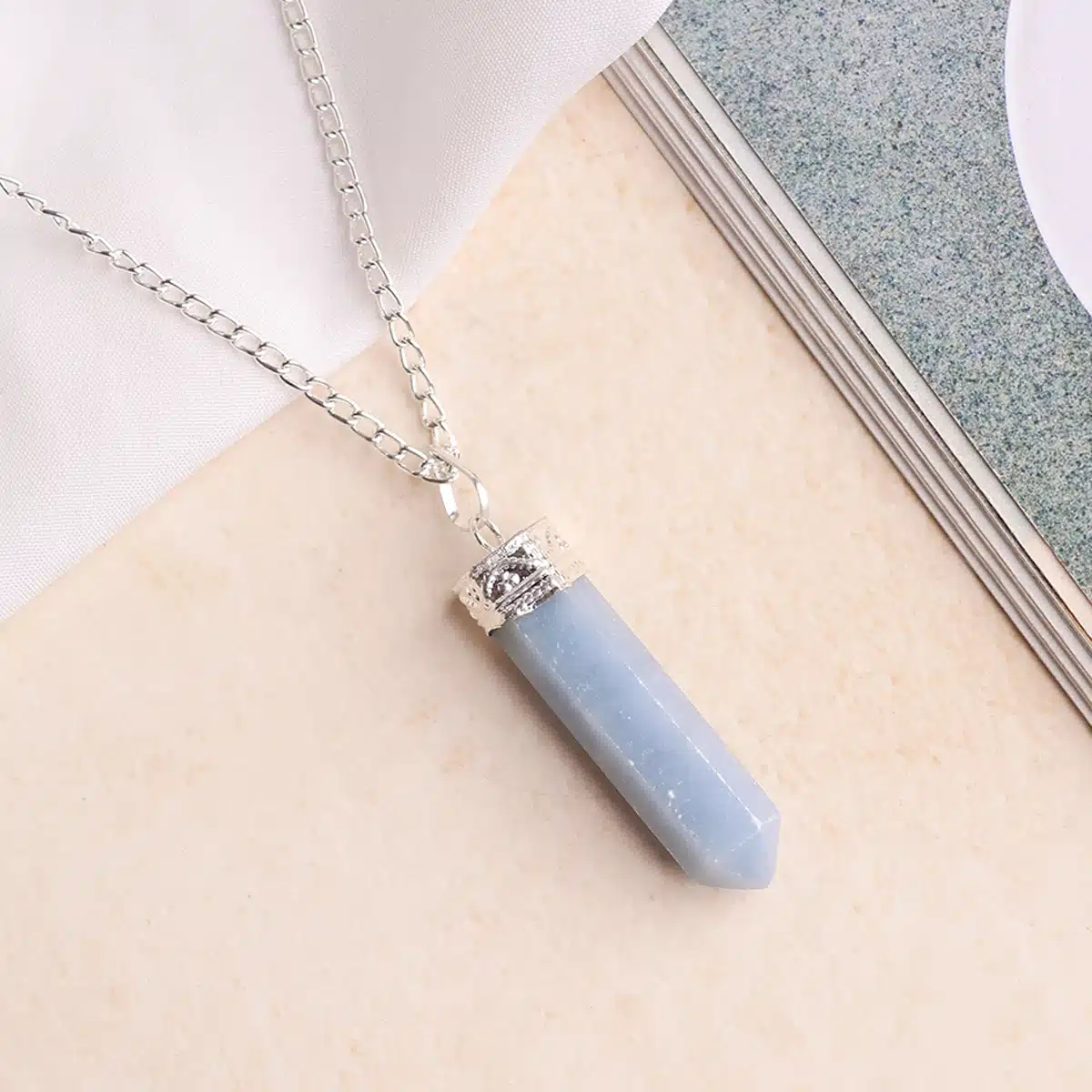 Shubhanjali’s Angelite Pencil Pendant is a serene sky-blue crystal accessory that embodies tranquility, compassion, and spiritual connection. Known as a stone of awareness, Angelite helps you tune into angelic realms, speak your truth with gentleness, and navigate life with calm clarity.