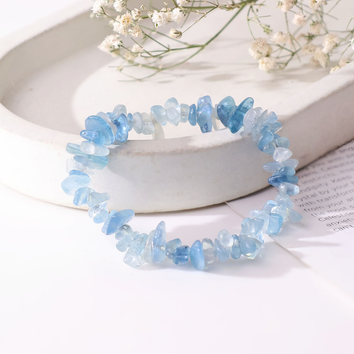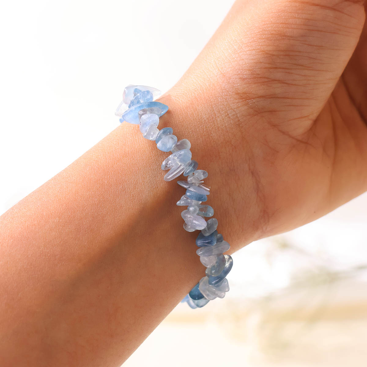 Aquamarine Chips Beads Bracelet features natural chip-shaped stones in soothing blue tones with a soft ocean-like glow. Its unique organic design makes it perfect for everyday wear, adding calmness, clarity, and graceful beauty to your style.