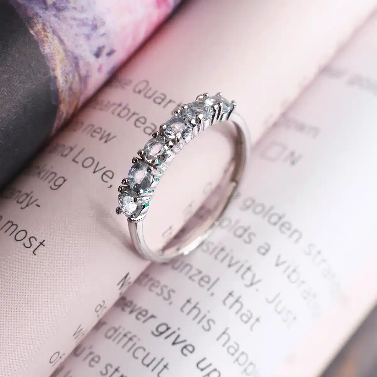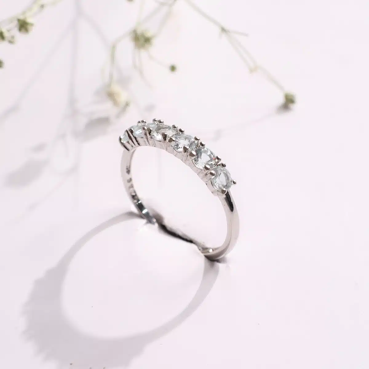The ring features six exquisite aquamarine stones, known for their soothing blue hues reminiscent of the ocean. Aquamarine is associated with qualities such as serenity, clarity, and communication. Each stone is carefully selected for its clarity and color, creating a harmonious arrangement that evokes the calming essence of the sea.