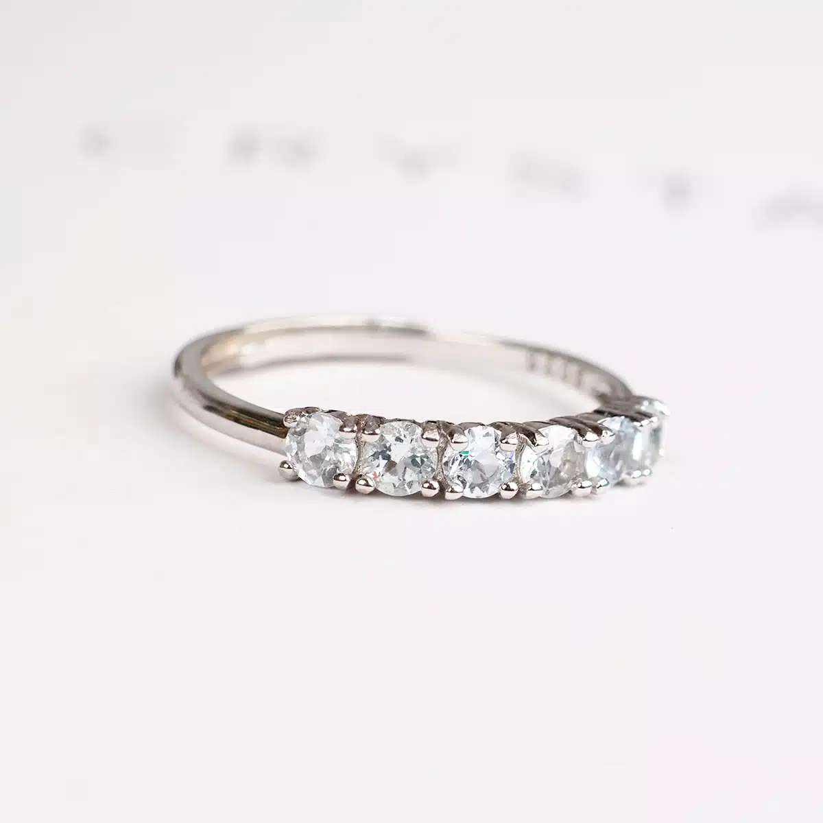 Immerse yourself in the soothing beauty of the Aquamarine Six Stone Ring in Sterling Silver, and experience the perfect blend of style and serenity on your hand.