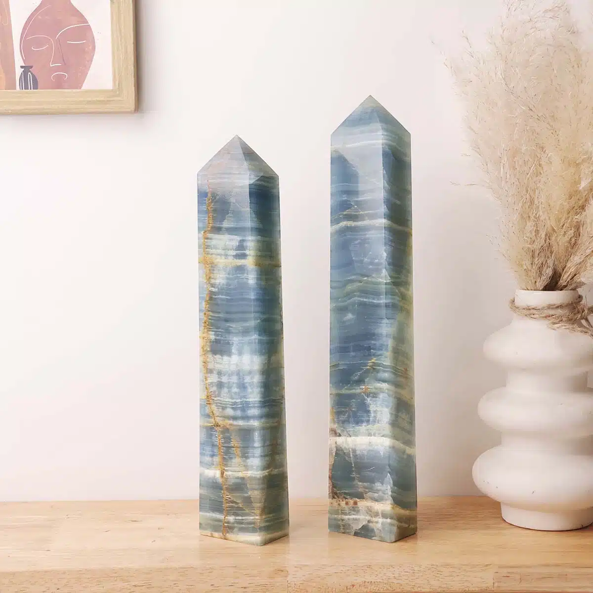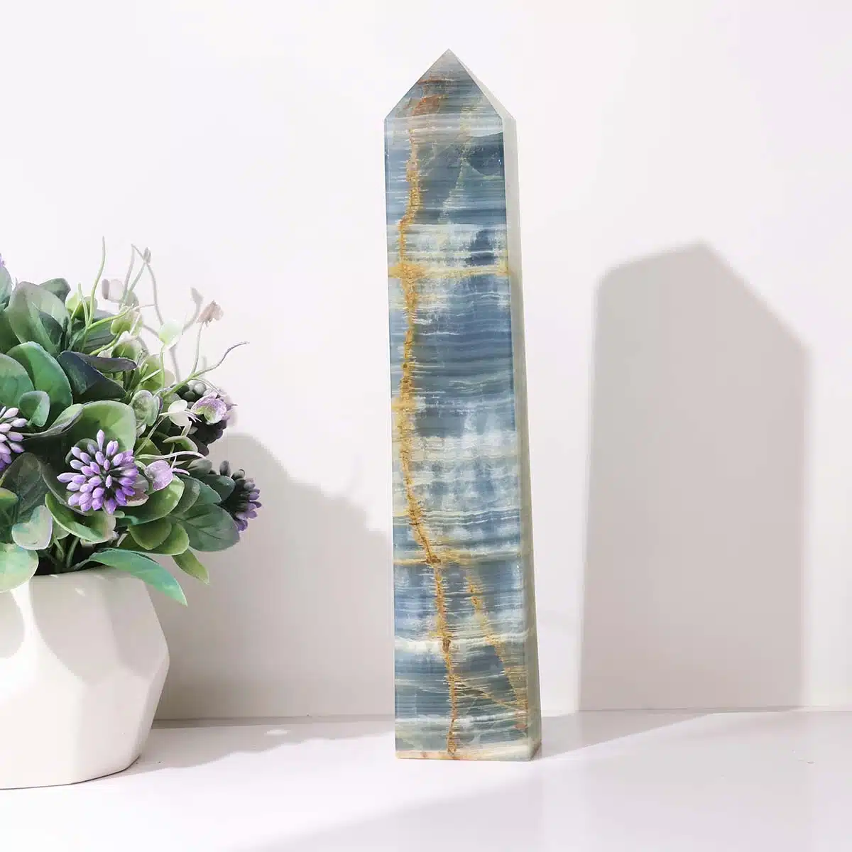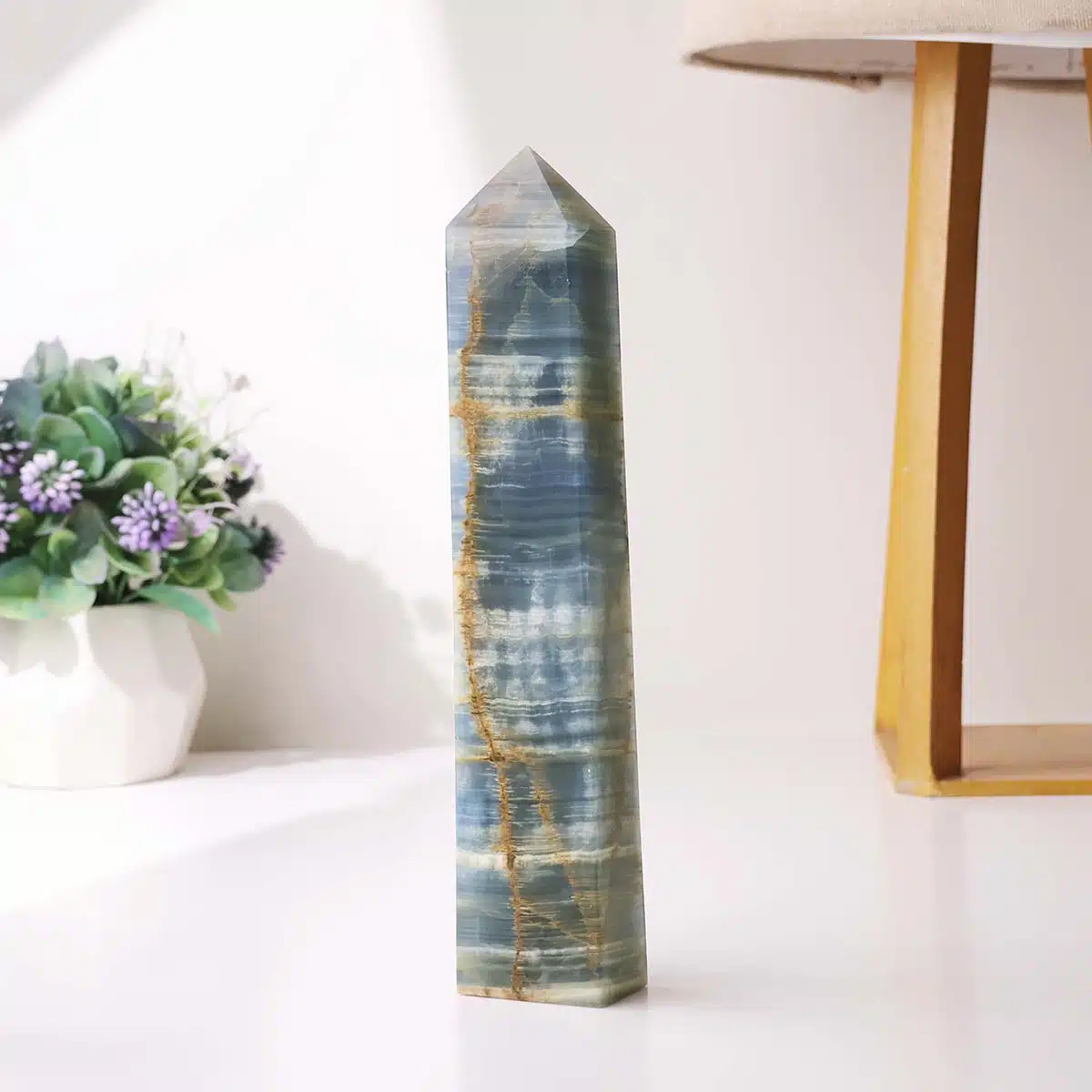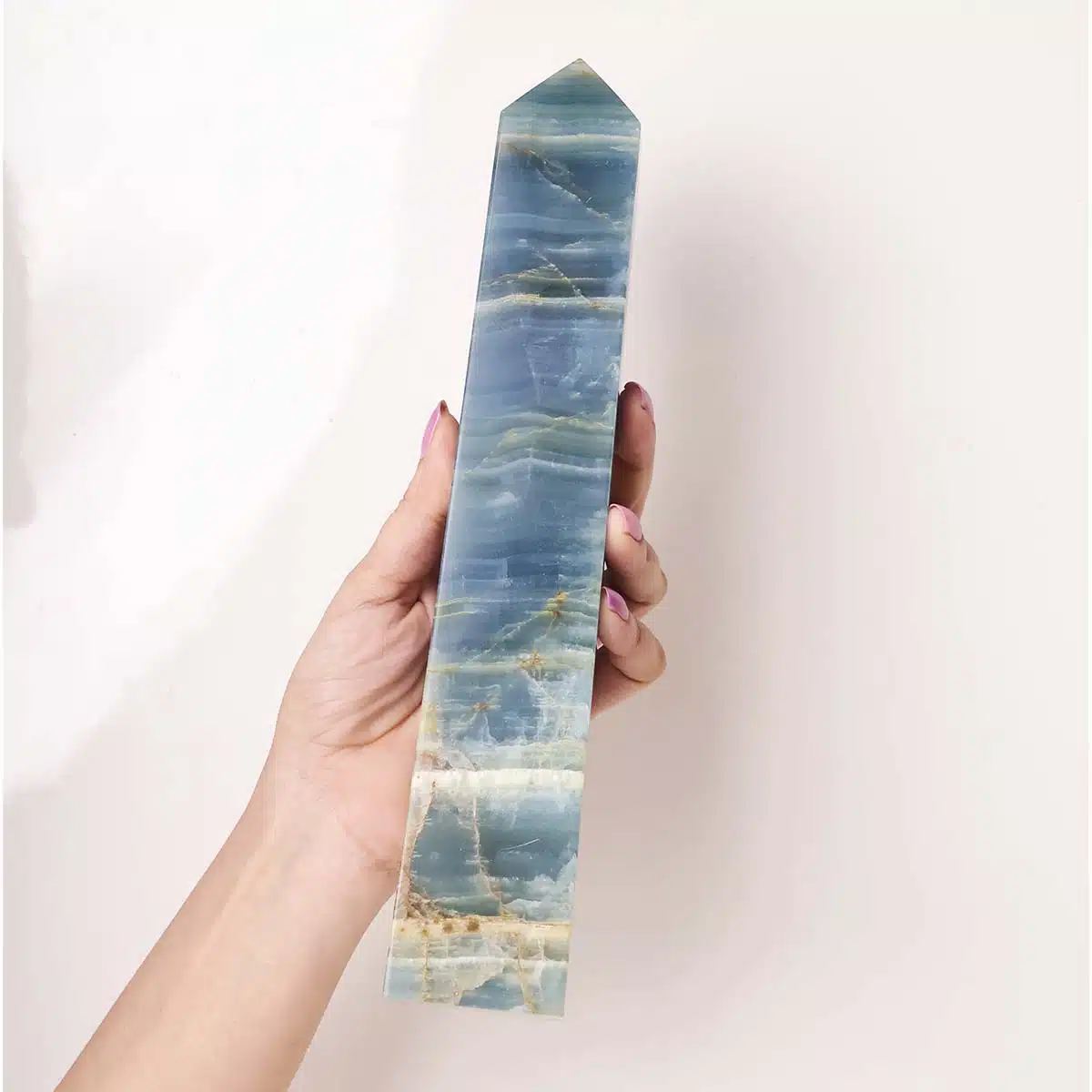 The Blue Onyx Big Tower is a stunning crystal formation known for its serene blue tones and grounding energy. Shaped into a tall, polished tower, this stone channels stabilizing vibrations upward, helping you cultivate mental clarity, inner peace, and focused determination.