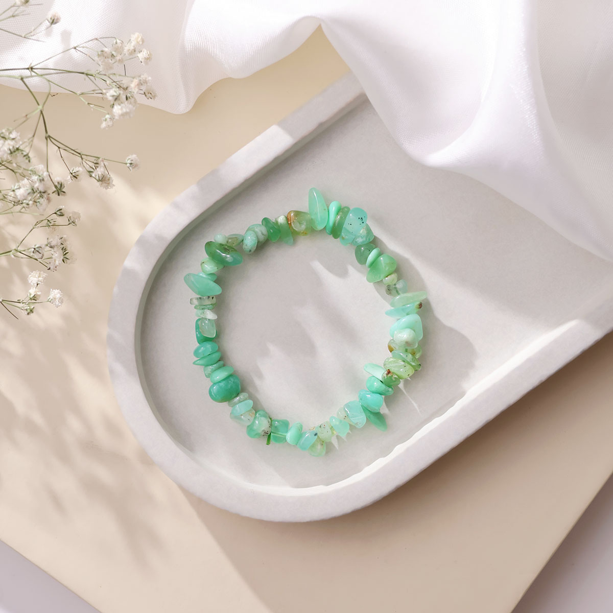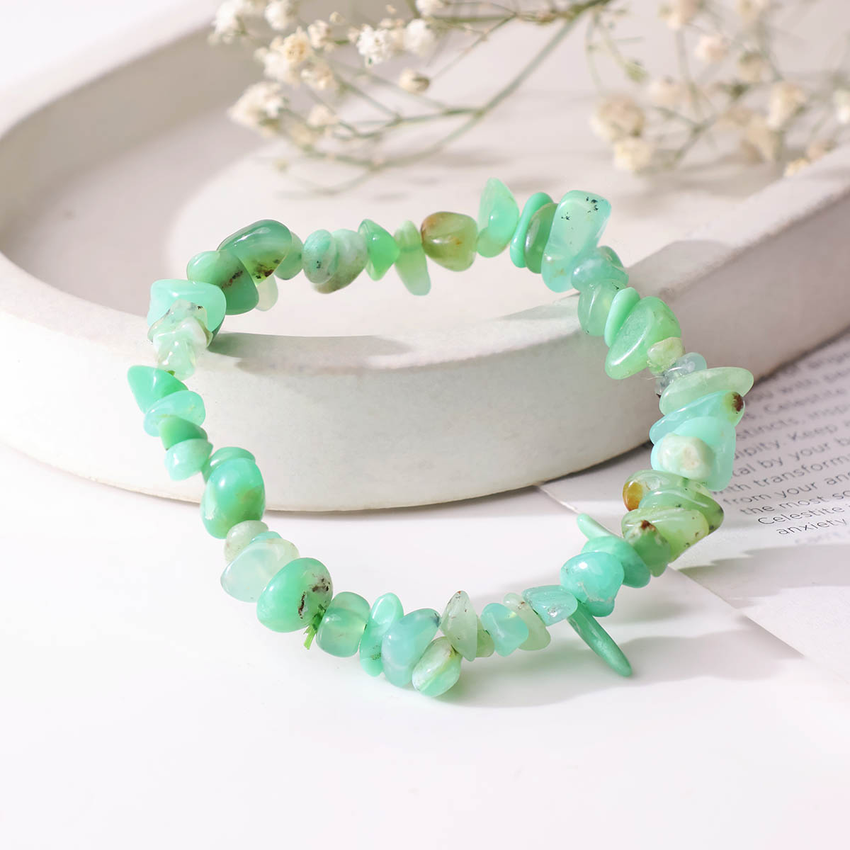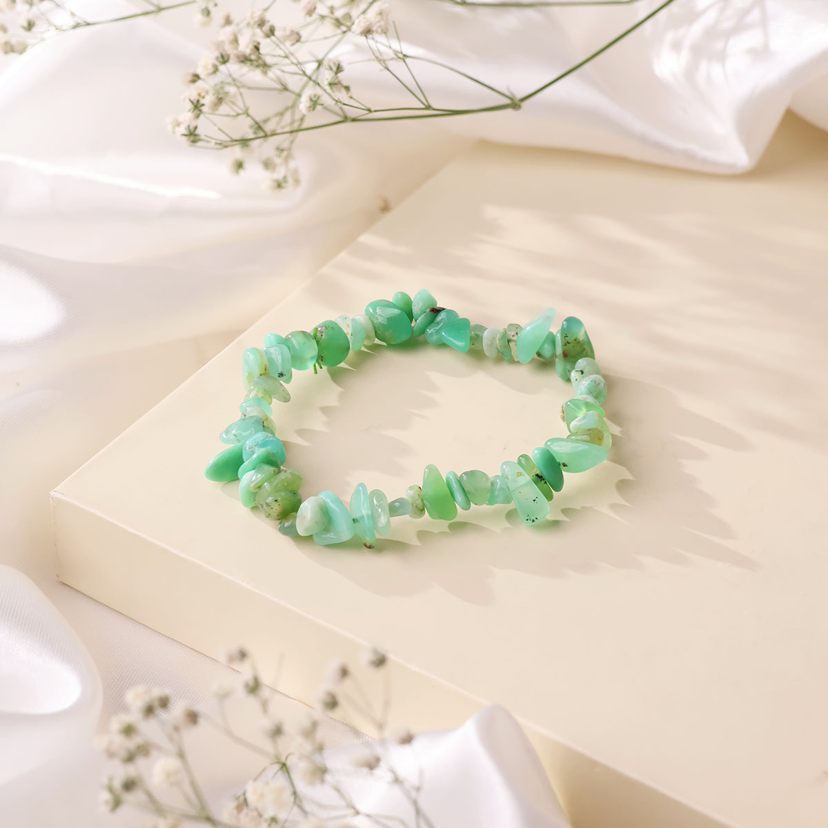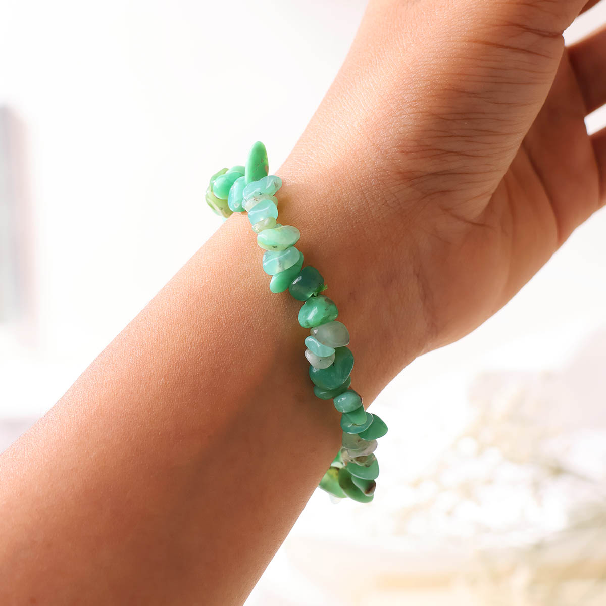Chrysoprase Chips Beads Bracelet features natural chip-shaped stones in vibrant green hues with a lively, soothing glow. Its unique organic design makes it perfect for everyday wear, adding joy, harmony, and natural elegance to your style.