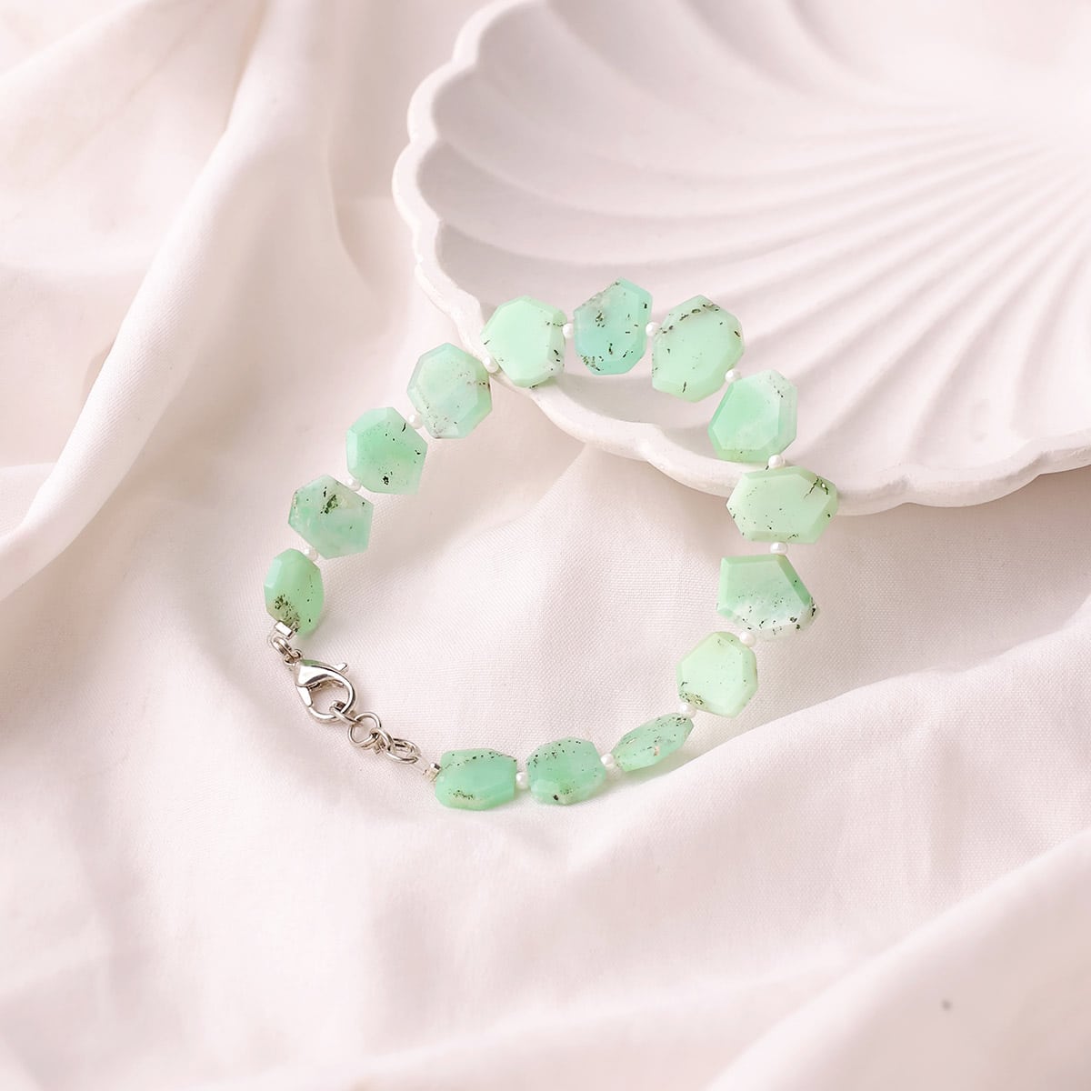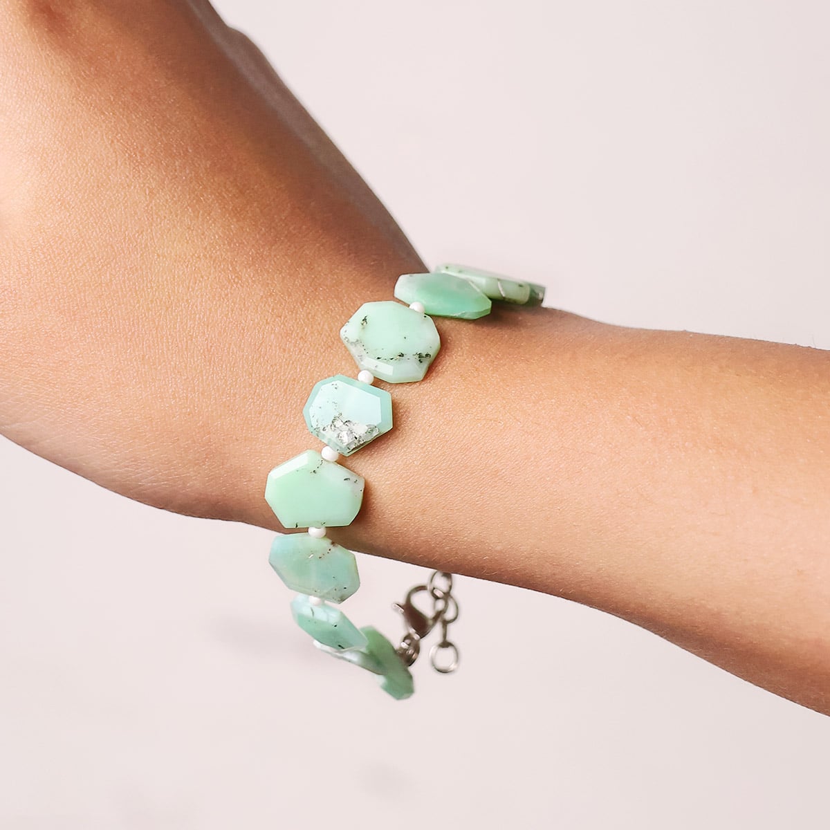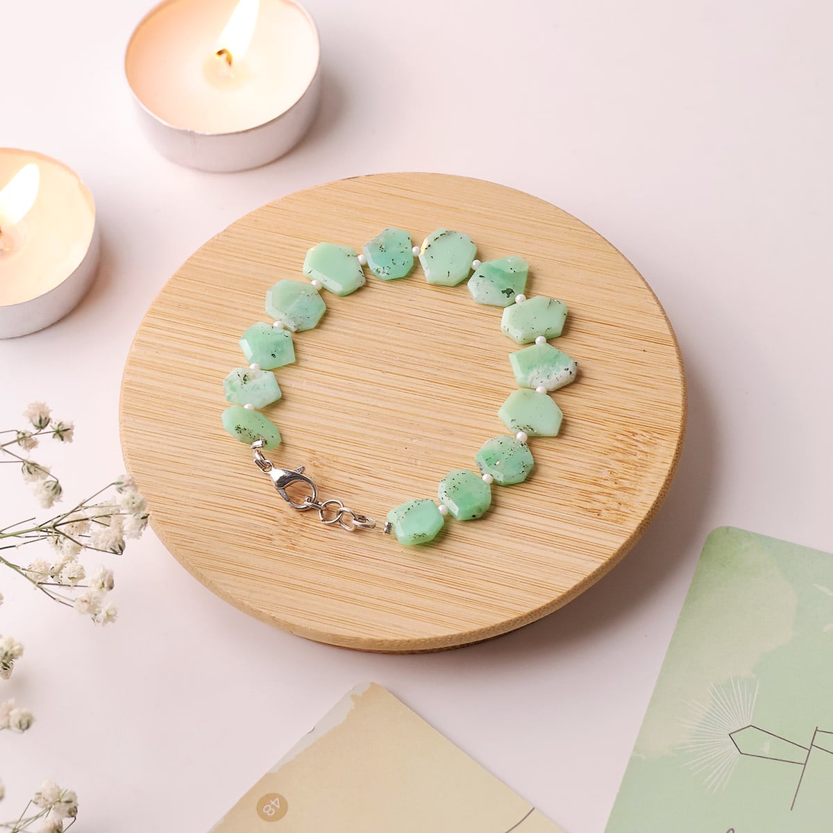 You will receive one natural Chrysoprase Hexagon Bracelet similar to the ones photographed. Images show typical quality. Each piece is unique, and natural variations in stone color, shape, and texture are expected.