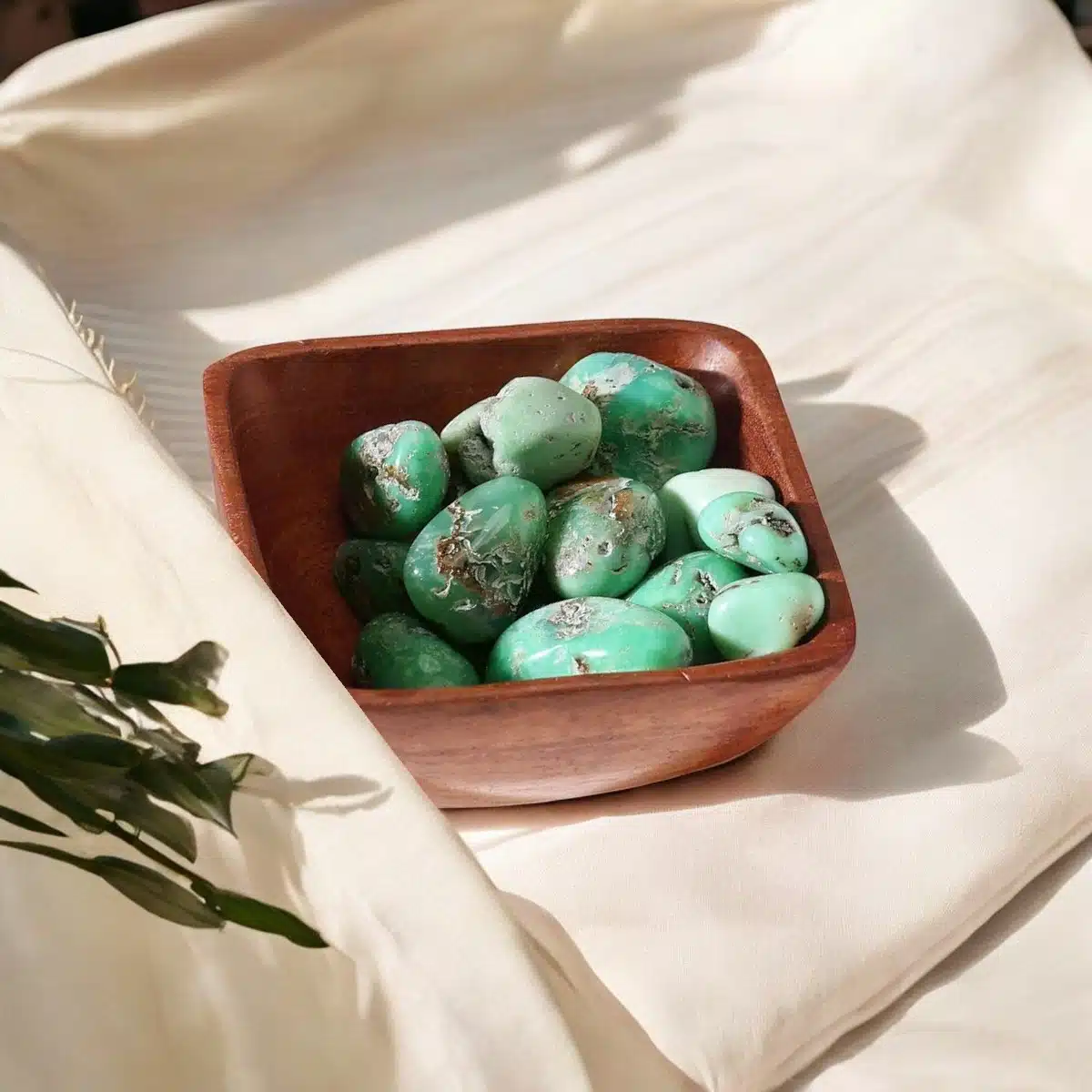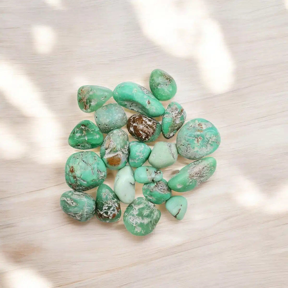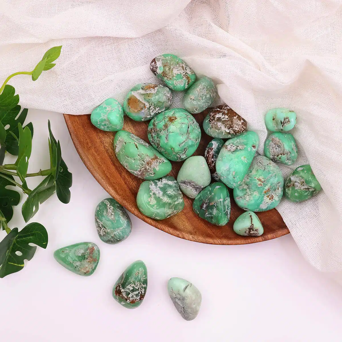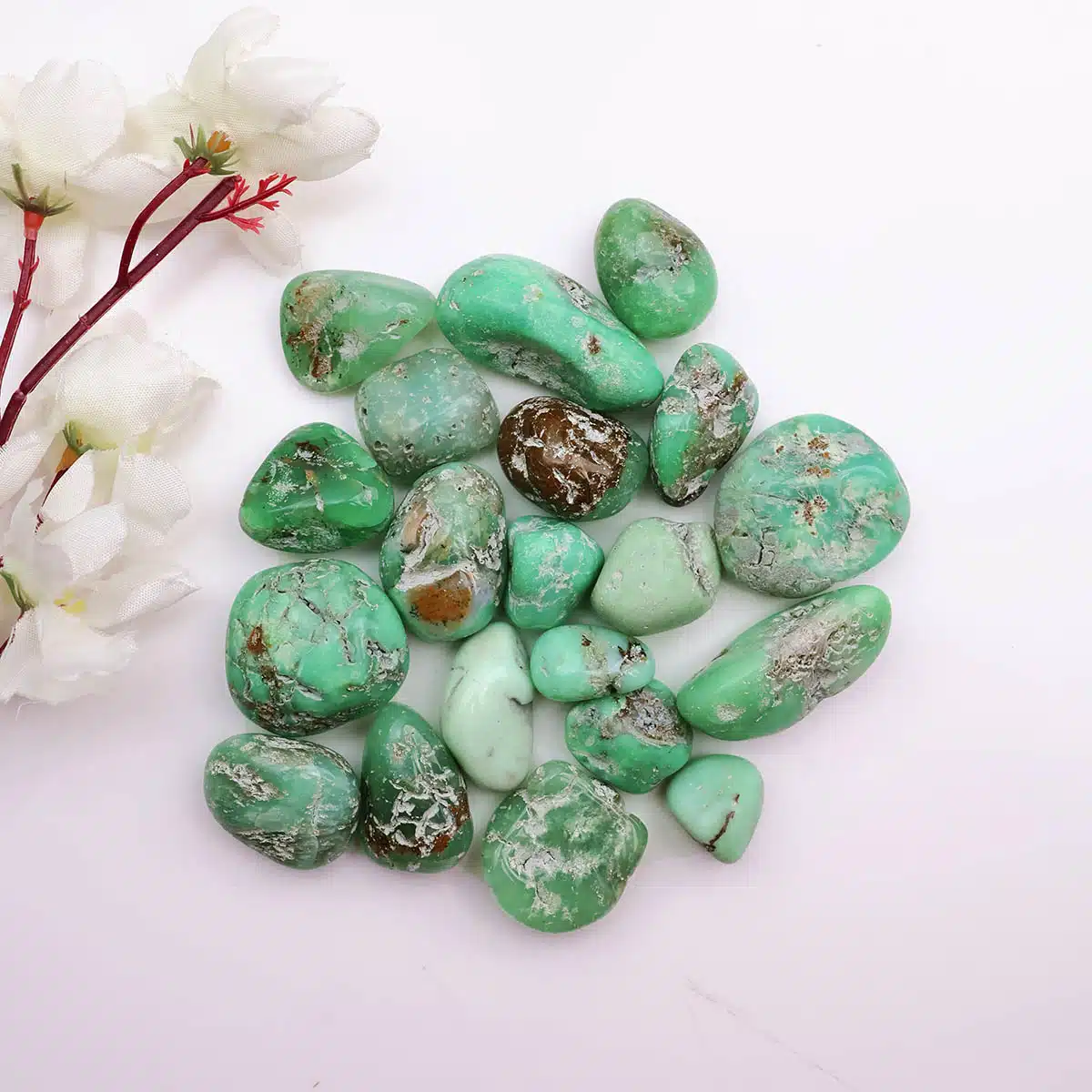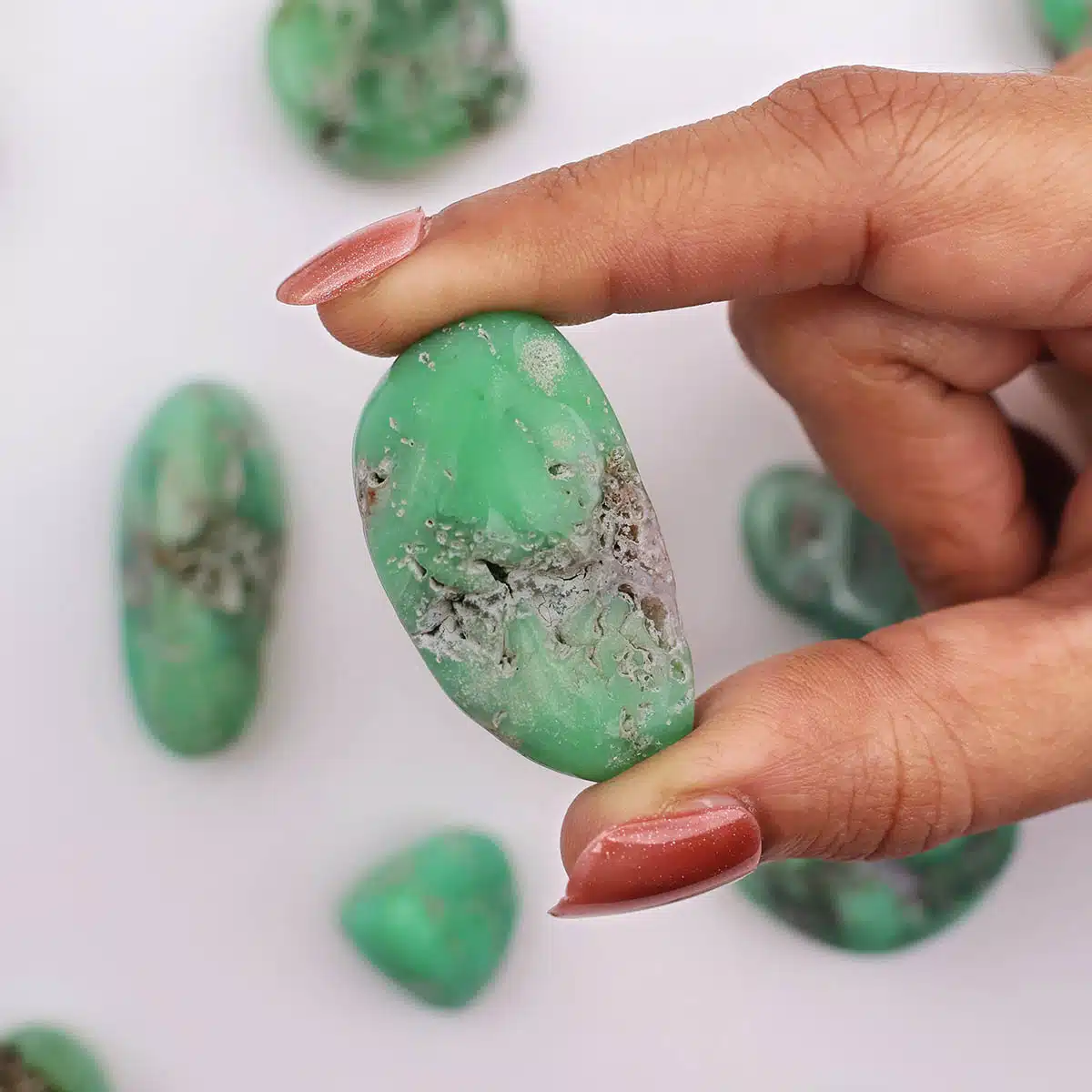 Tumble stones are a versatile shape that is all-purpose and radiates energy gently in various directions. The meaning of Chrysoprase comes from two words, chrys being the Greek for ‘gold or yellow’ and praise from the Greek for ‘leek’, referring to the green coloring of it.