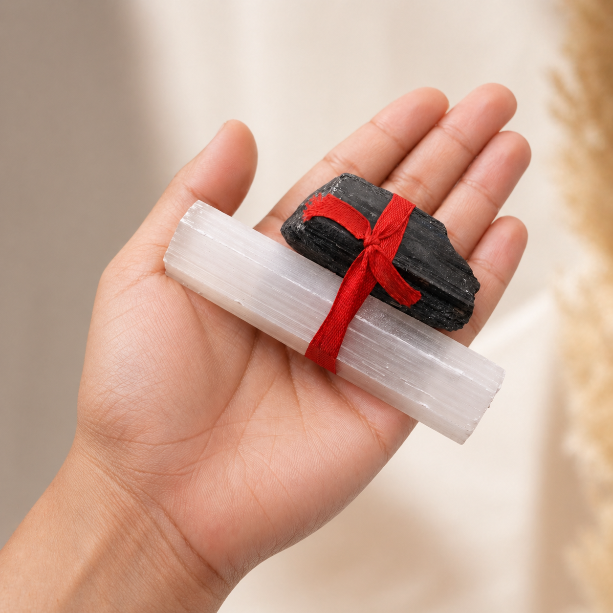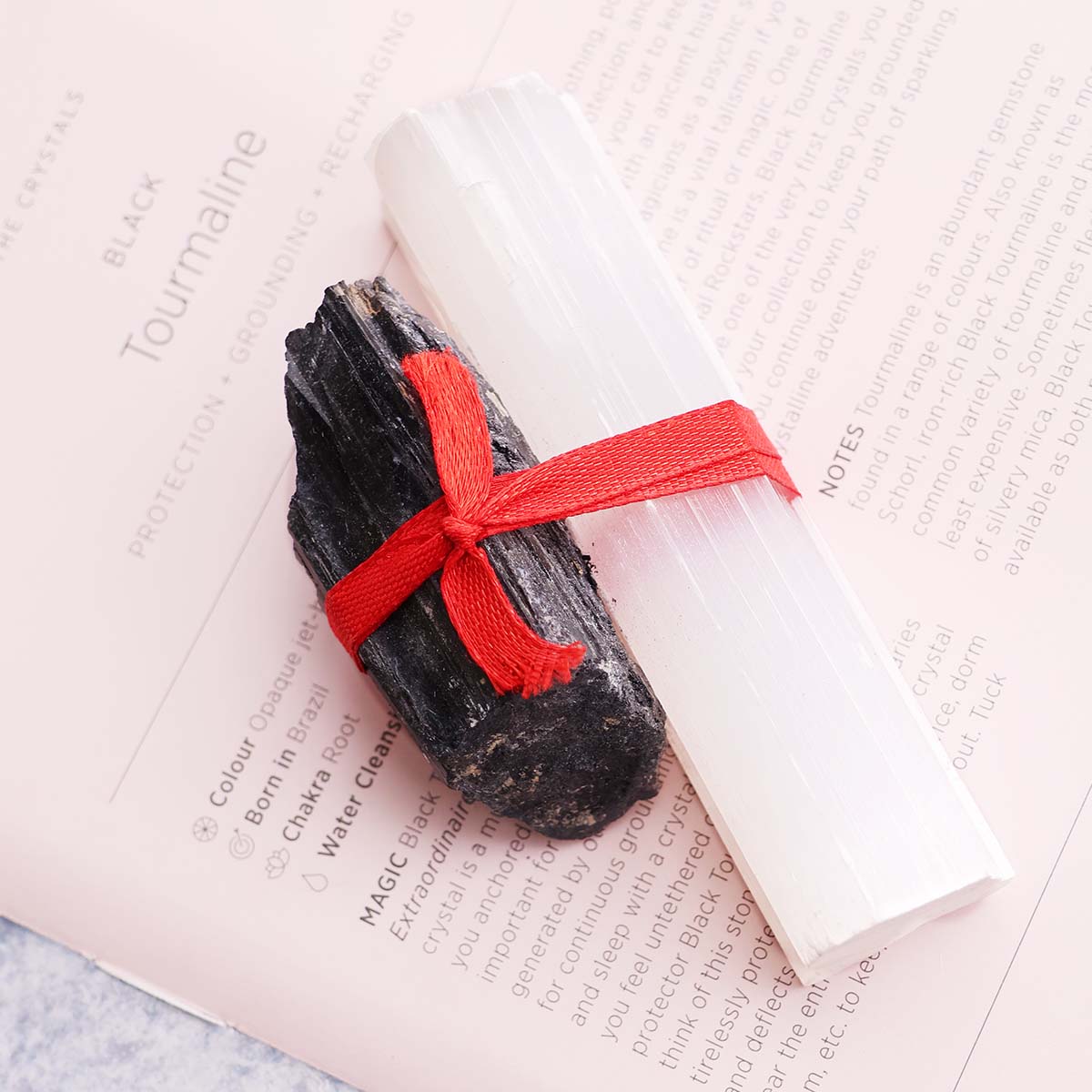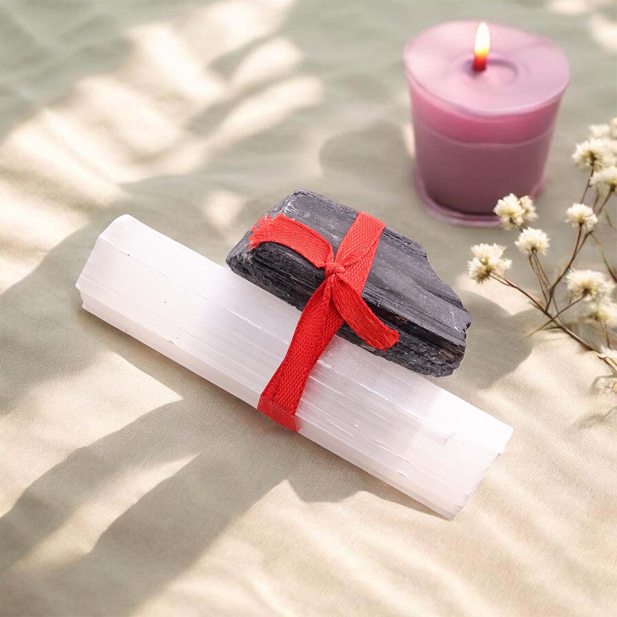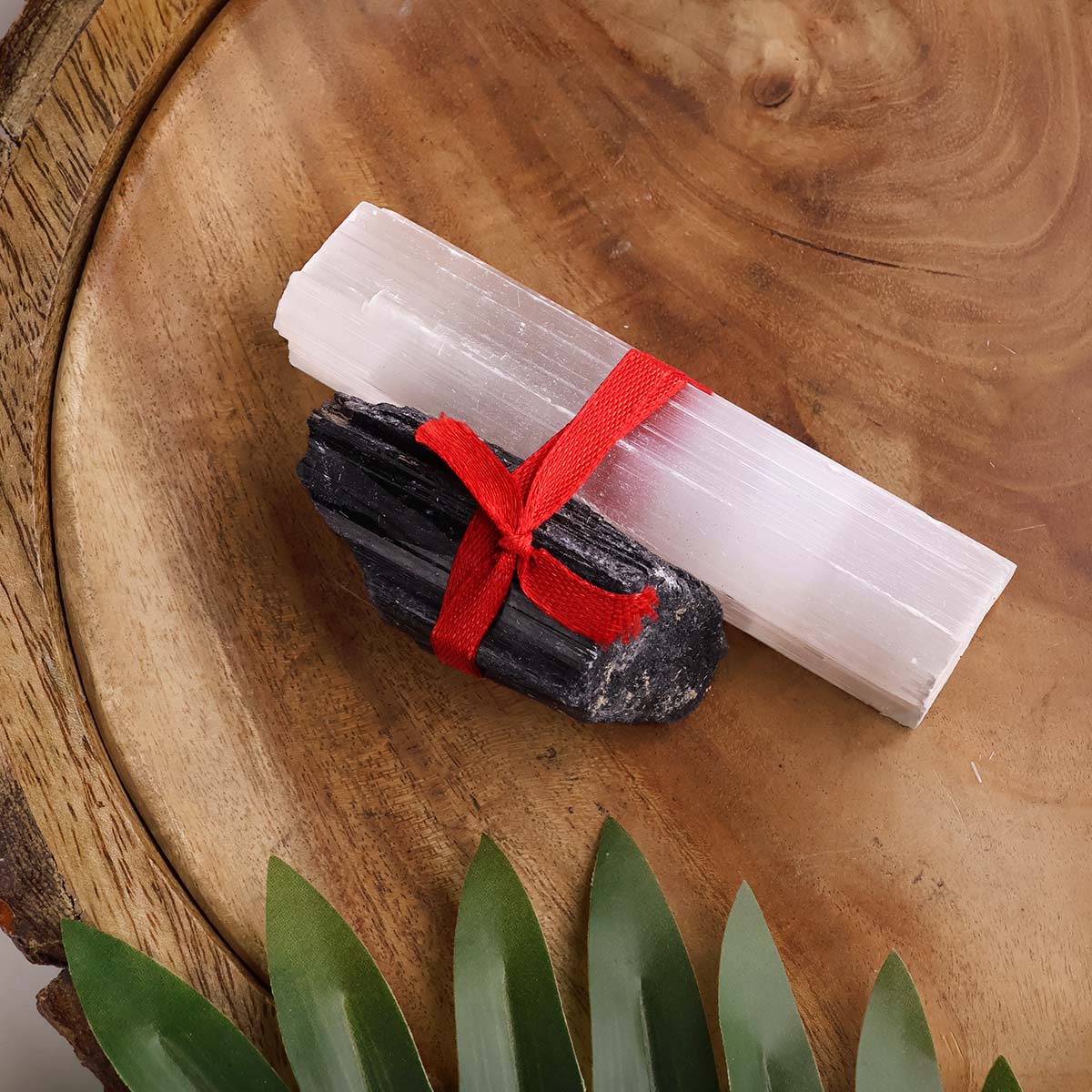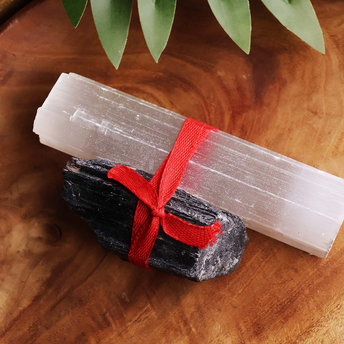 - This powerful duo combines the cleansing energy of Selenite with the protective strength of Black Tourmaline.