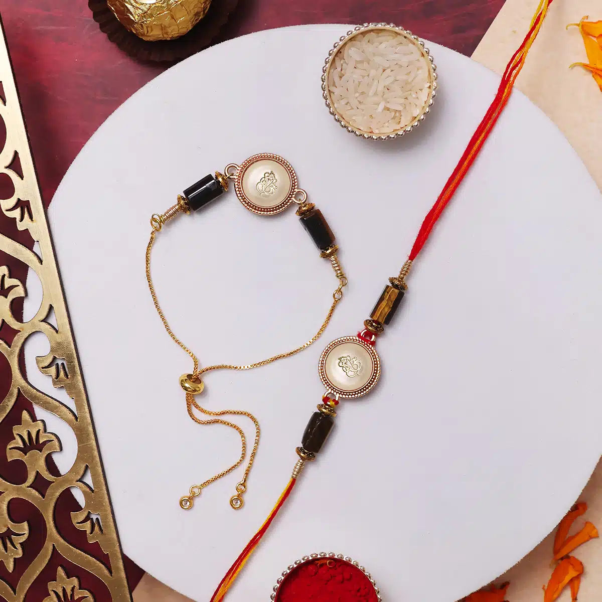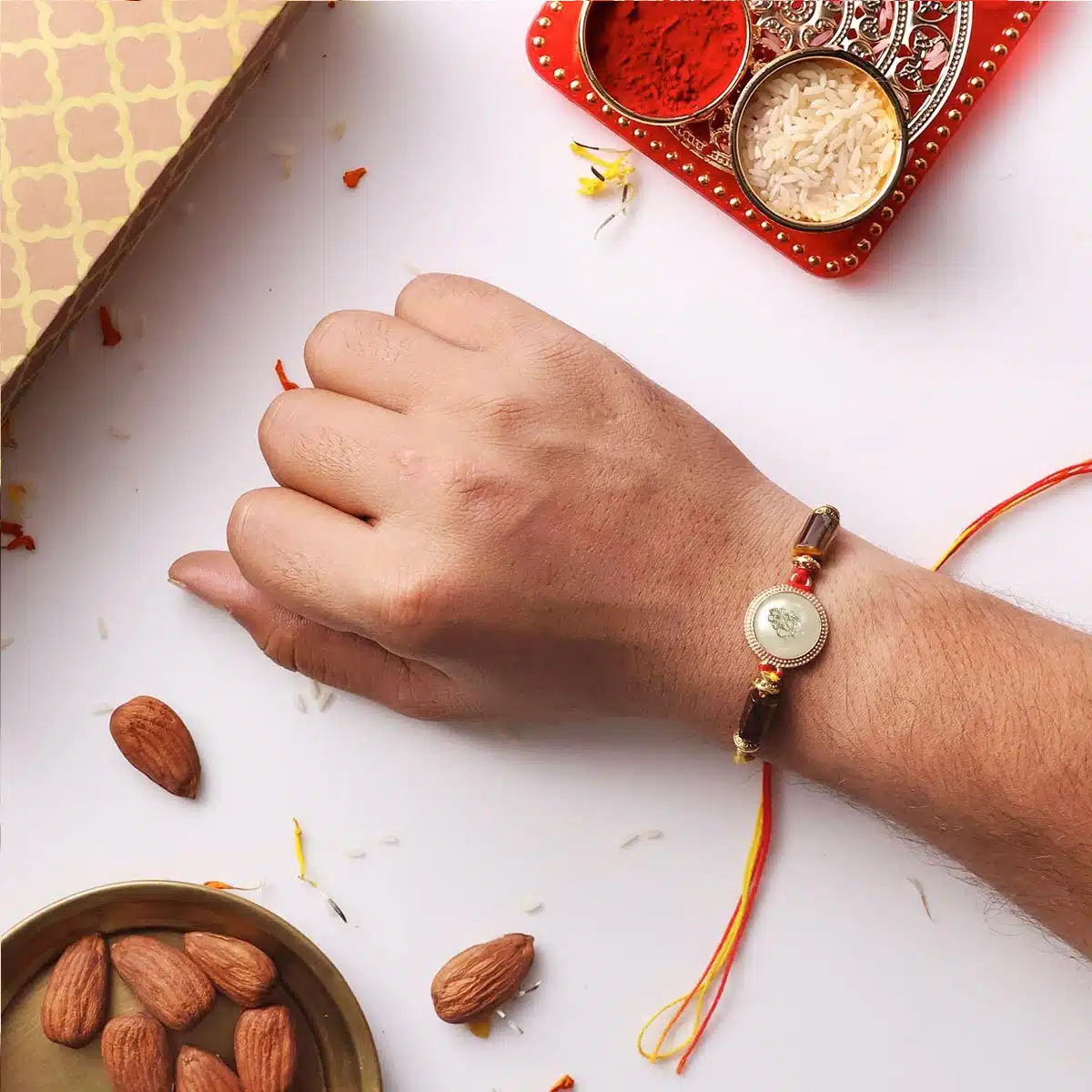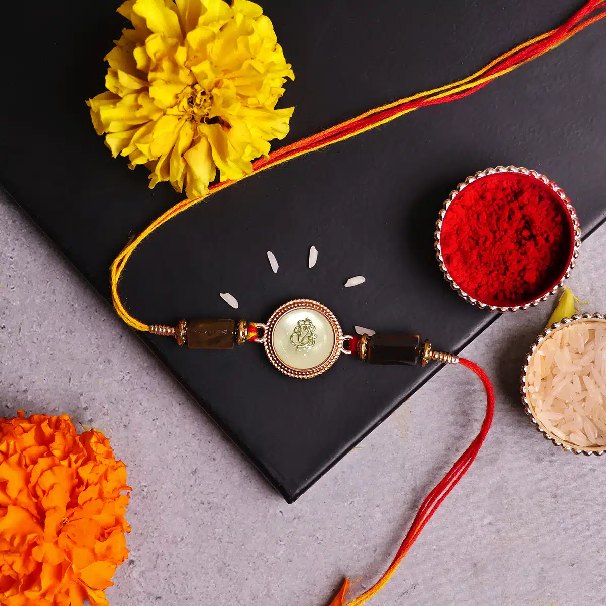 Ganesha Charm – Lord Ganesha symbolizes wisdom, good fortune, and the removal of obstacles. His divine presence in the rakhi brings spiritual blessings, success, and protection to the sibling bond.