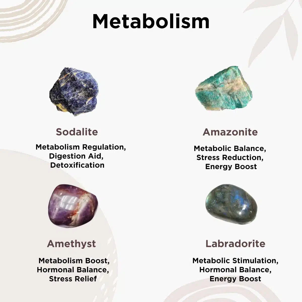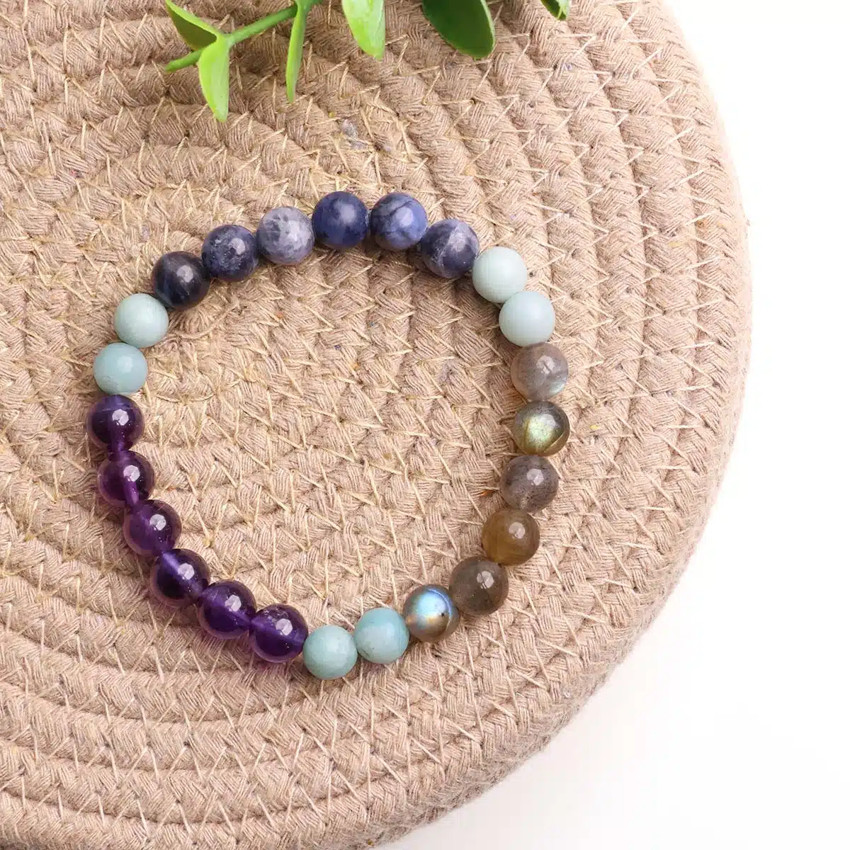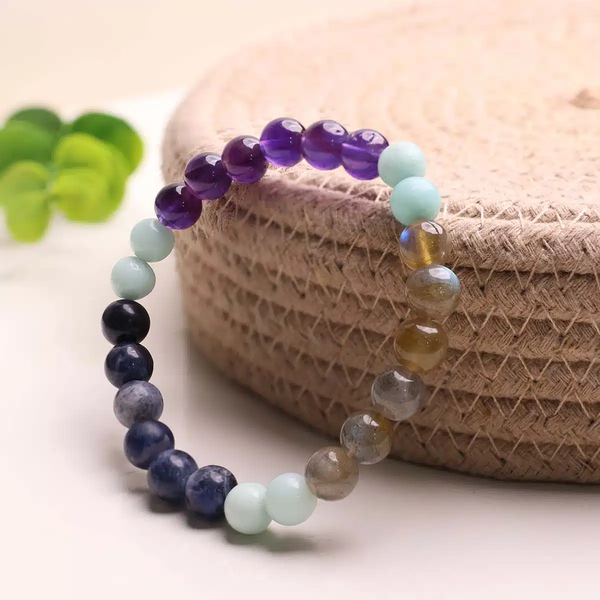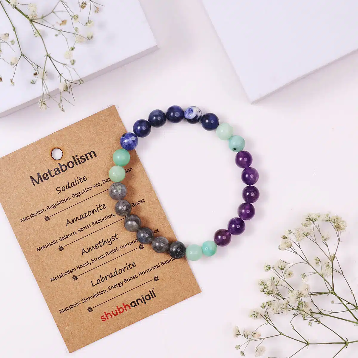 Harness the natural energies of specially selected crystals to support and enhance your metabolism. This custom-made bracelet combines the harmonious properties of Sodalite, Amazonite, Amethyst, and Labradorite, each chosen for their unique benefits.