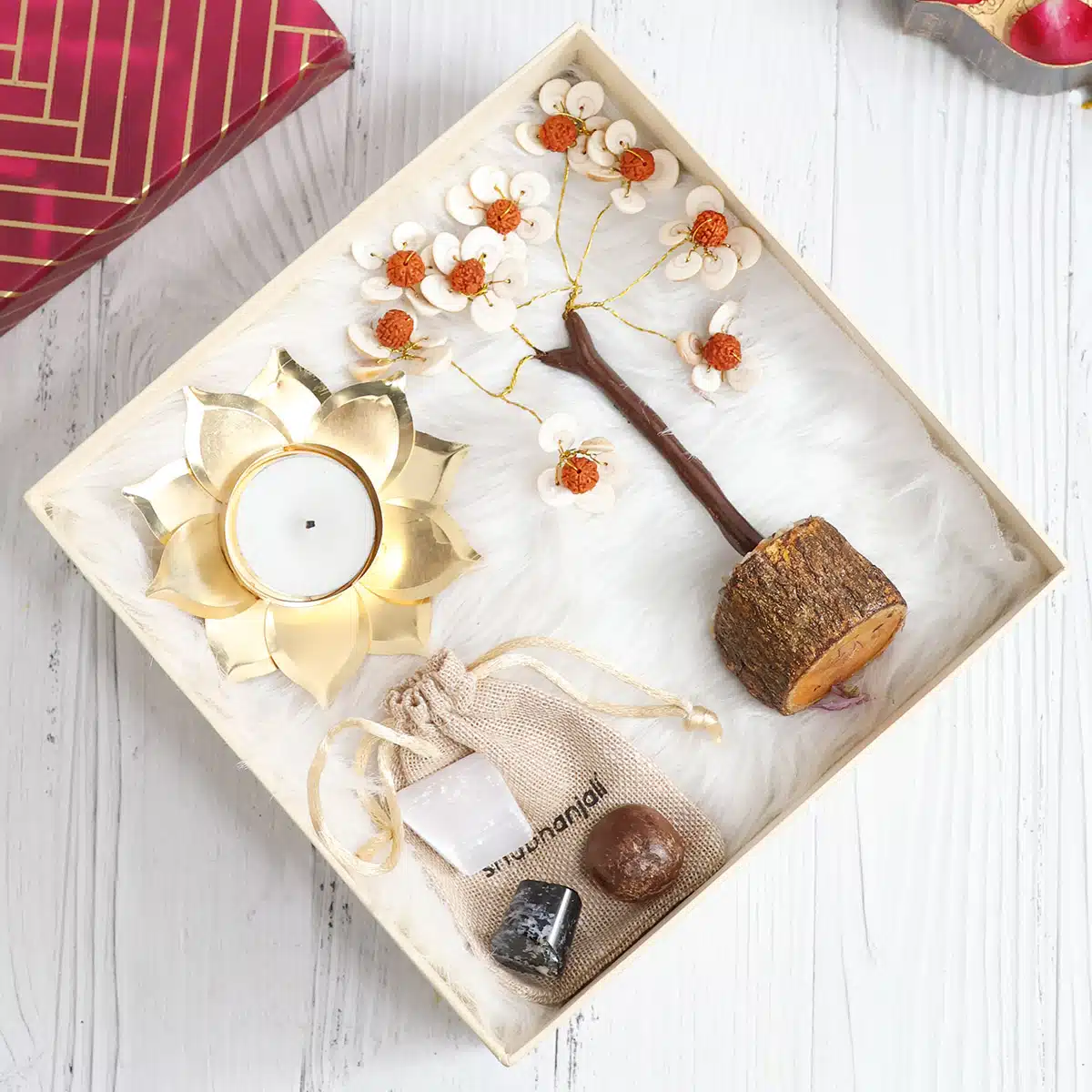 Elevate your Diwali celebrations with our enchanting Diwali Combo Box, featuring a Gomti Rudraksha Tree, an exquisite Metal Lotus Candle Holder Diya, and a Protection Tumble Kit with Potli. The Gomti Rudraksha Tree symbolizes divine blessings, while the Lotus Candle Holder Diya adds an elegant touch of spirituality. The Protection Tumble Kit with Potli brings a blend of protective stones, creating a unique fusion of aesthetics and spiritual significance. This combo is more than just a collection; it’s a conduit for seeking blessings, protection, and the serene light of Diwali. Embrace this special offering, a perfect gift for yourself or your loved ones, and let it illuminate your celebrations with positivity and safeguard your home with divine energy. Experience the magic of the Festival of Lights like never before with our Diwali Combo Box.