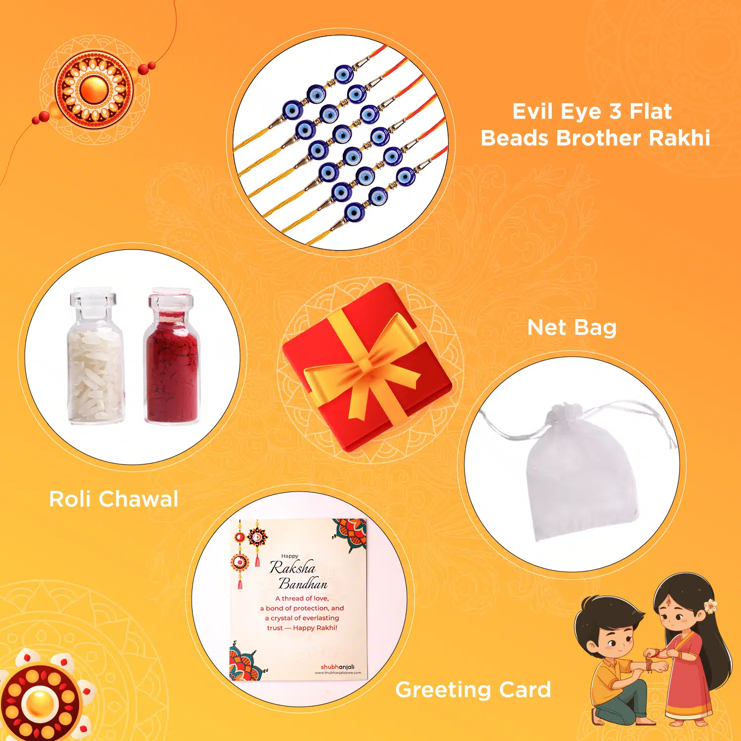 - With Box – Rakhi, Chawal-Kumkum, 2 chocolate coins, and a Rakhi card packed in a festive gift box.