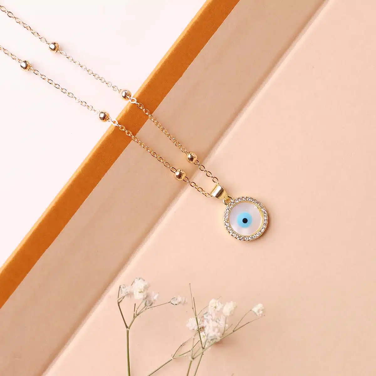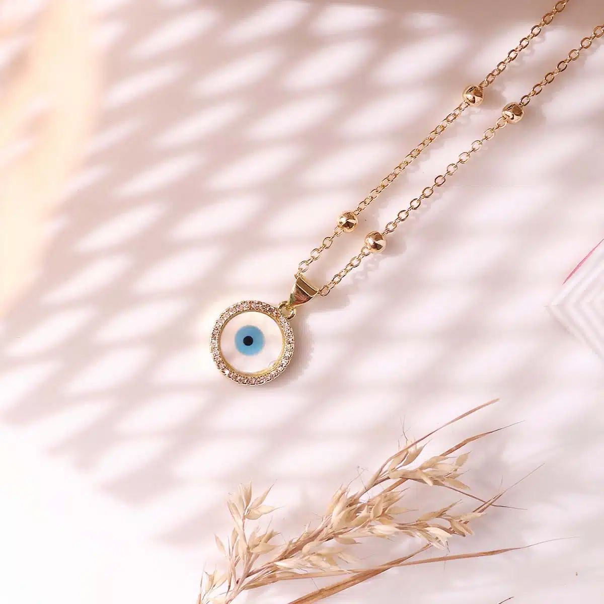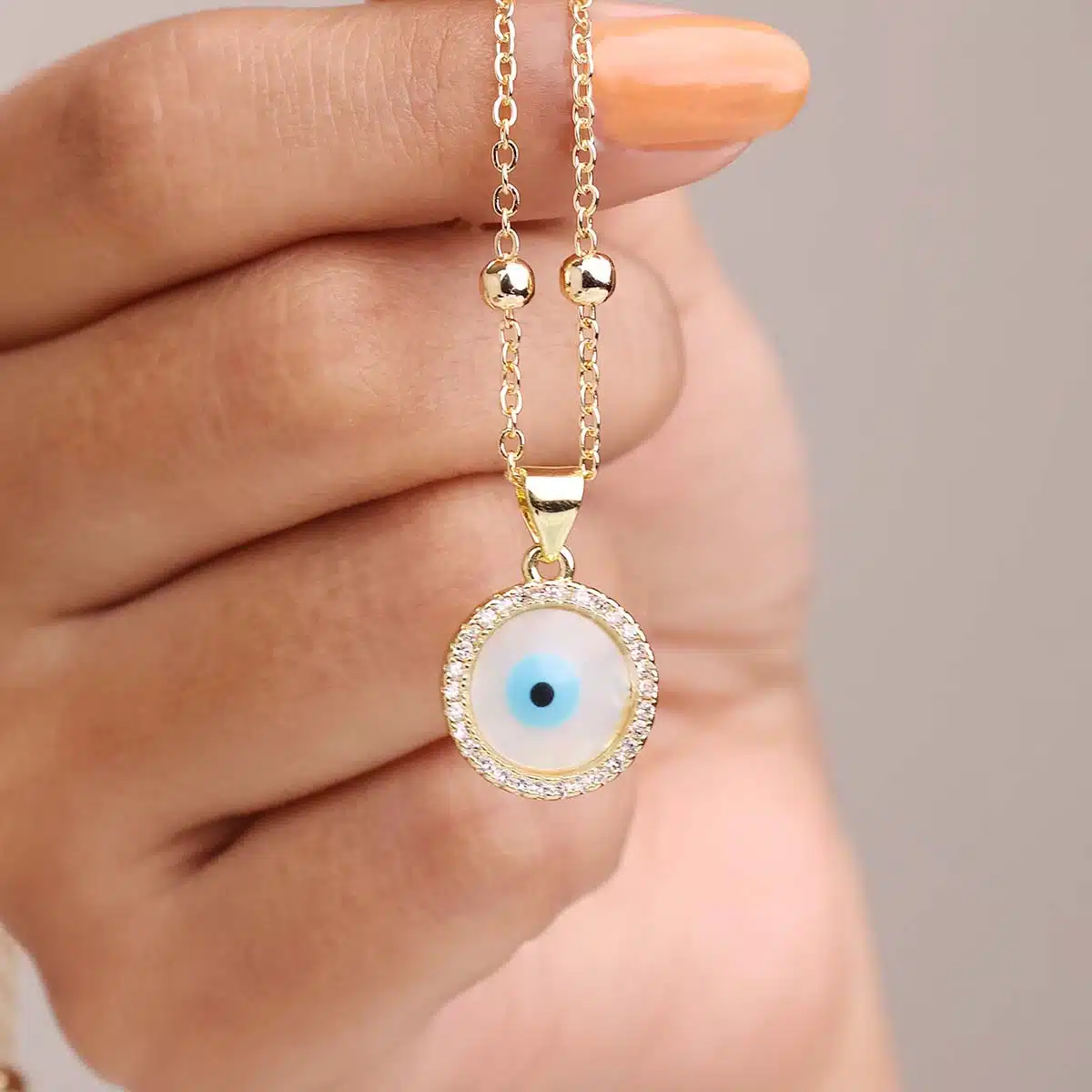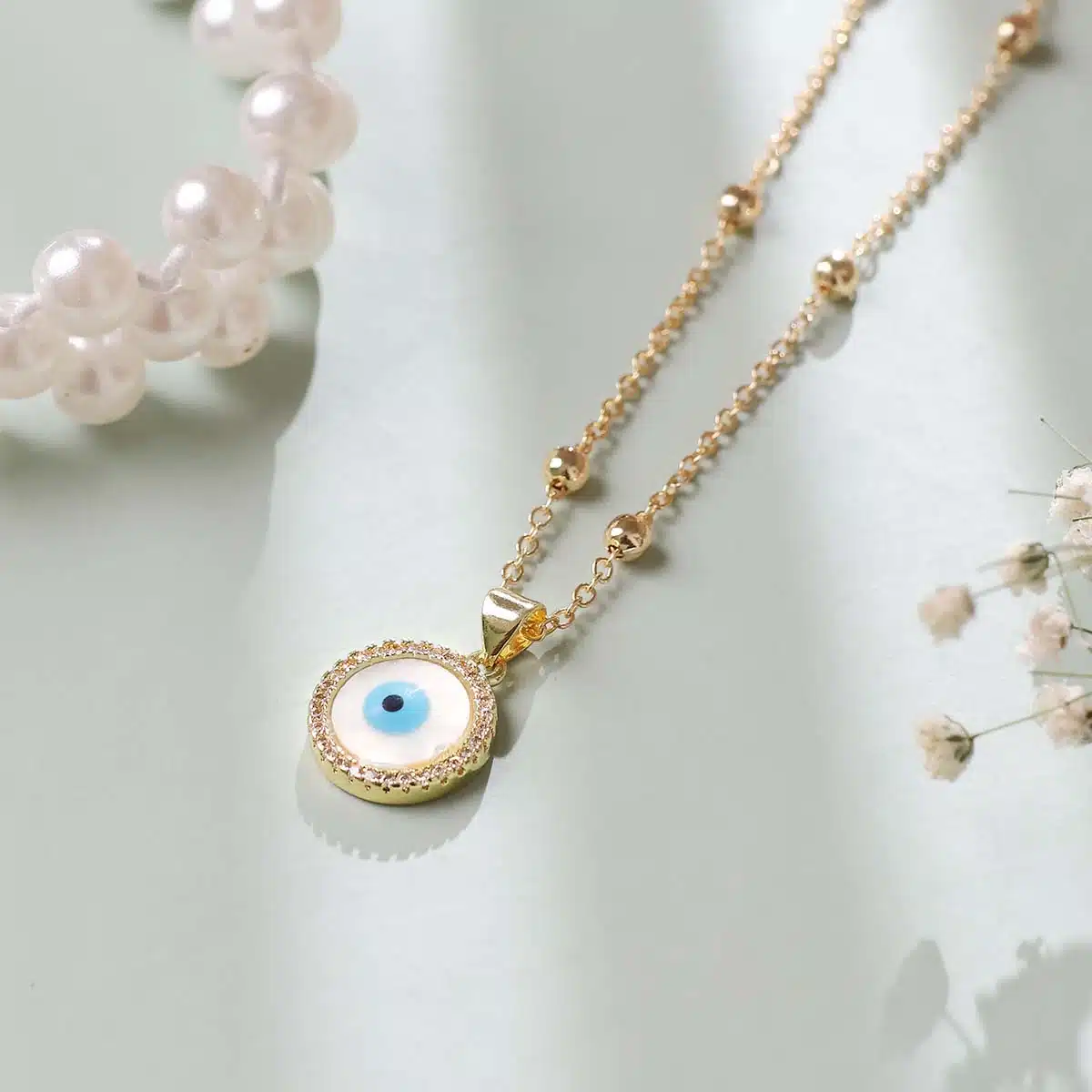 Benefits of Evil Eye Mother of Pearl Round Charm Pendant with Gold Chain: