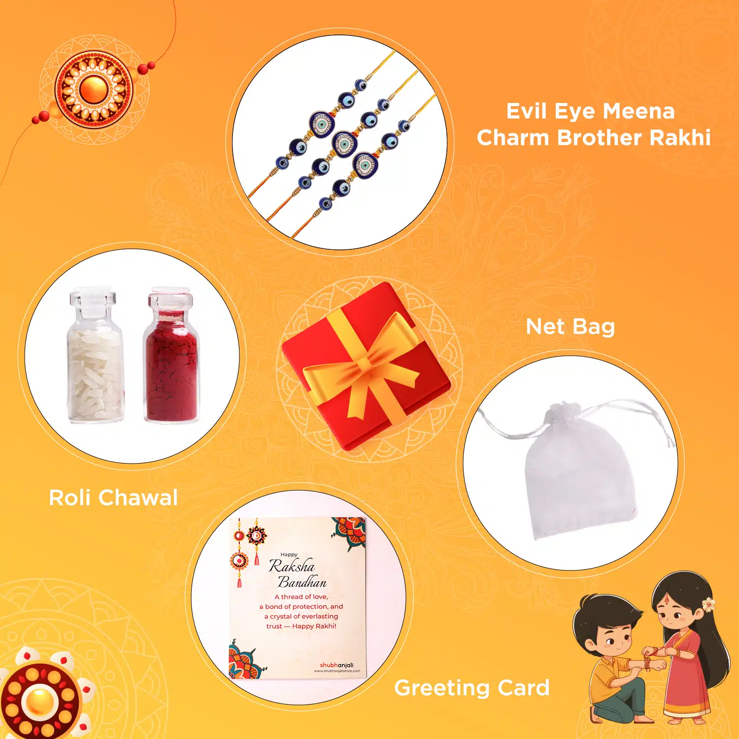 - With Box – Rakhi, Chawal-Kumkum, 2 chocolate coins, and a Rakhi card packed in a festive gift box.
