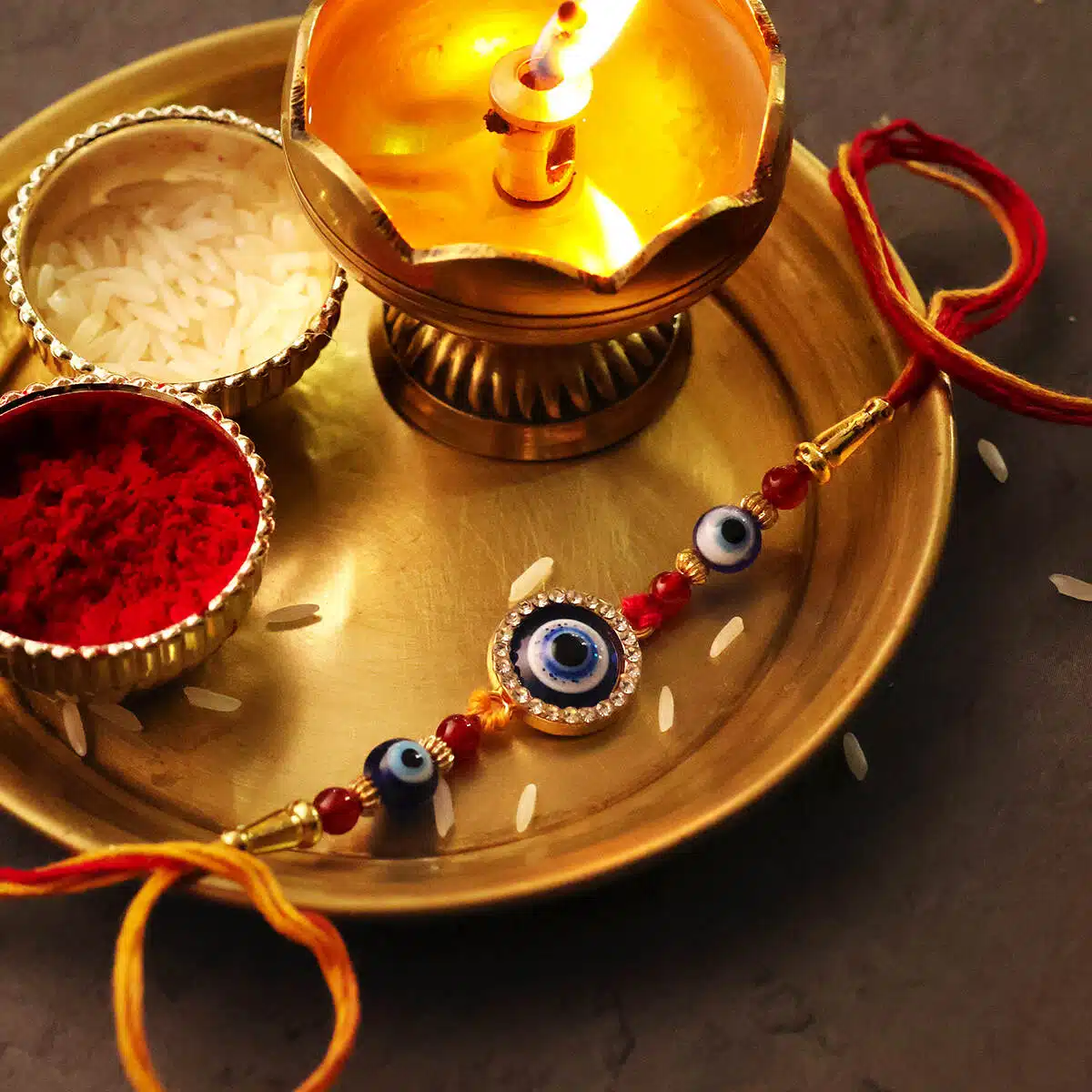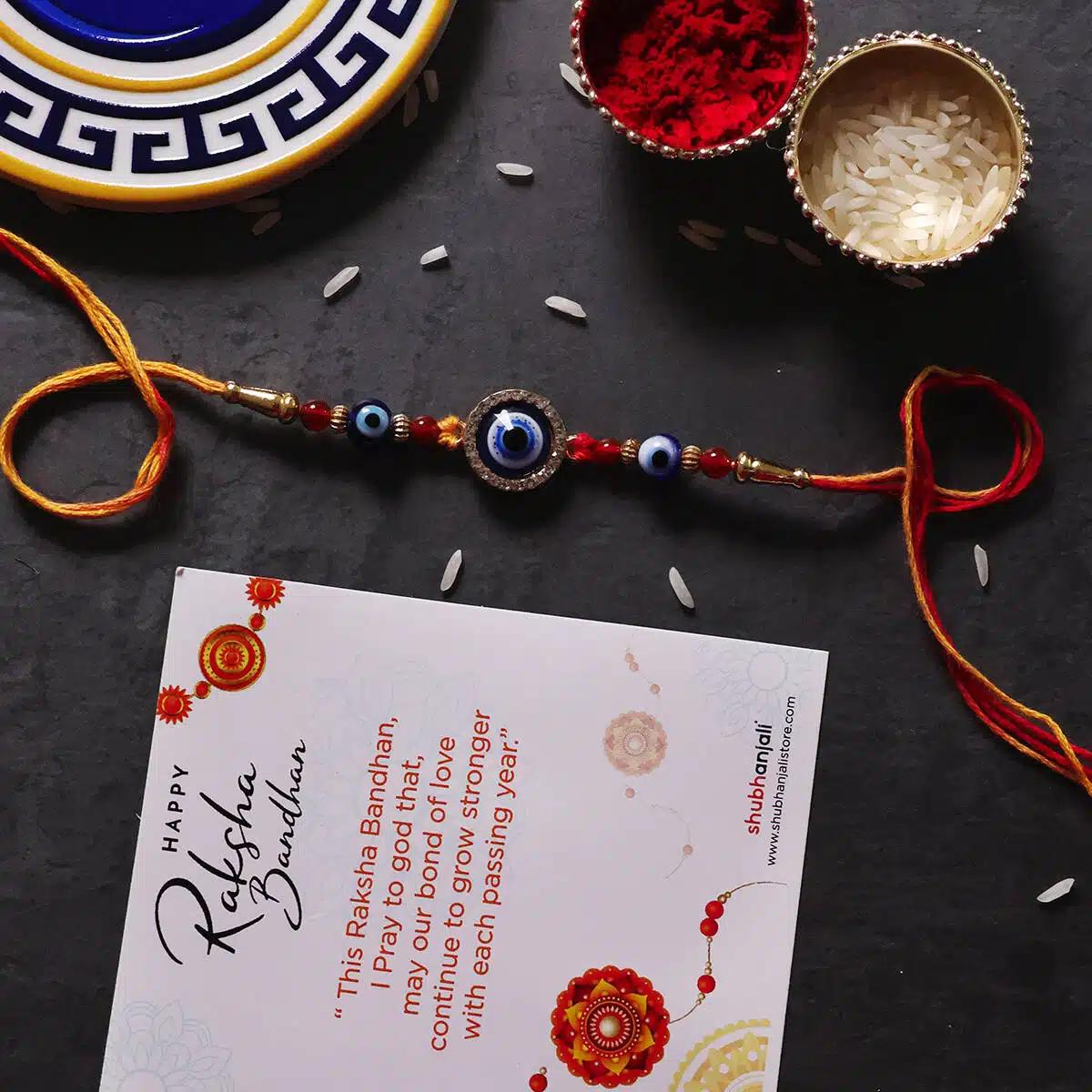 Diamond Evil Eye Round | Evil Eye 4 mm, 4 Beads | Red Onyx 4 mm, 4 Beads | Adjustable Rakhi | Evil Eye beads handcrafted Rakhi