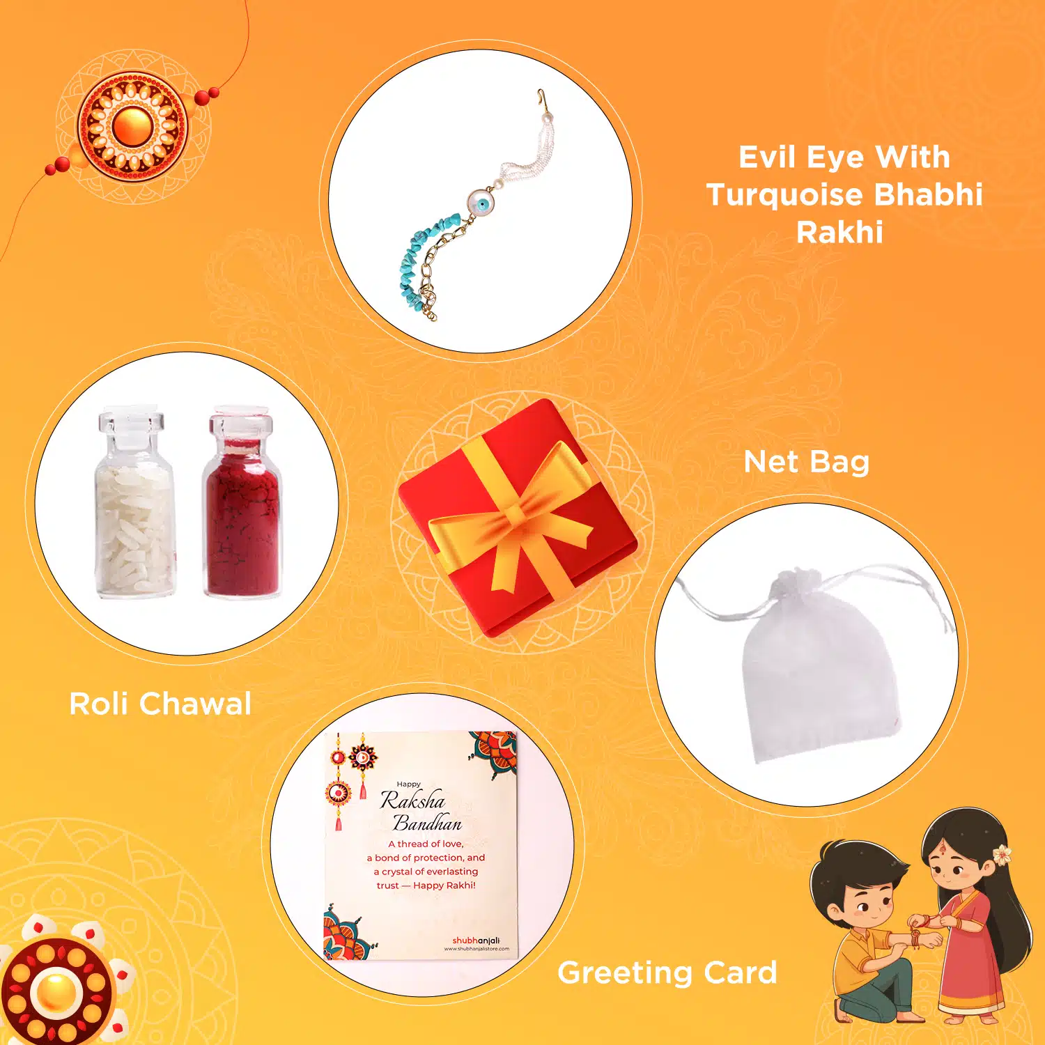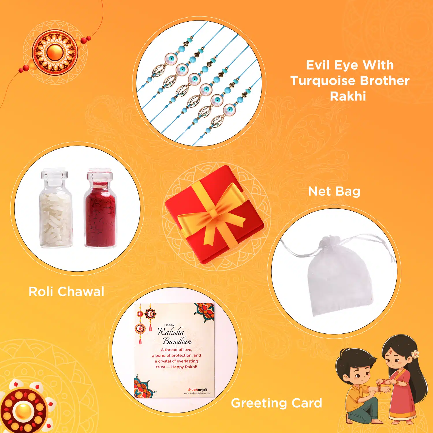 - With Box – Rakhi, Chawal-Kumkum, 2 chocolate coins, and a Rakhi card packed in a festive gift box.
