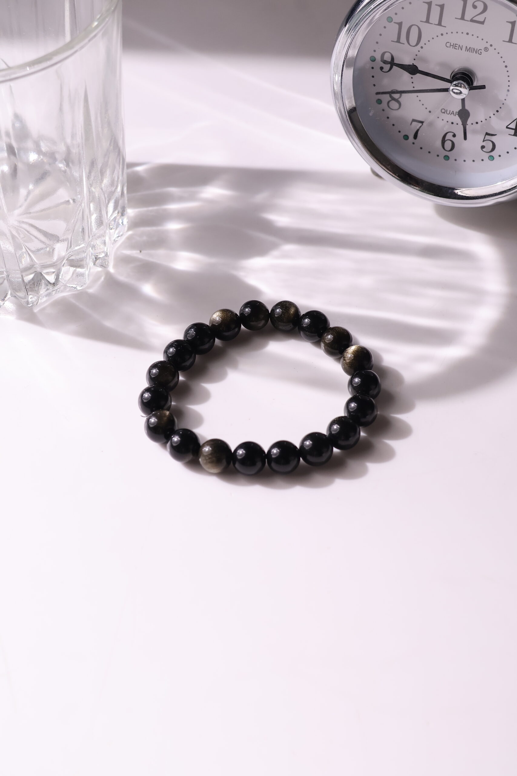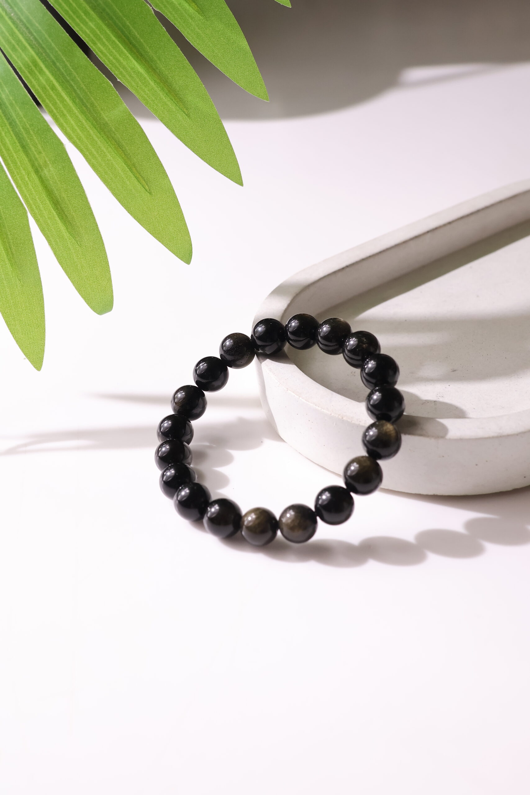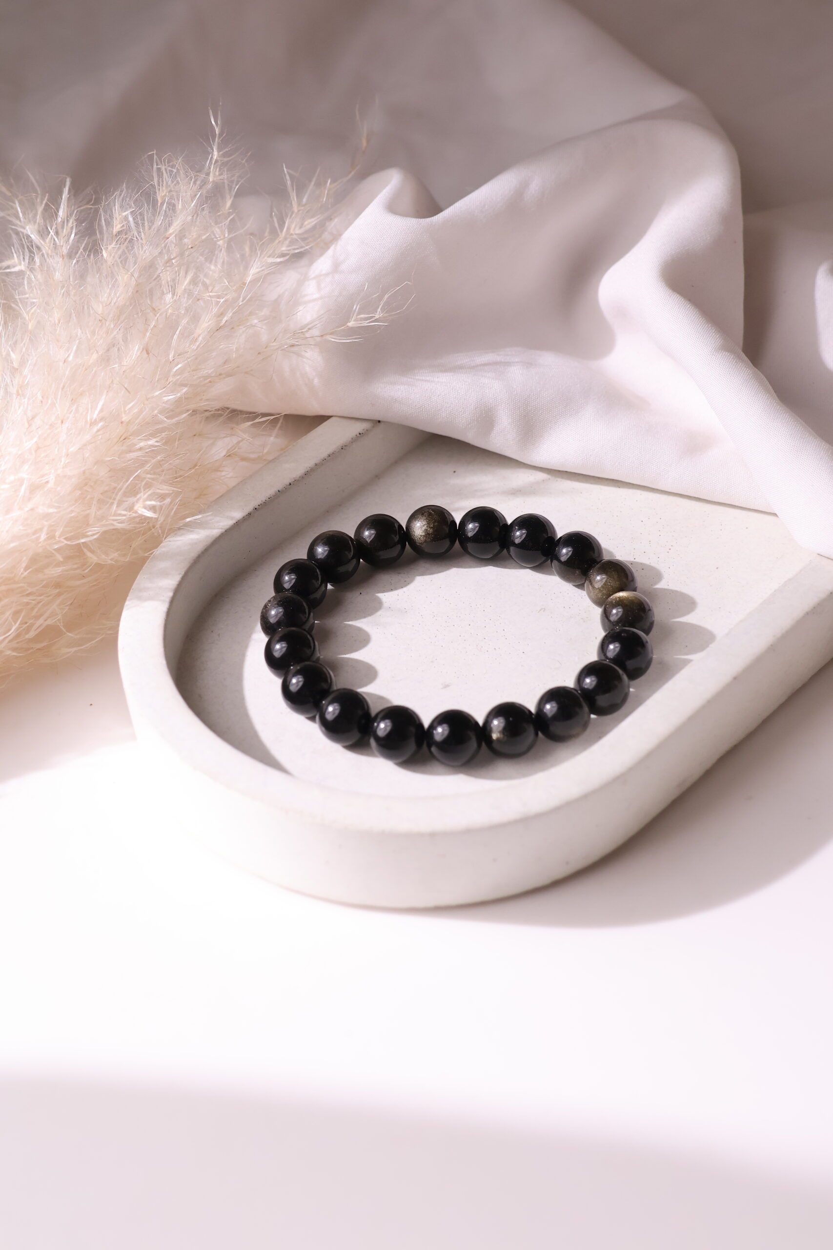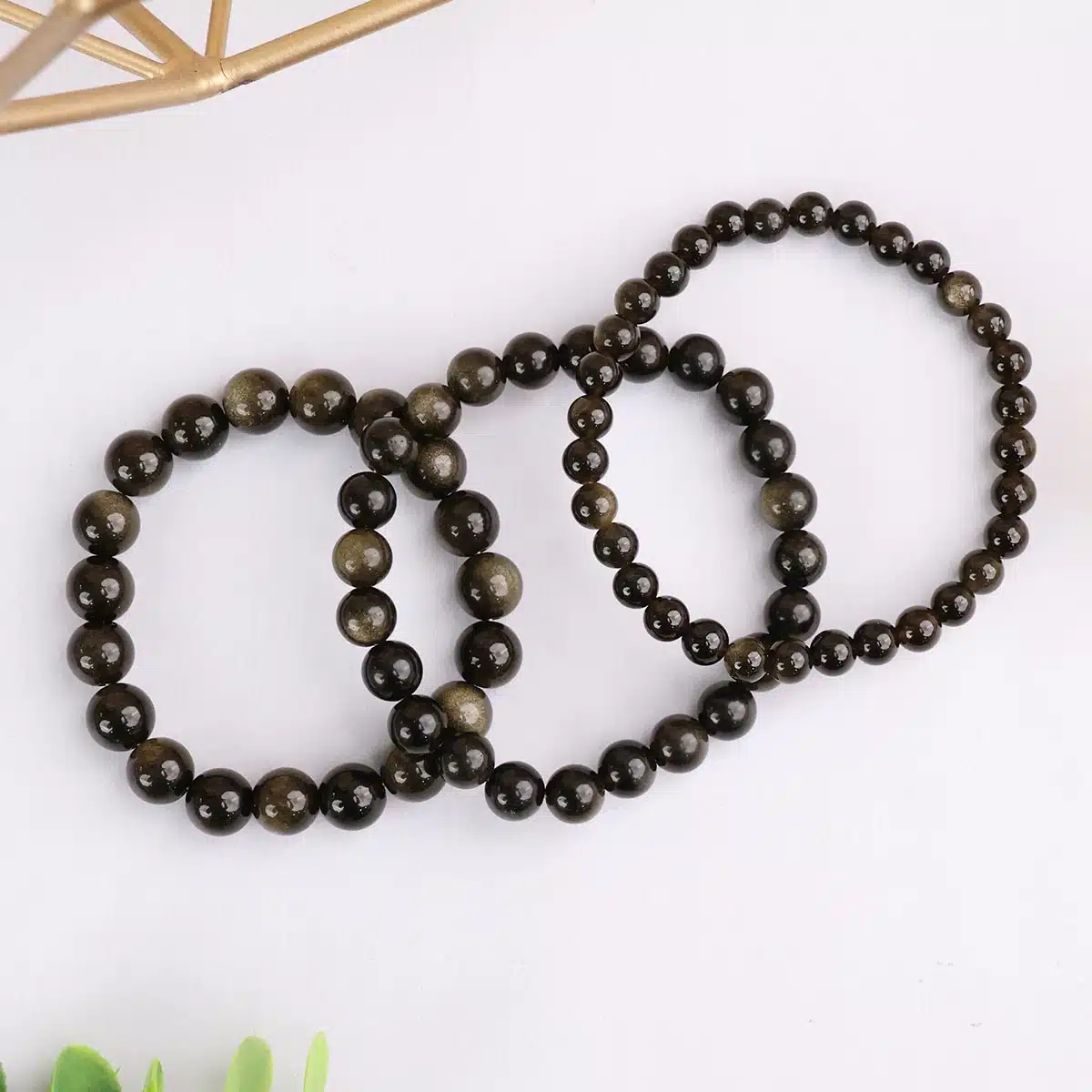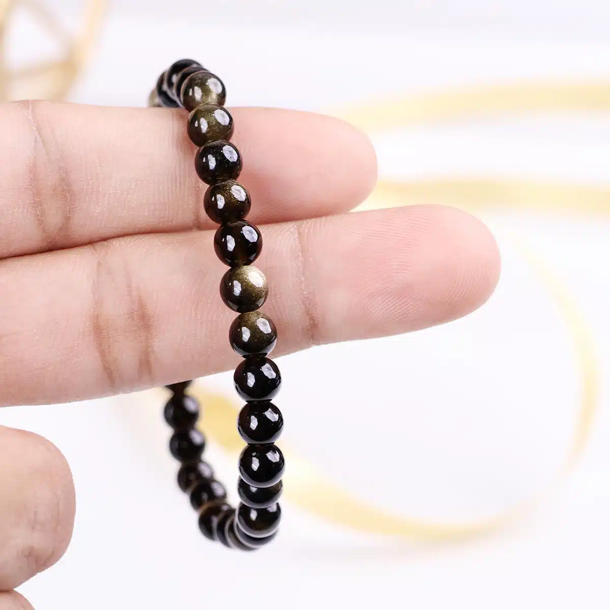 Golden Sheen Obsidian bracelet Crystal jewellery. Gold Sheen Obsidian is formed when patterns of gas bubbles are aligned along layers created by the flowing lava before it solidified. Gold Sheen obsidian is a powerful stone assisting in grounding the soul. It is also used to bring shadow qualities to the surface for release further assisting growth of the soul.