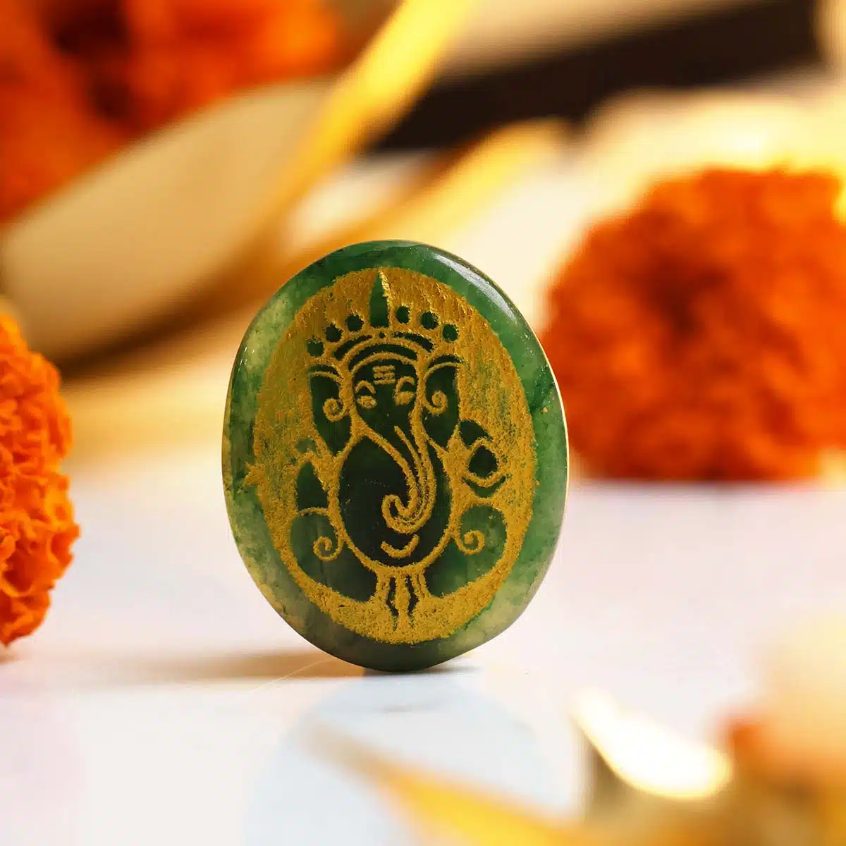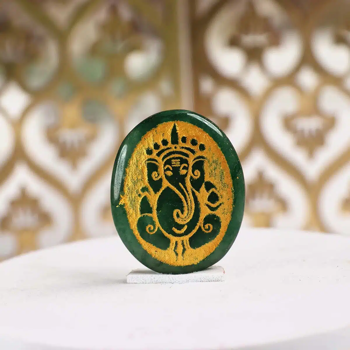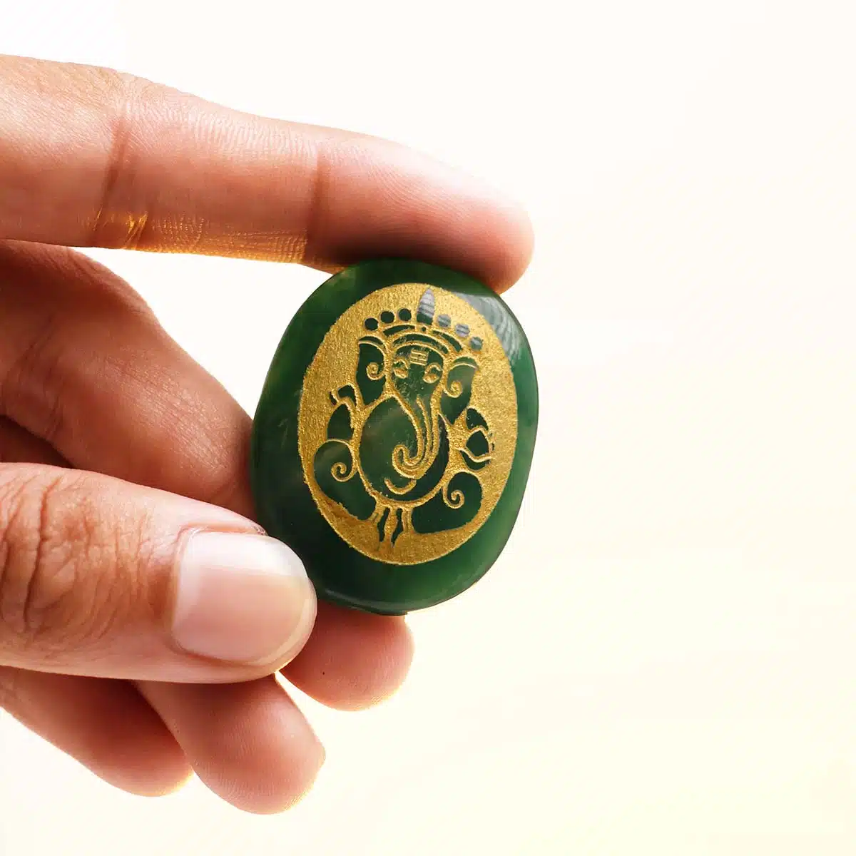 Green Jade Oval Ganesha Painted Engrave