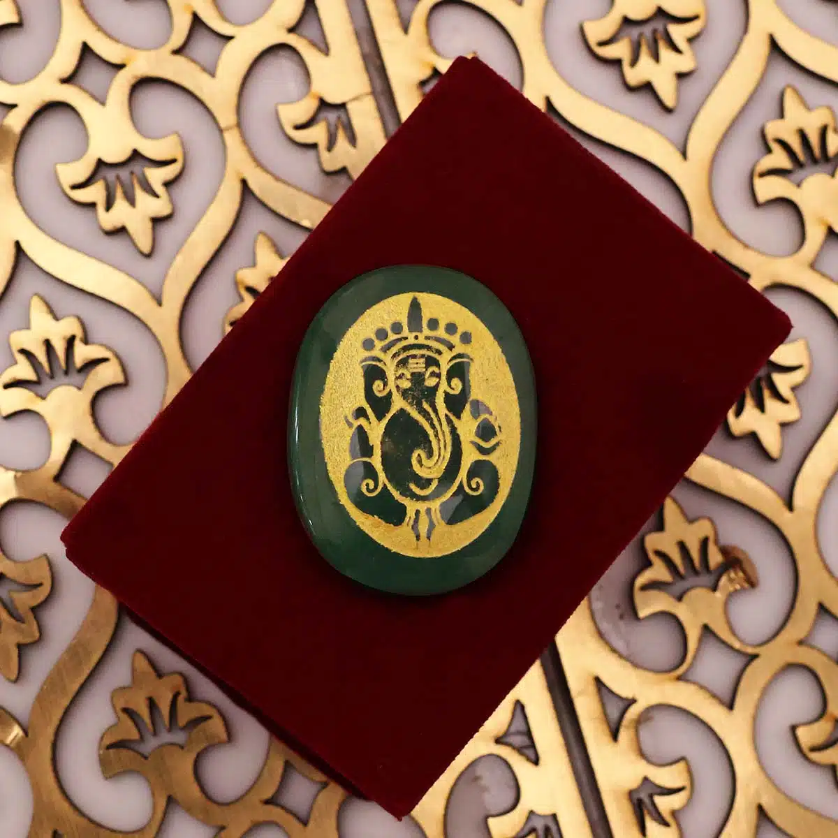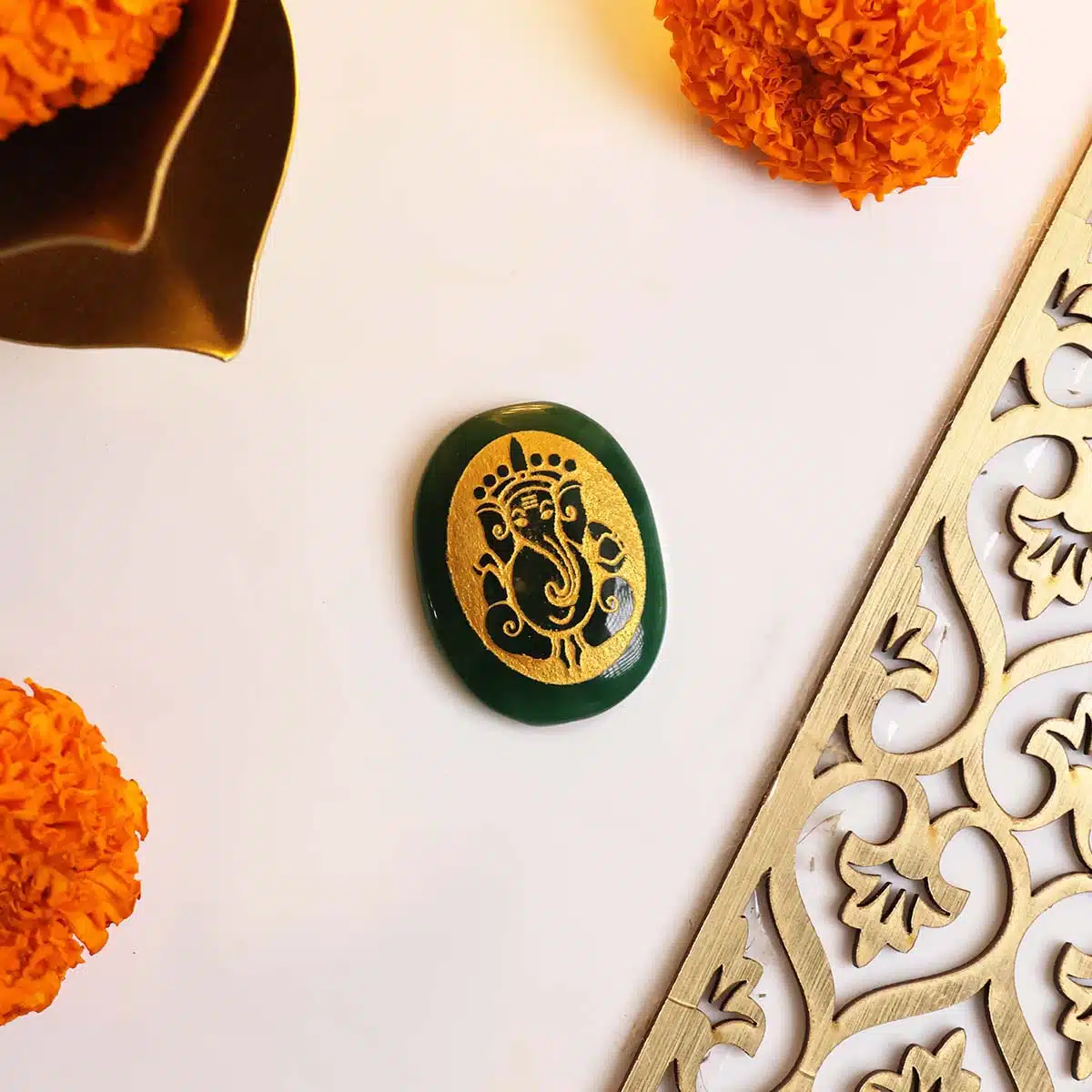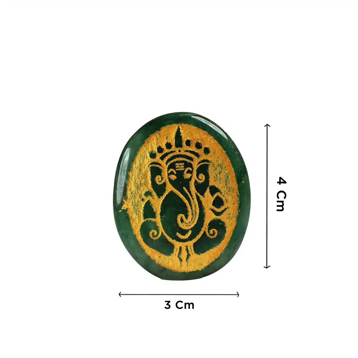 Adorned with a stunning Ganesha engraving, this Green Jade Oval is a mesmerizing symbol of spiritual harmony, prosperity, and protection.