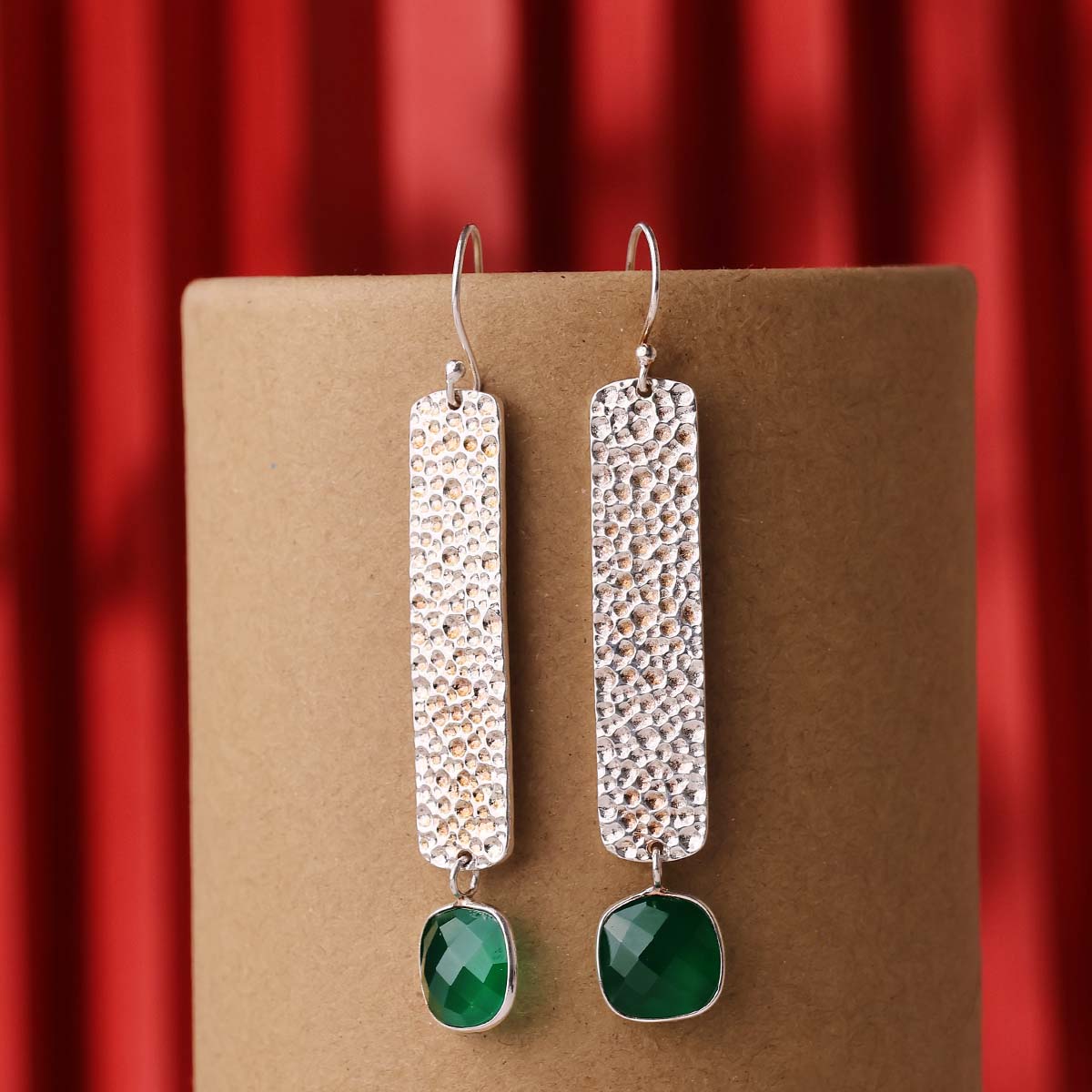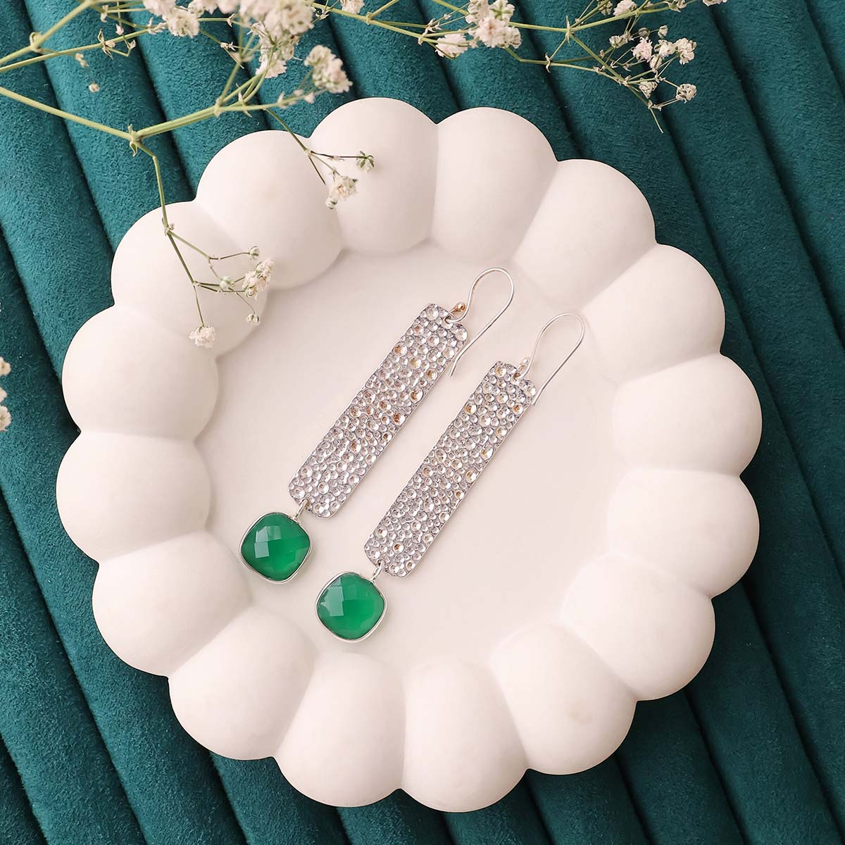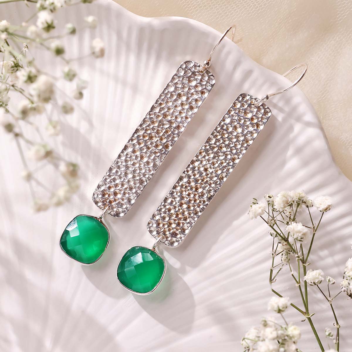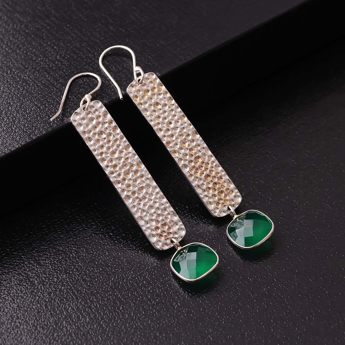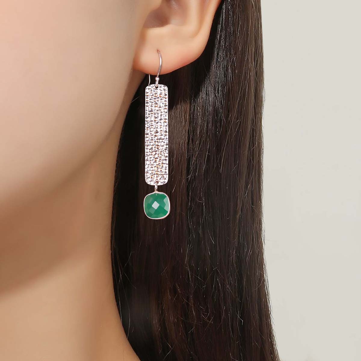 You will receive one green onyx square hanging silver earring similar to the one photographed. Images represent typical quality. As Green Onyx is a natural stone, each piece is unique and may vary slightly in color, shape, weight, and size due to its natural characteristics.