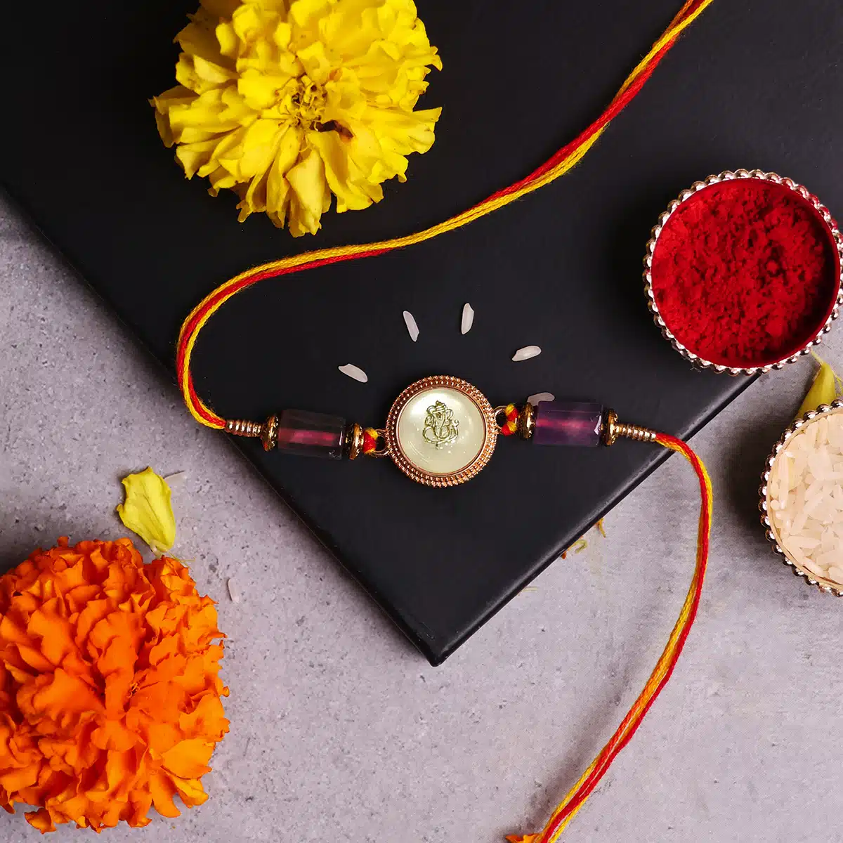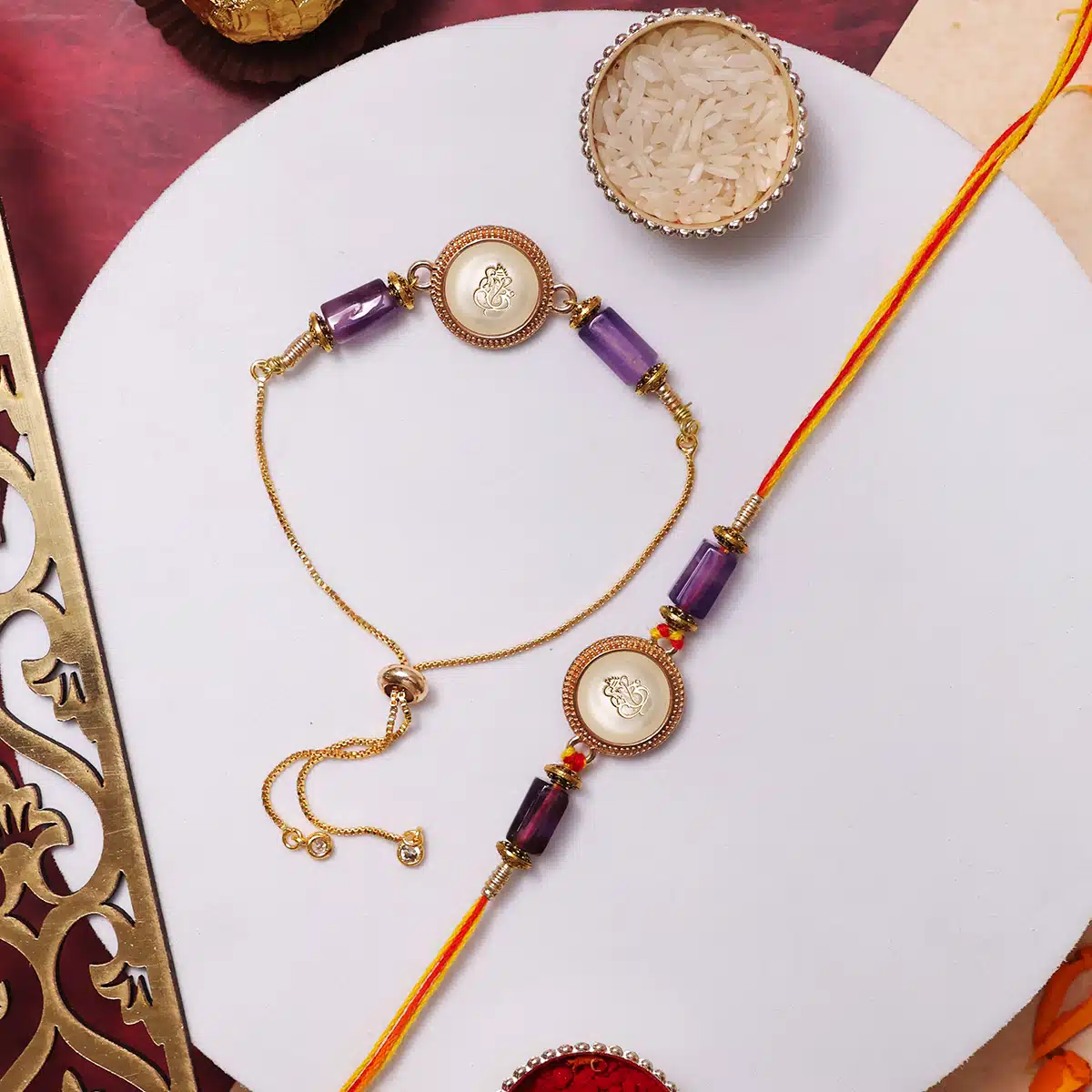 Ganesha Charm – Lord Ganesha, the remover of obstacles and granter of wisdom, brings divine blessings, protection, and success. His presence on the rakhi strengthens spiritual connection and ensures harmony in your loved ones’ lives.
