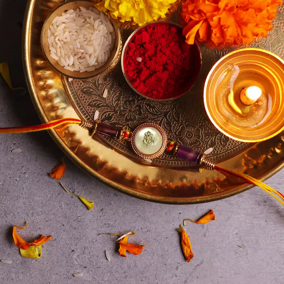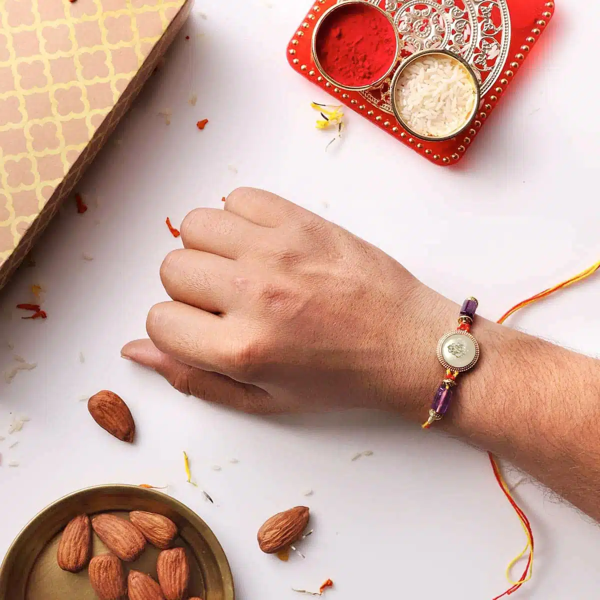 - With Box – Rakhi, Chawal-Kumkum, 2 chocolate coins, and a Rakhi card packed in a festive gift box.