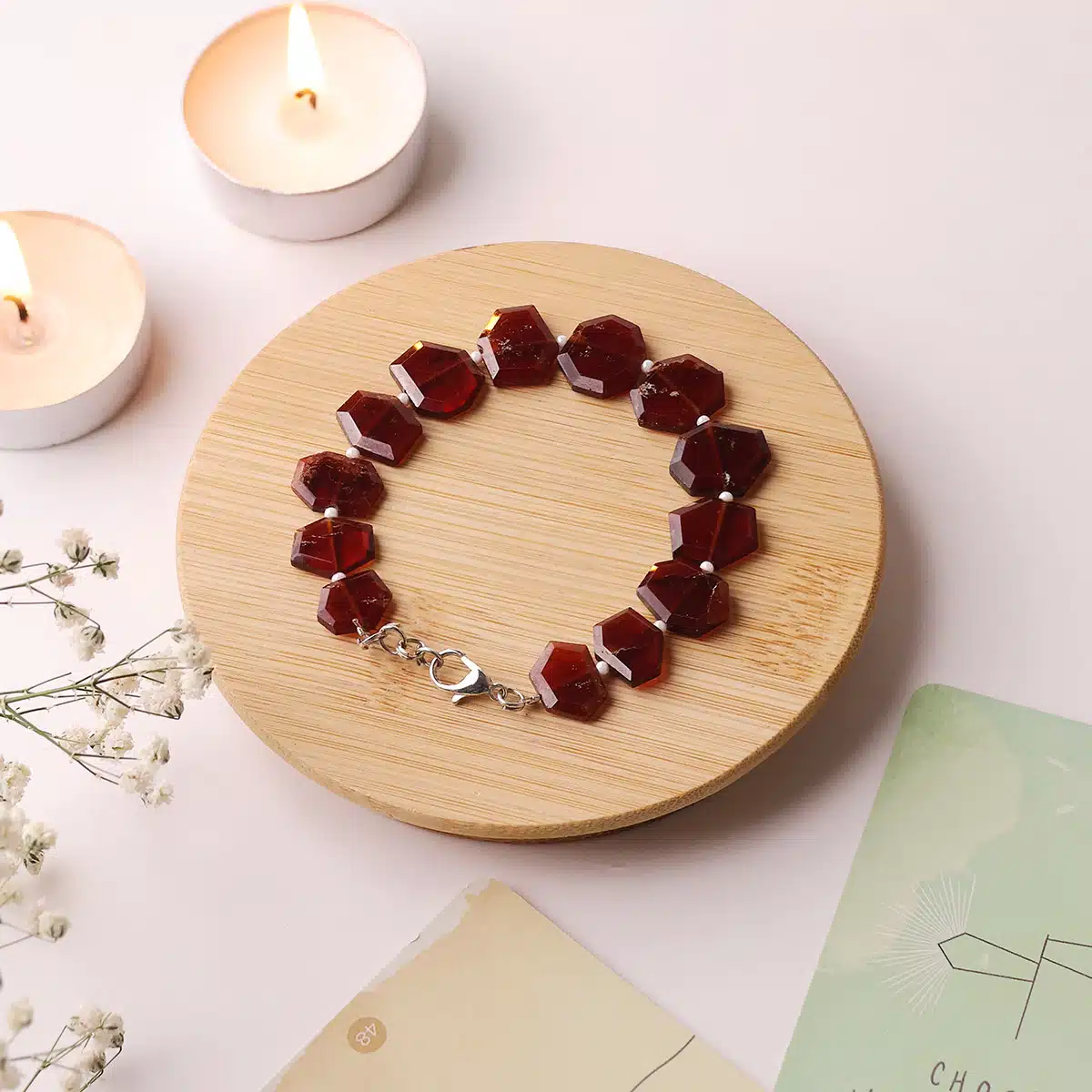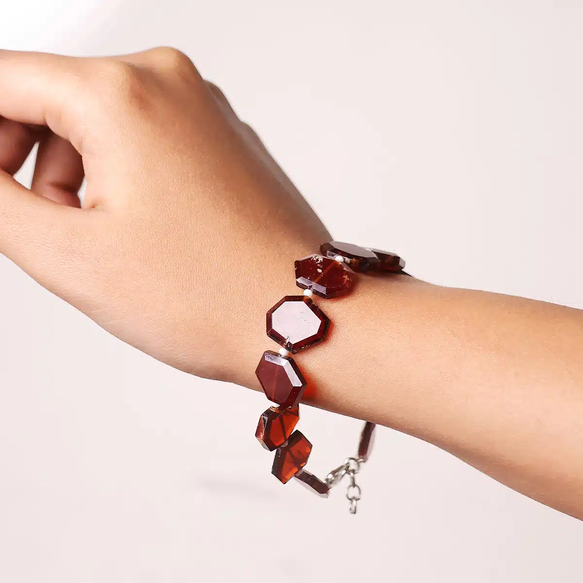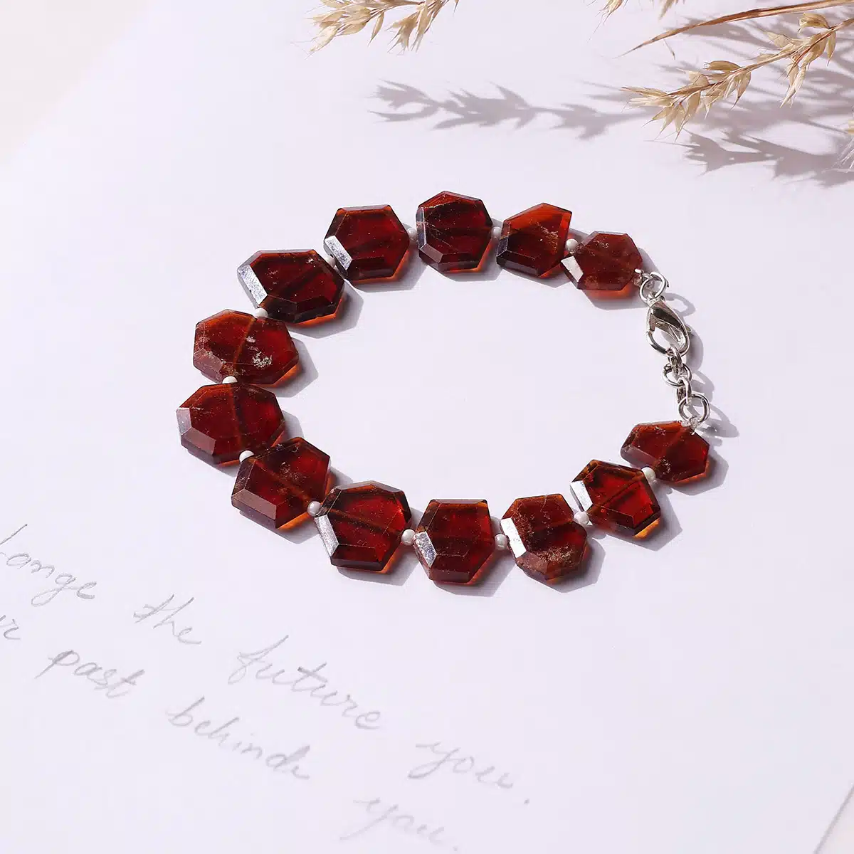 You will receive one natural Hessonite Hexagon Bracelet similar to the ones photographed. Images show typical quality. Each piece is unique, and natural variations in stone color, shape, and texture are expected.