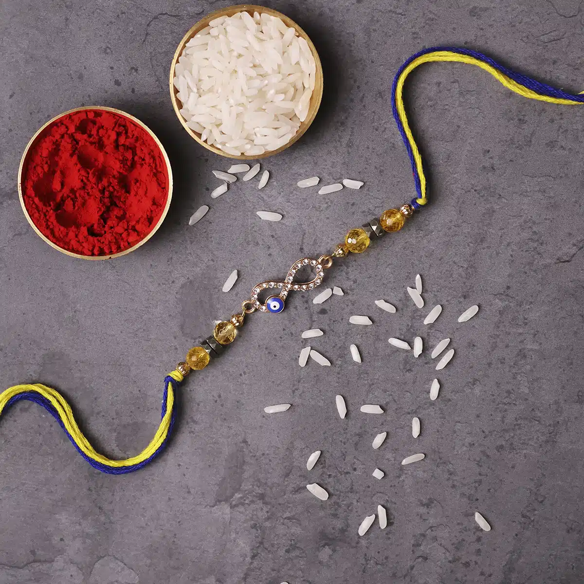 - With Box – Rakhi, Chawal-Kumkum, 2 chocolate coins, and a Rakhi card packed in a festive gift box.