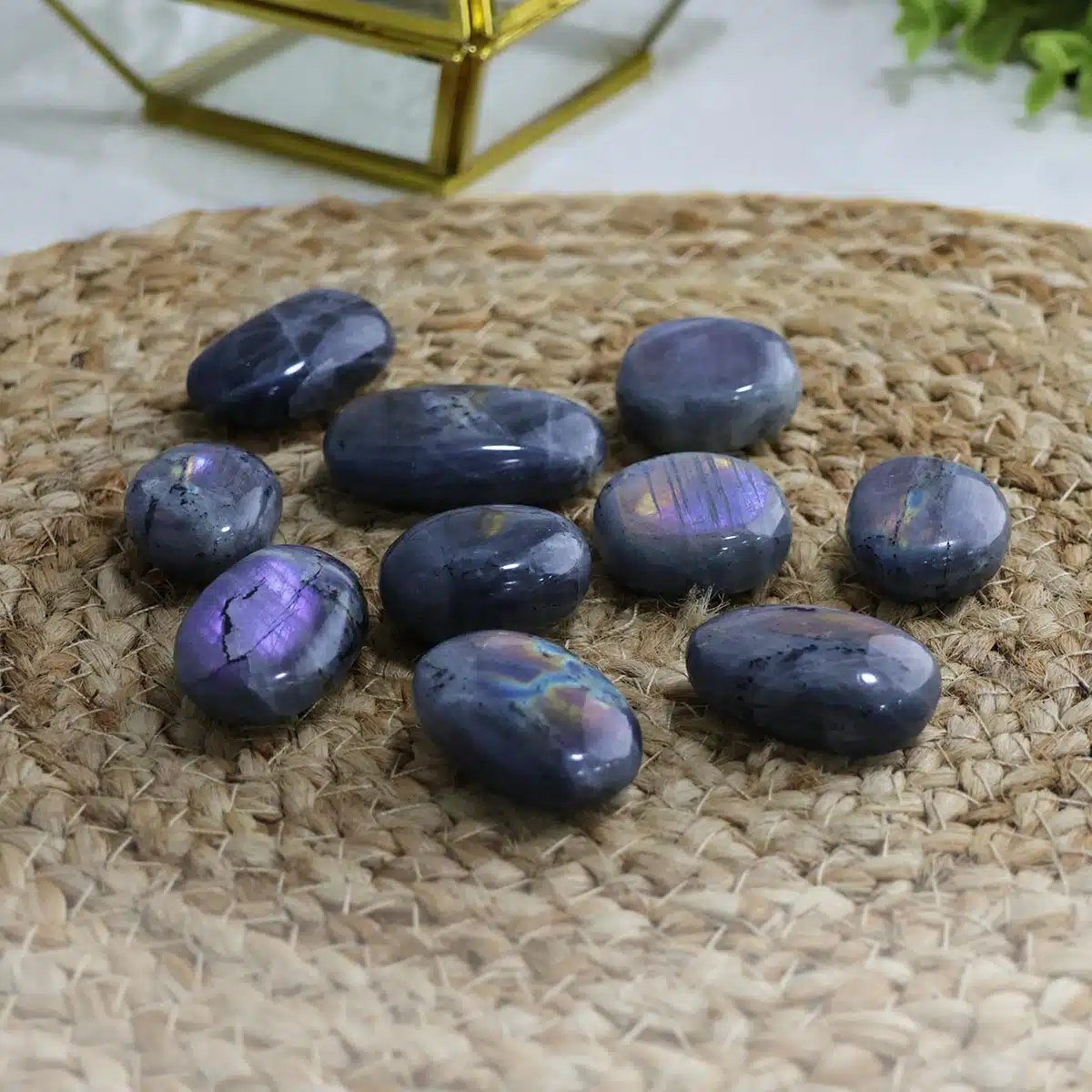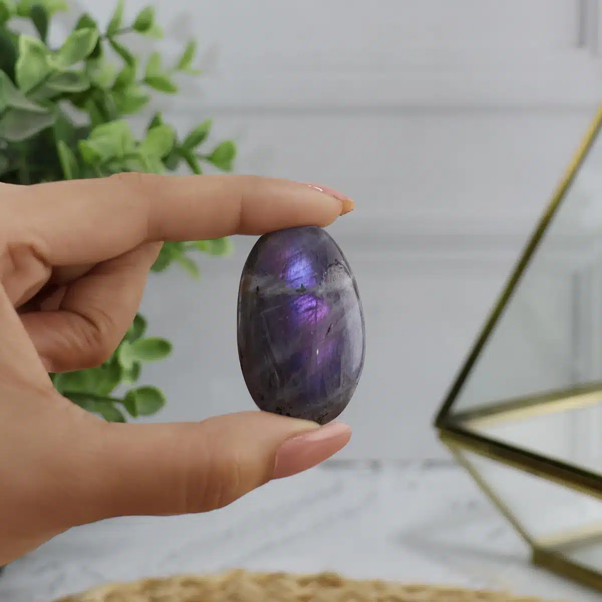 These Labradorite Purple Flash Palm Stones are often used for meditation, energy work, or as decorative pieces. They are believed by many to possess mystical and metaphysical properties, such as enhancing intuition, spiritual insight, and transformation.