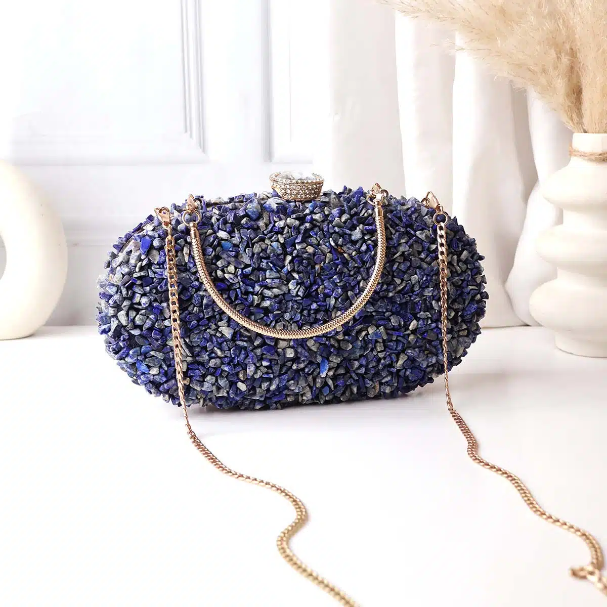 - Featuring a sparkling crystal clasp and metallic handle, the purse offers both elegance and everyday functionality—perfect for carrying essentials like your phone, wallet, and makeup.