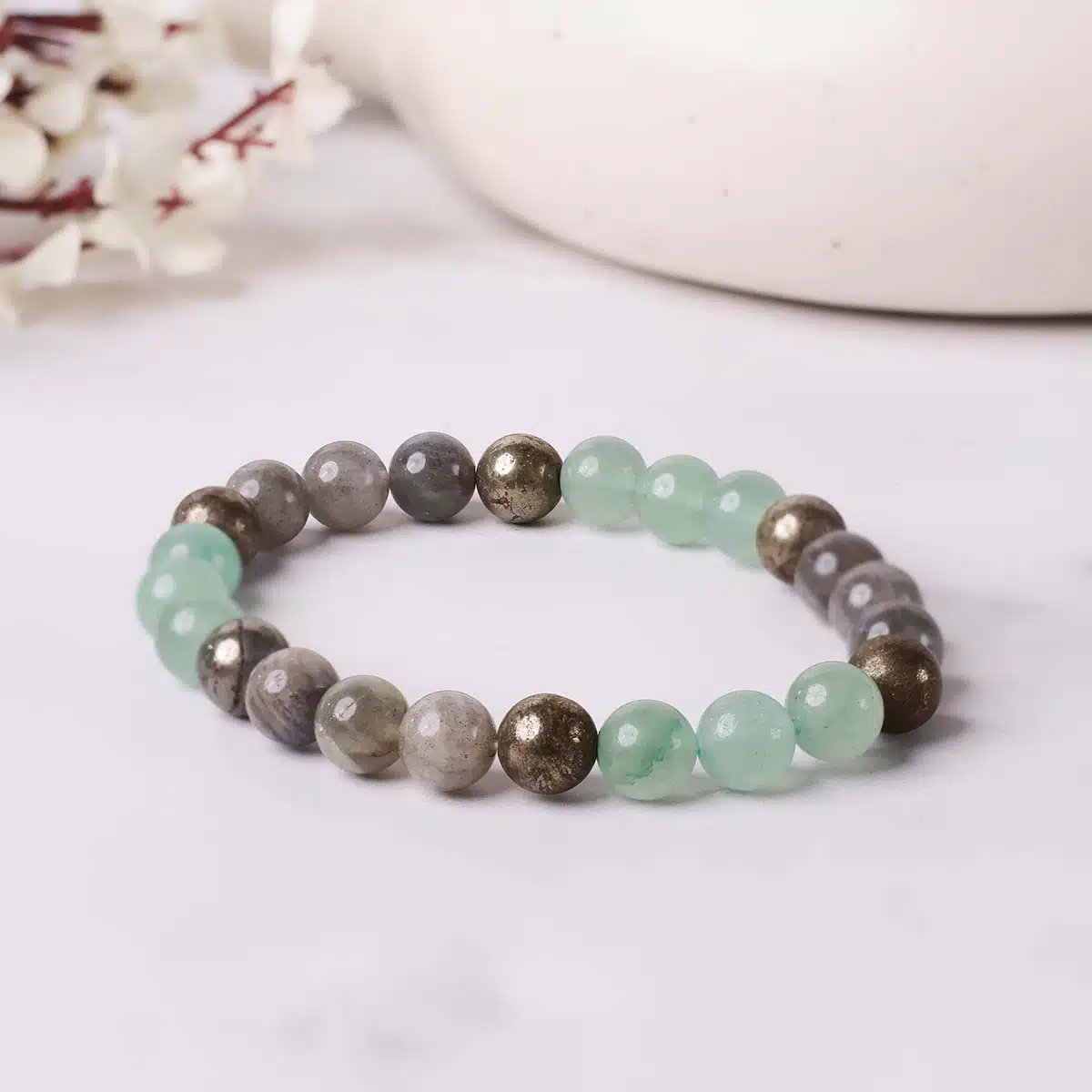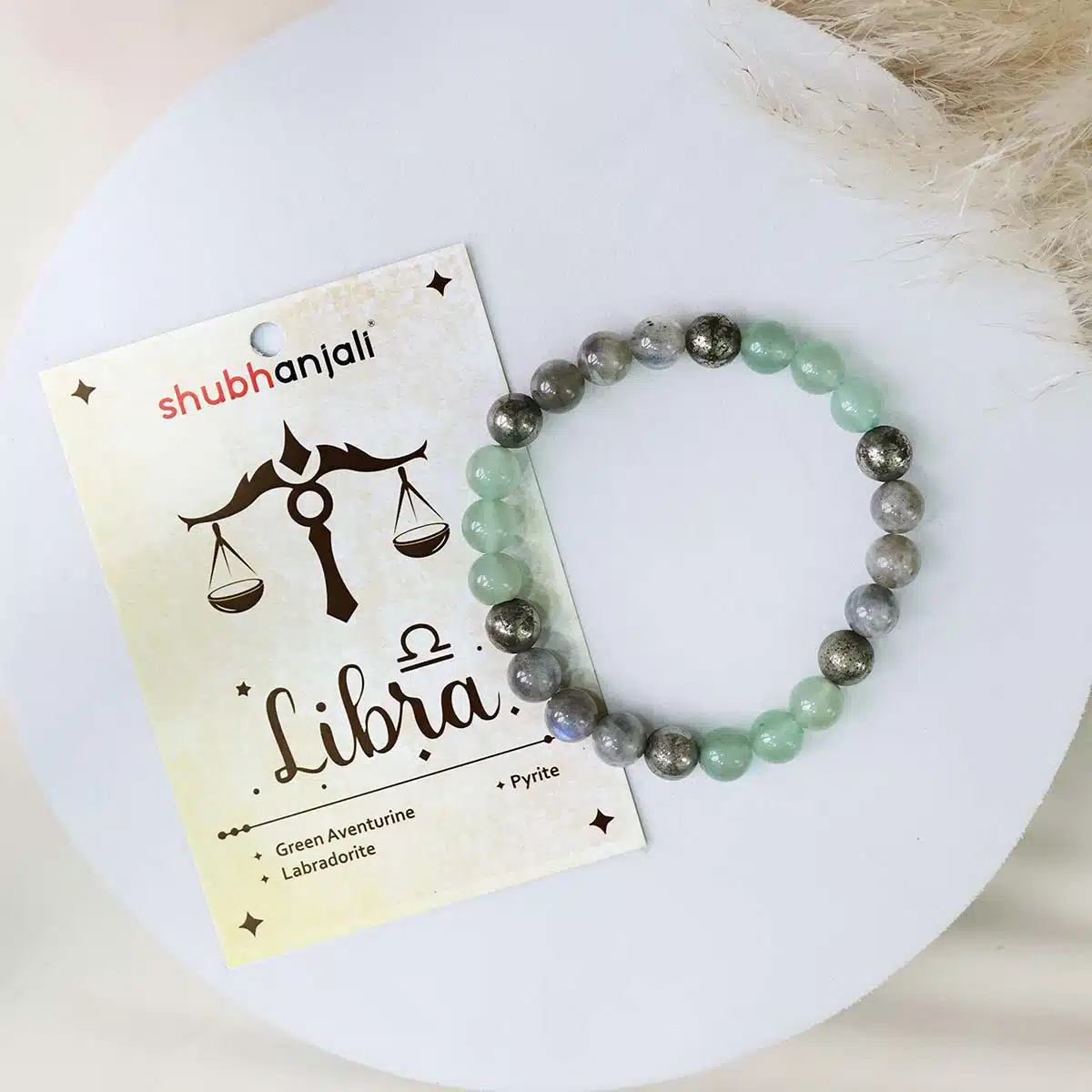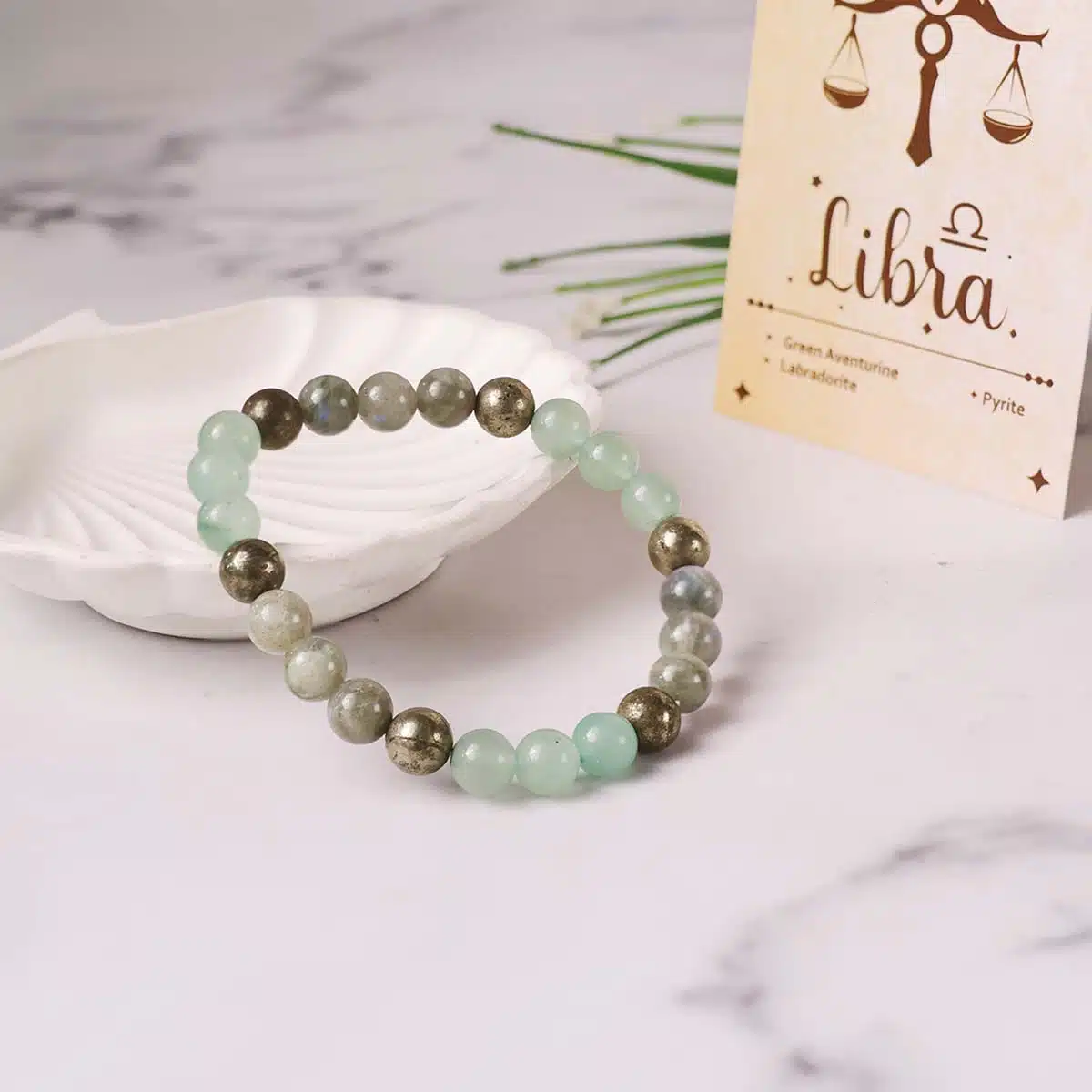 This Libra Bracelet is made using the following quality power healing beads 8mm Pyrite,Labradorite,Green Aventurine.The bracelet made using strong jewellery elastic and will comfortably stretch to fIt’sizes.Libra You appreciate the balance and you rather avoid conflicts. Your zodiac sign has to be Libra! Weve got something dedicated to you: beaded bracelet with natural stone and your zodiac sign.