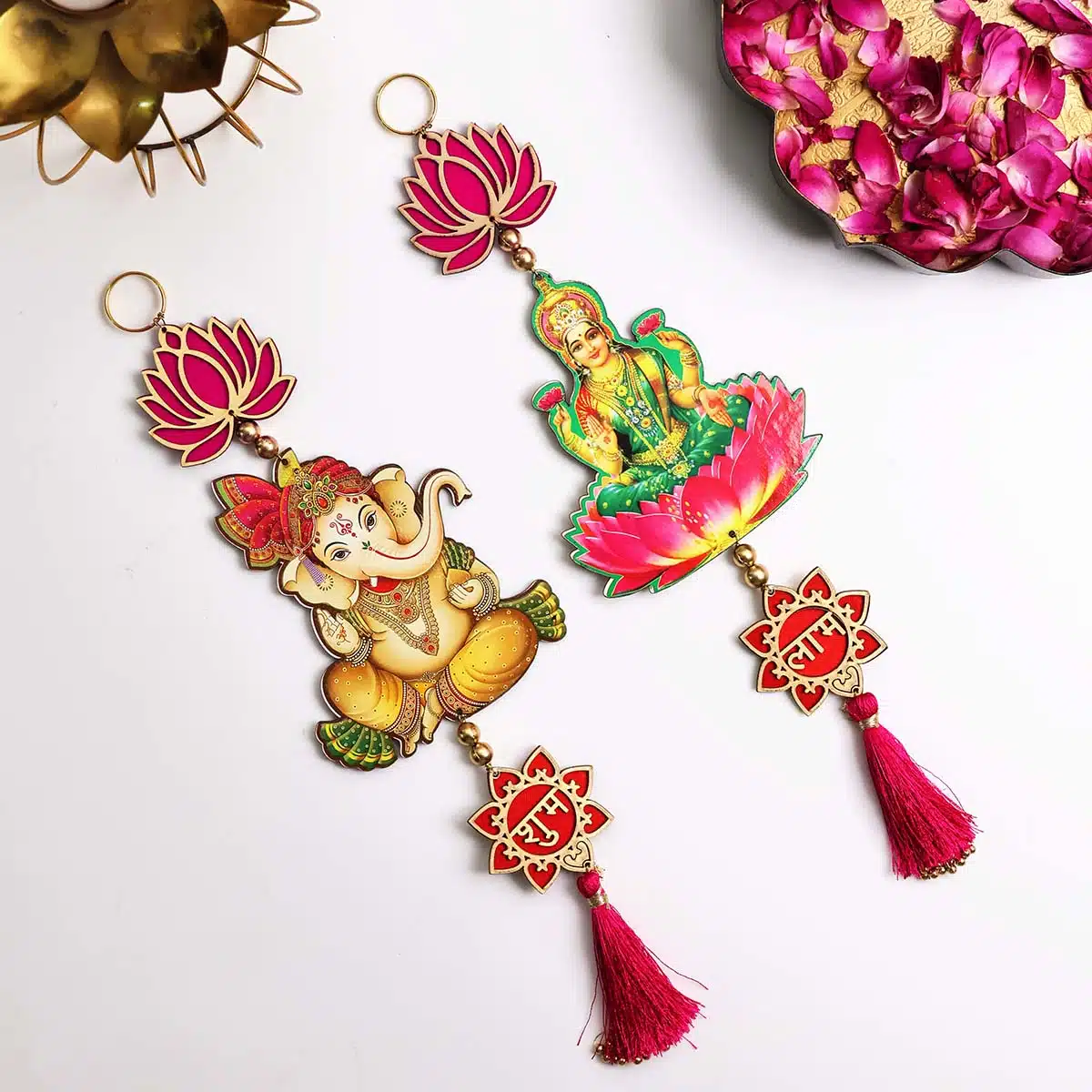 The Laxmi Ganesh hanging Lotus typically refers to a decorative item featuring the deities Laxmi and Ganesh, symbolizing wealth and prosperity. The lotus is a sacred symbol of purity and spiritual awakening. It is often used in homes or businesses to bring blessings and good fortune.
