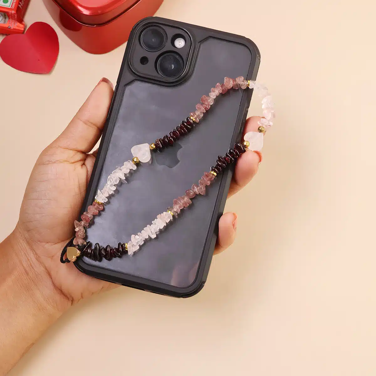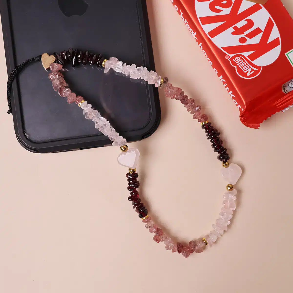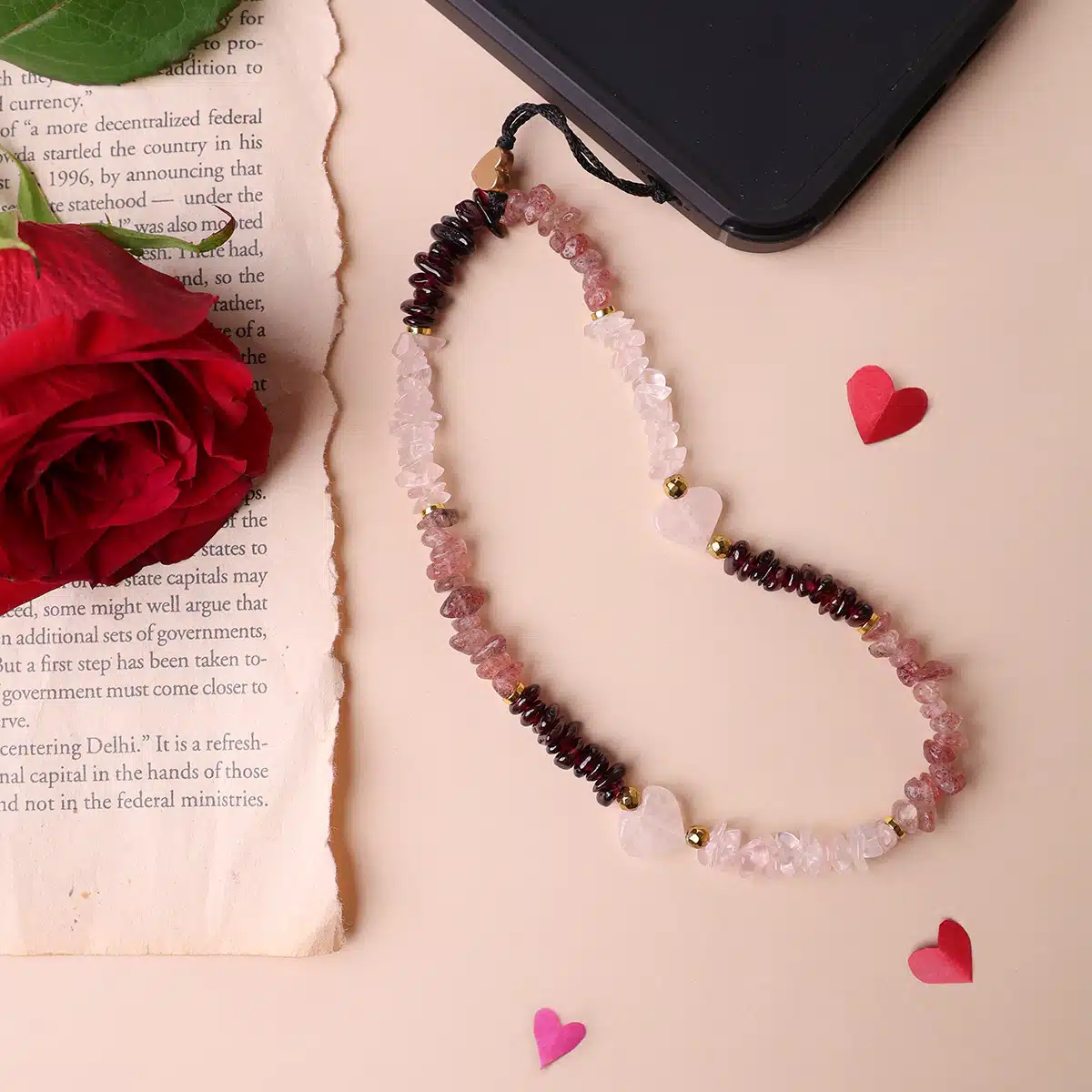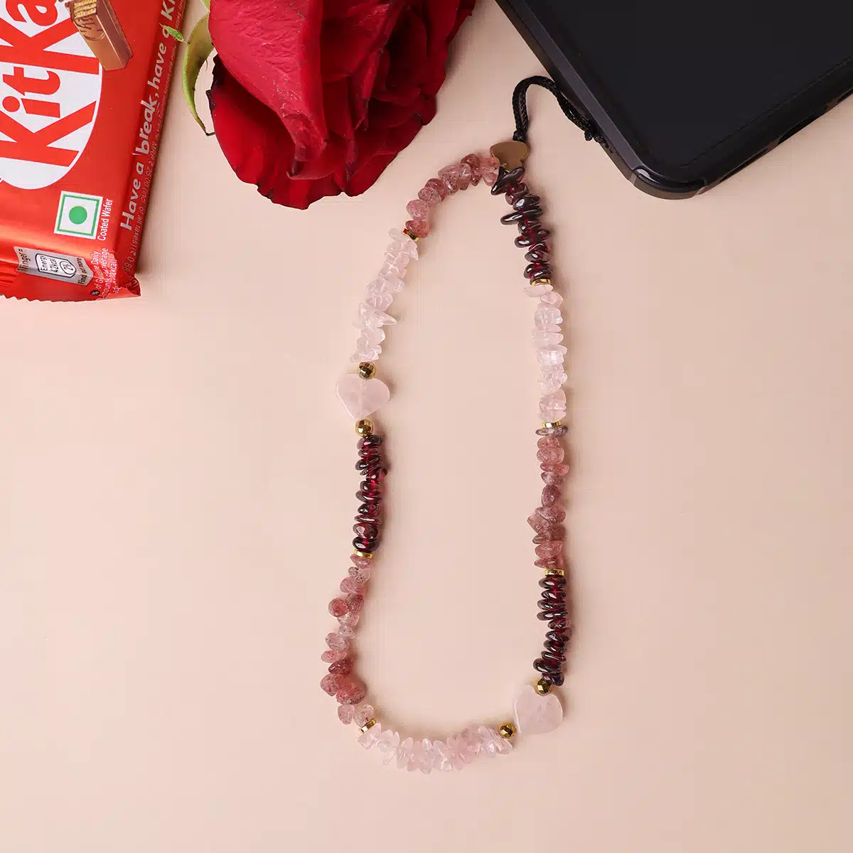 Infuse your day with love and positive energy with this stunning gemstone mobile strap.