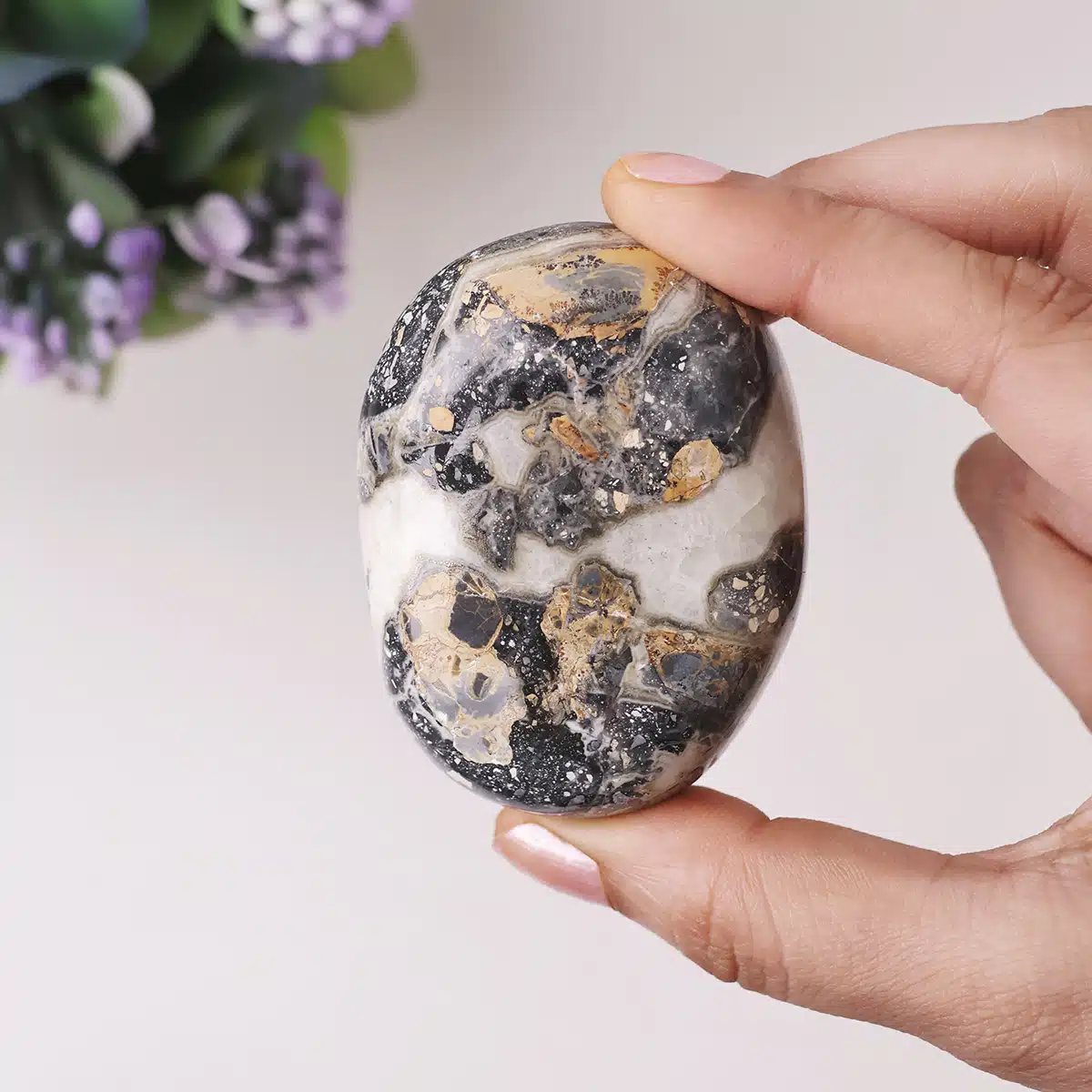 - Holding this palm stone promotes a calm emotional state, especially during turbulent times. It balances feelings of fear, sadness, and confusion, offering inner security and emotional maturity.