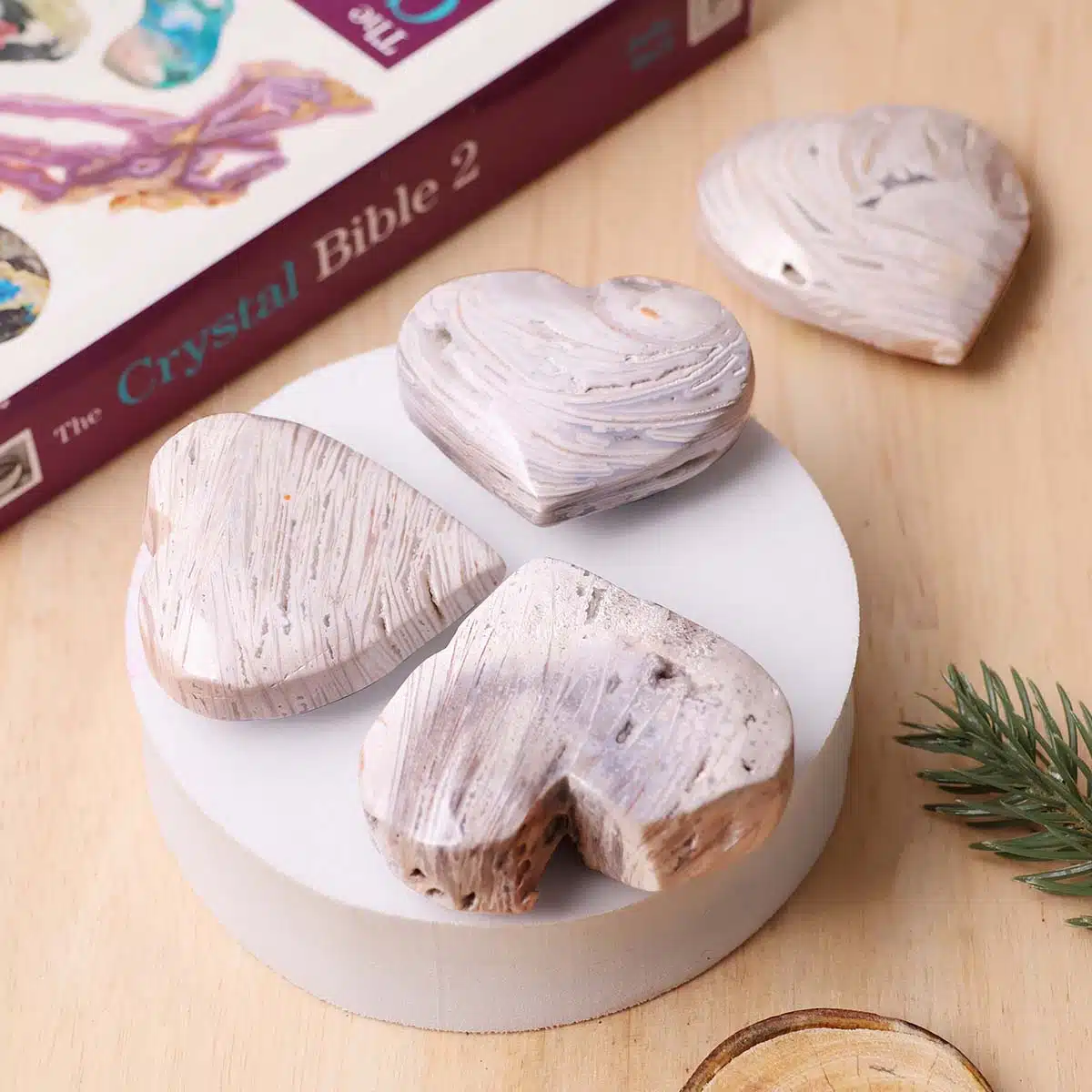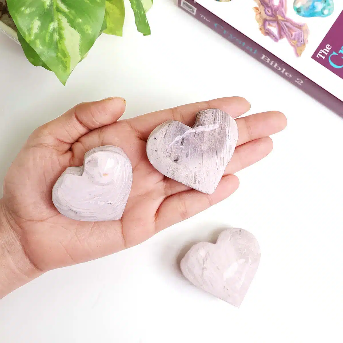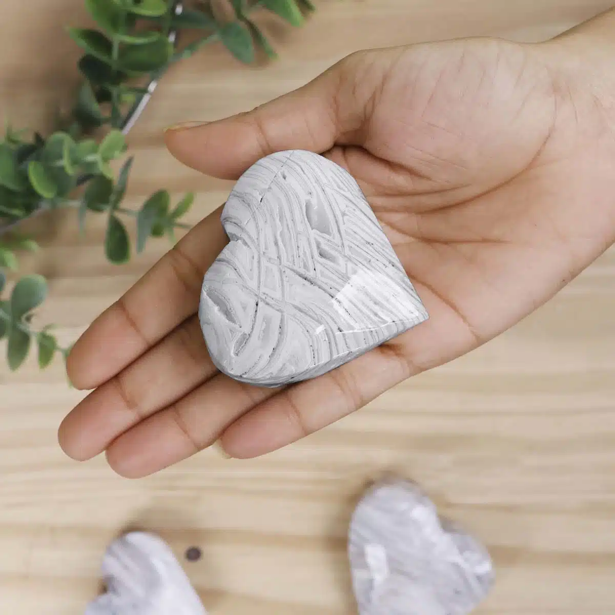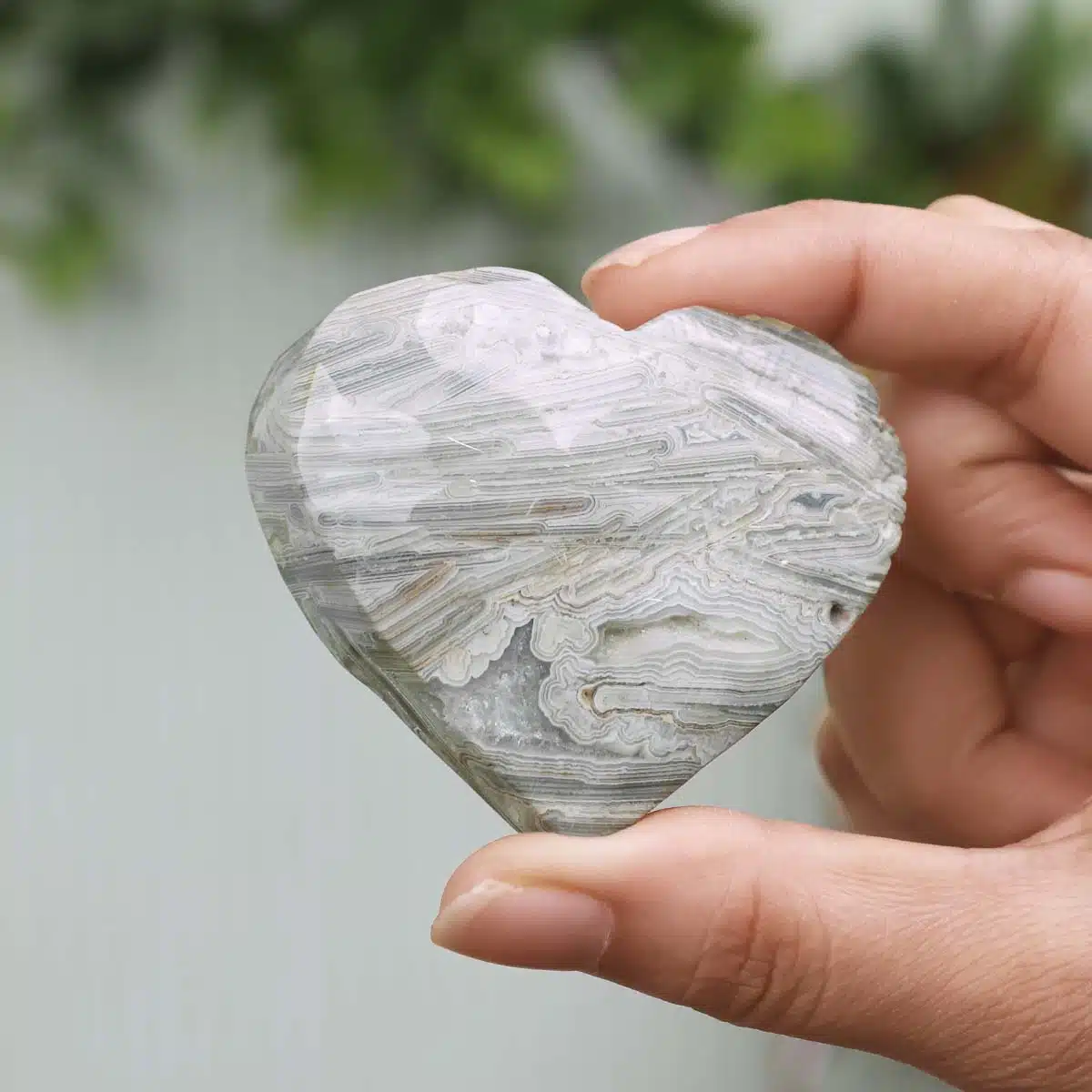 The heart shape, a universal symbol of love and compassion, combined with the gentle energy of White Mexican Agate, creates a representation of peace and harmony. The crystal is often associated with balance, clarity, and grounding, making it a symbol of serenity and stability.