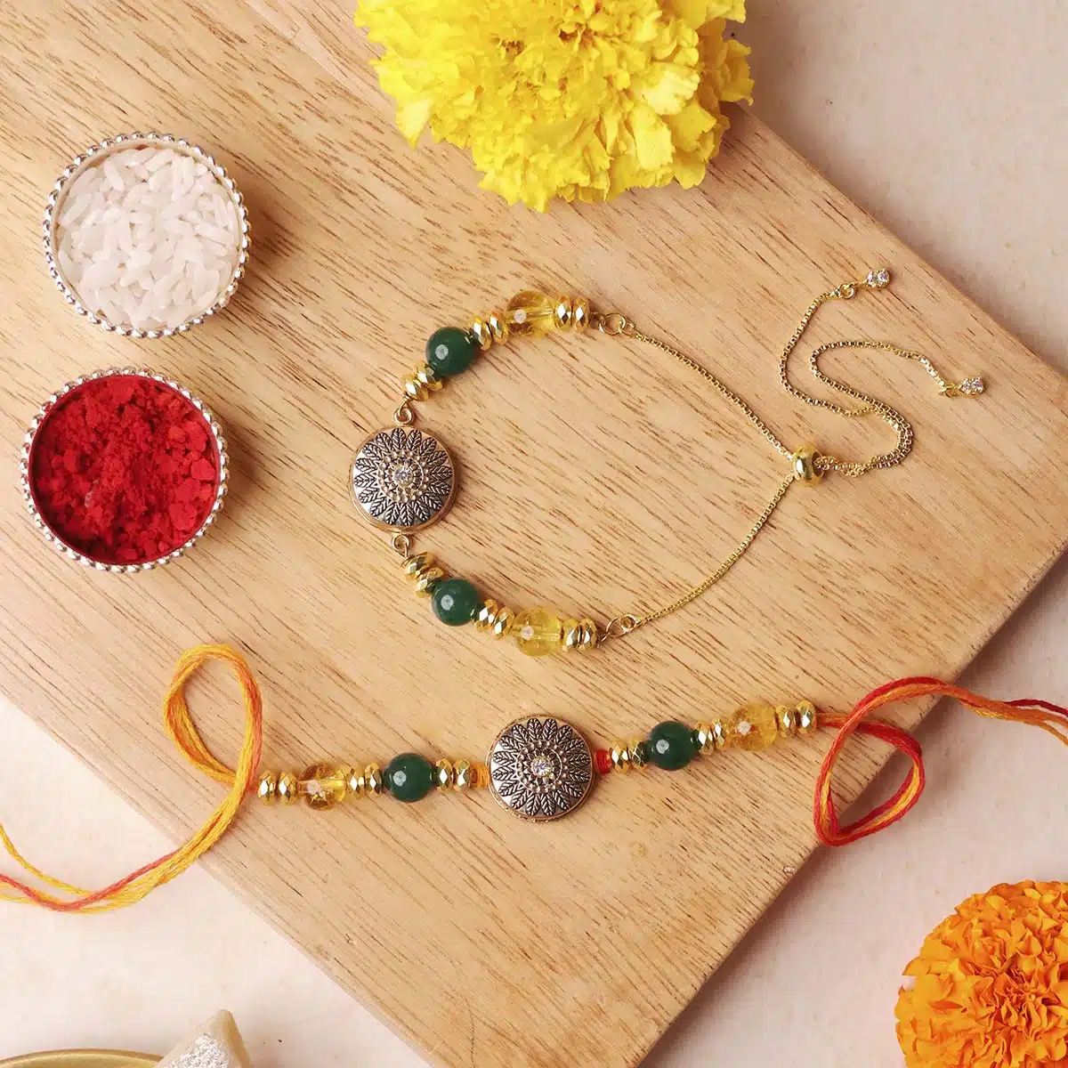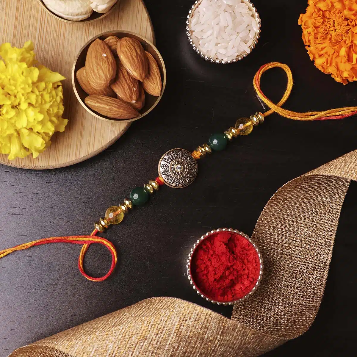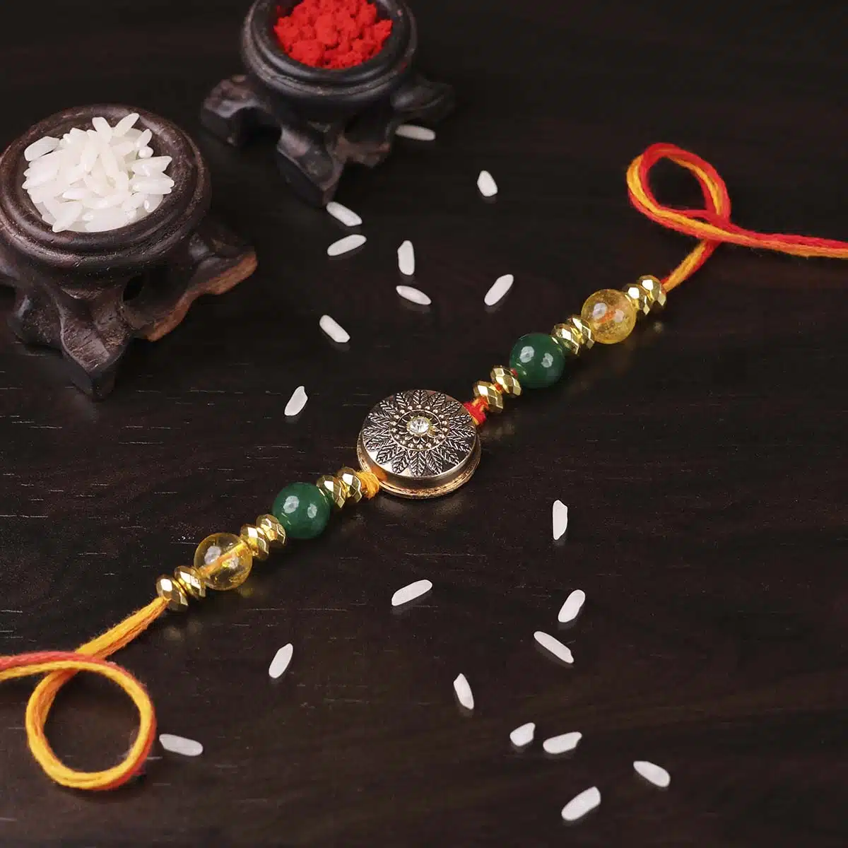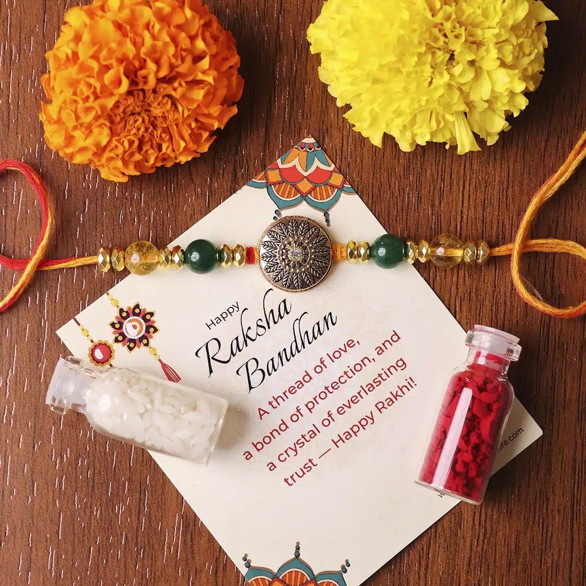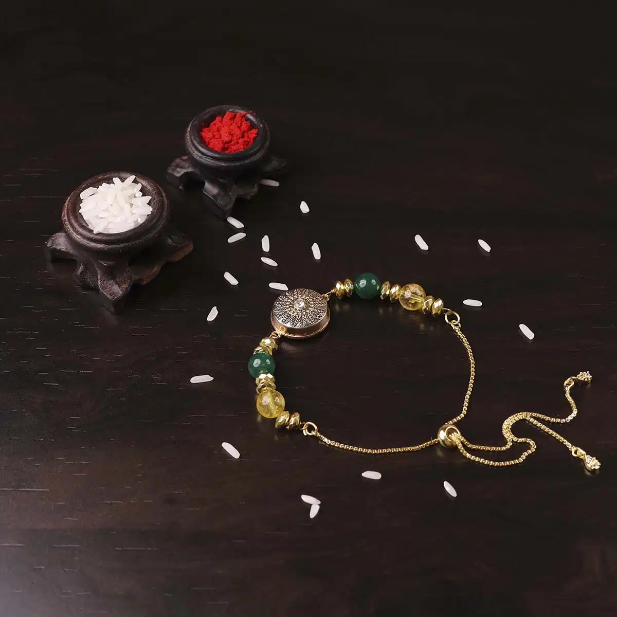 Citrine- 8 mm 2 Beads | Green Jade- 8 mm 2 beads | Golden Hematite Bati Beads 6 mm,12 beads | Flower Design Round Charm | Money Magnet Combination Crystal Handcrafted Rakhi.