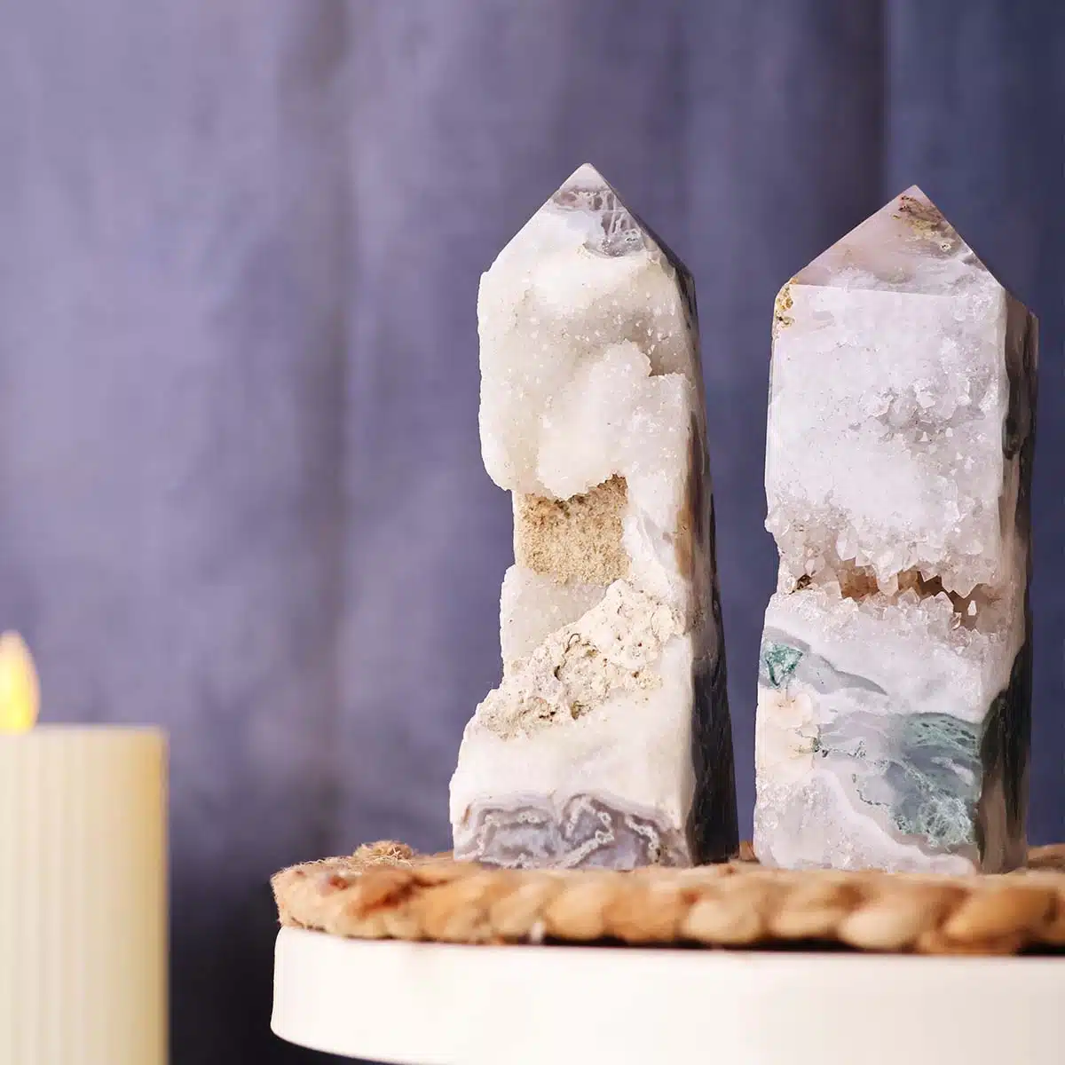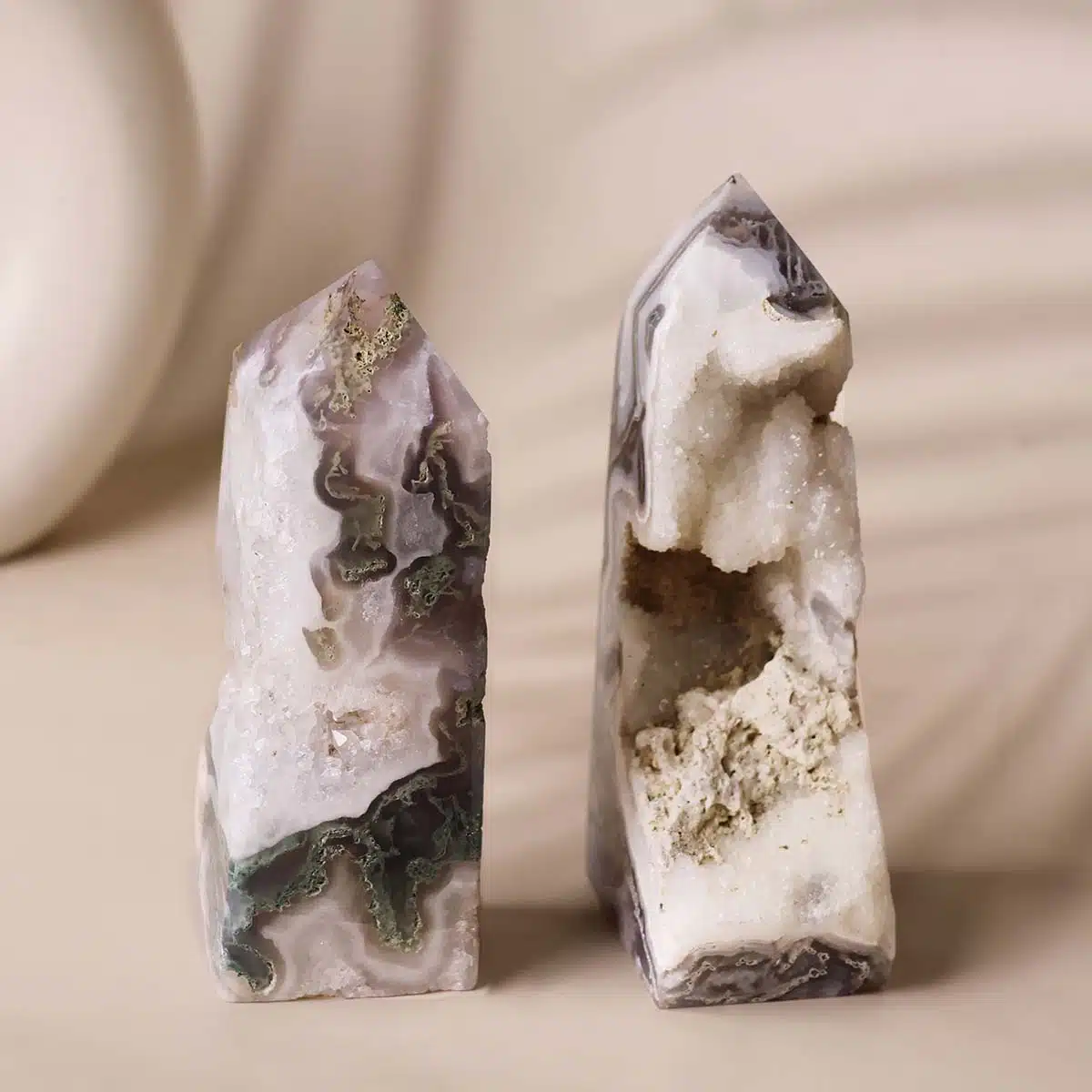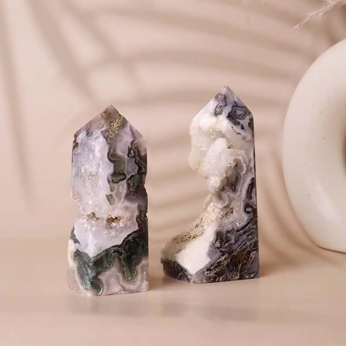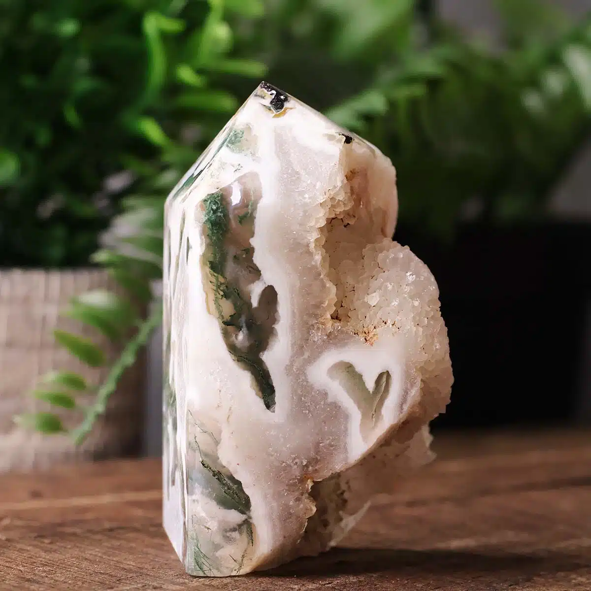 - A powerful Moss Agate Druzy Tower that enhances grounding and connection to nature.
