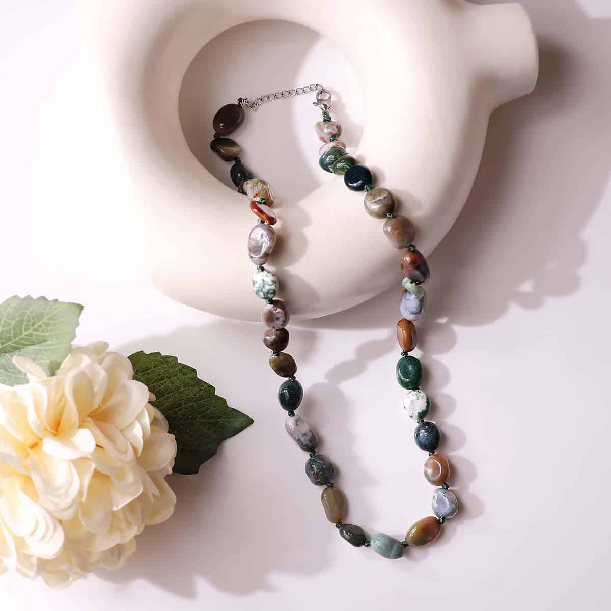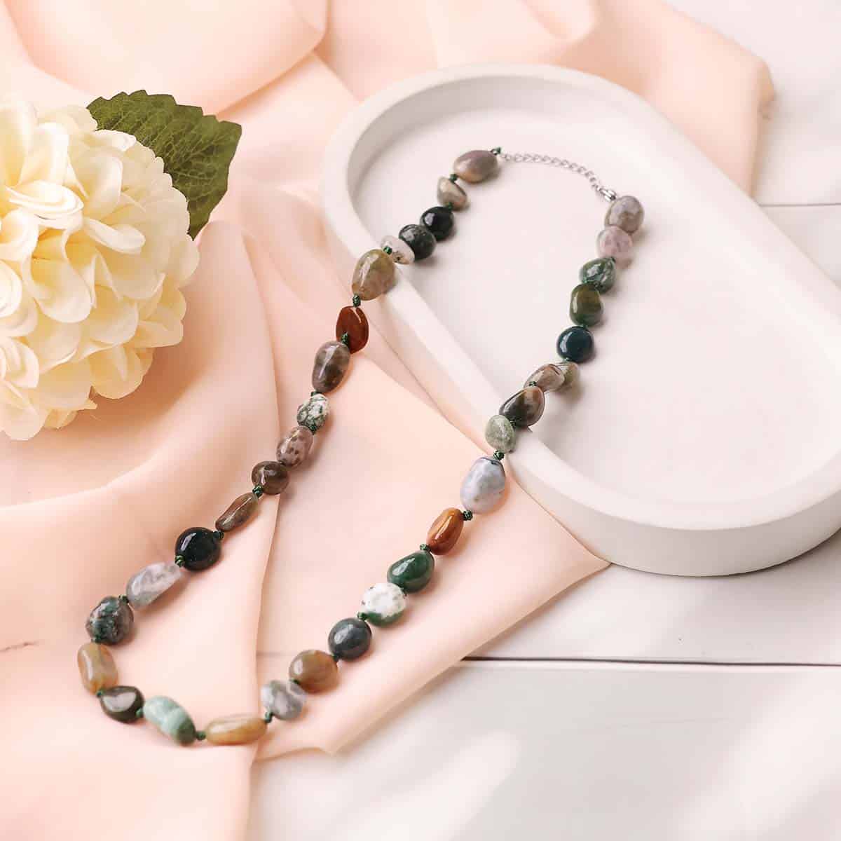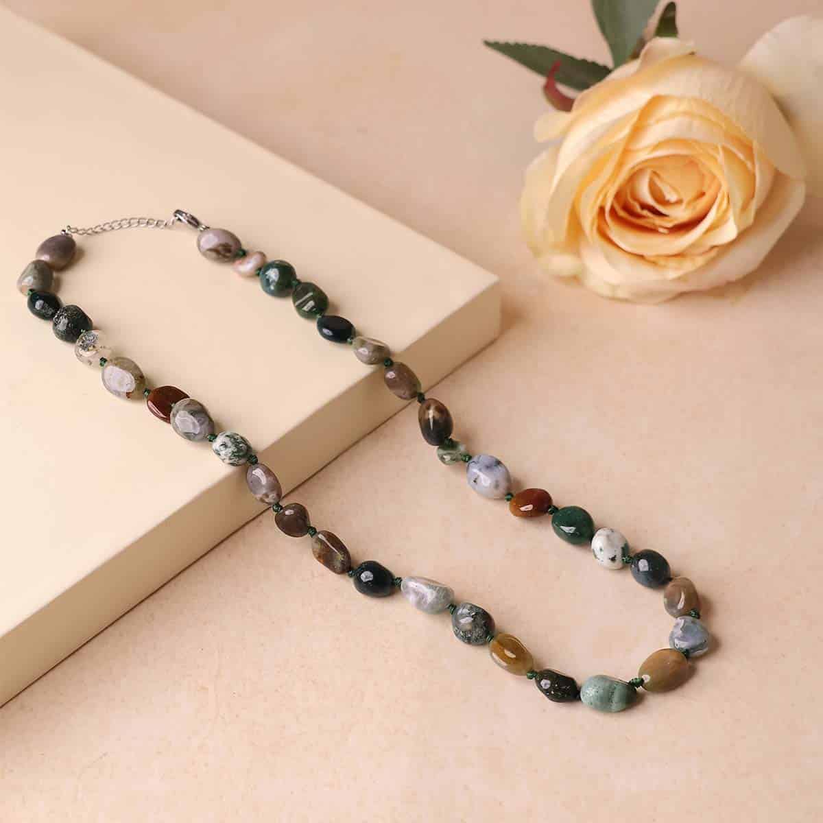 The Moss Agate Small Tumble Necklace is a refreshing and nature-inspired accessory crafted from a polished Moss Agate stone.