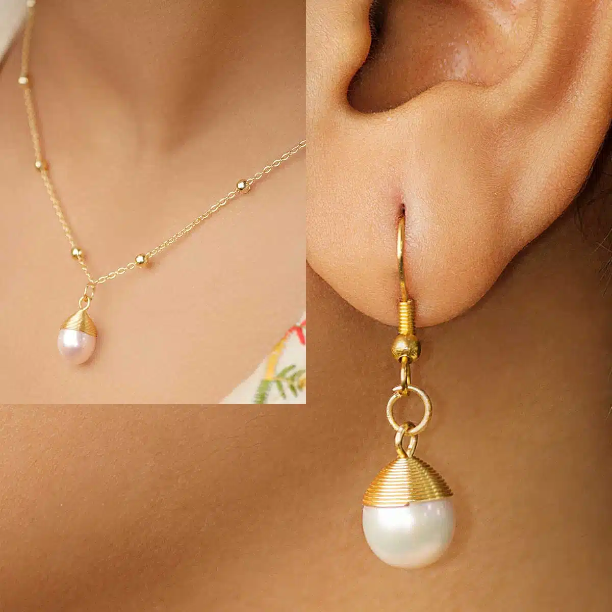Natural Pearl Pendant with Chain | Hook Earring | Adjustable Ring | Chain Bracelet.