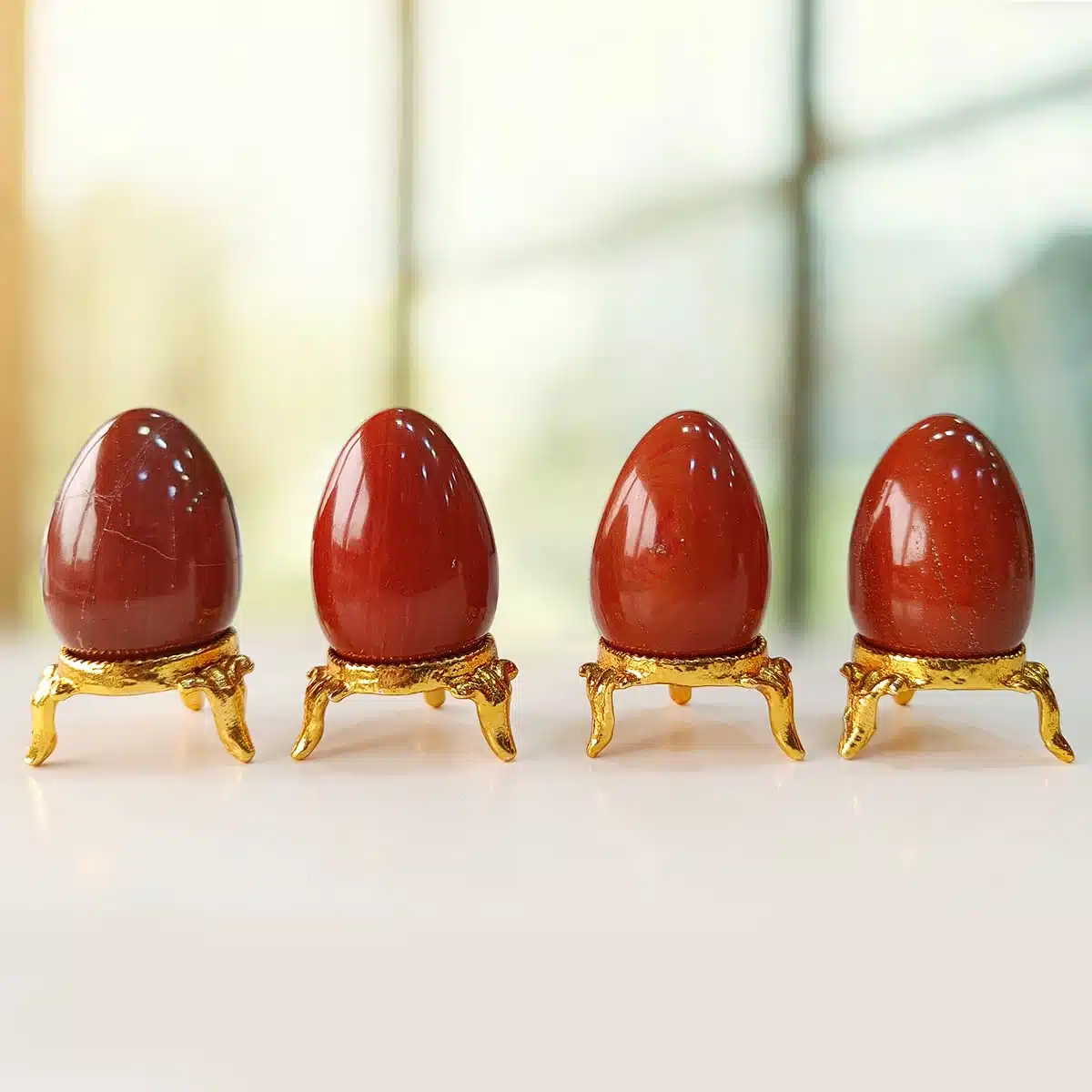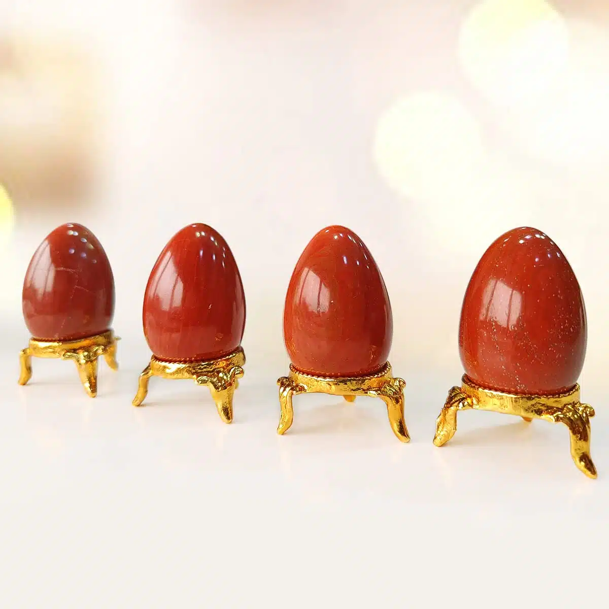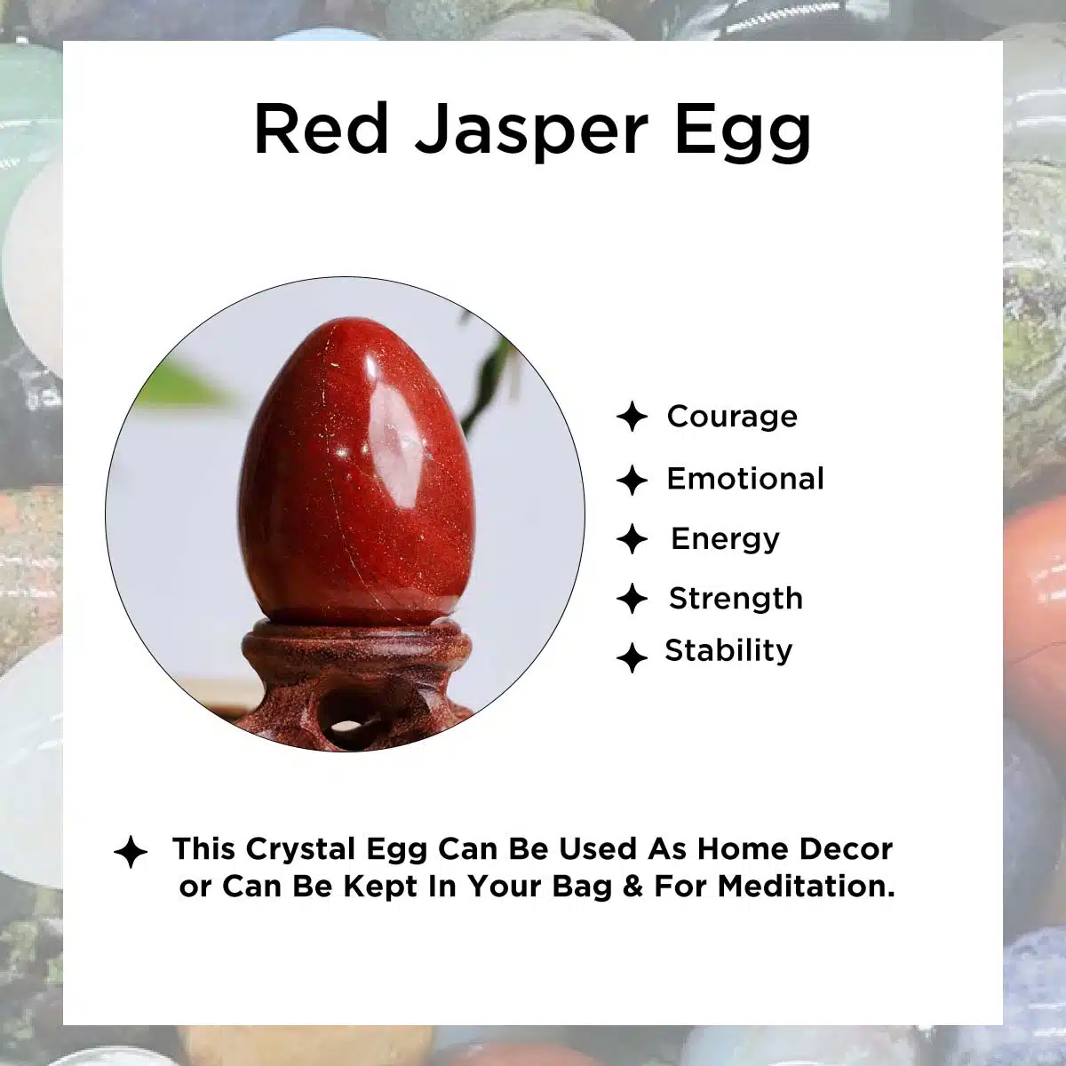 You can choose a crystal egg to cater to your needs: RED JASPER: Self-trust, Balance, Endurance, Nurturing