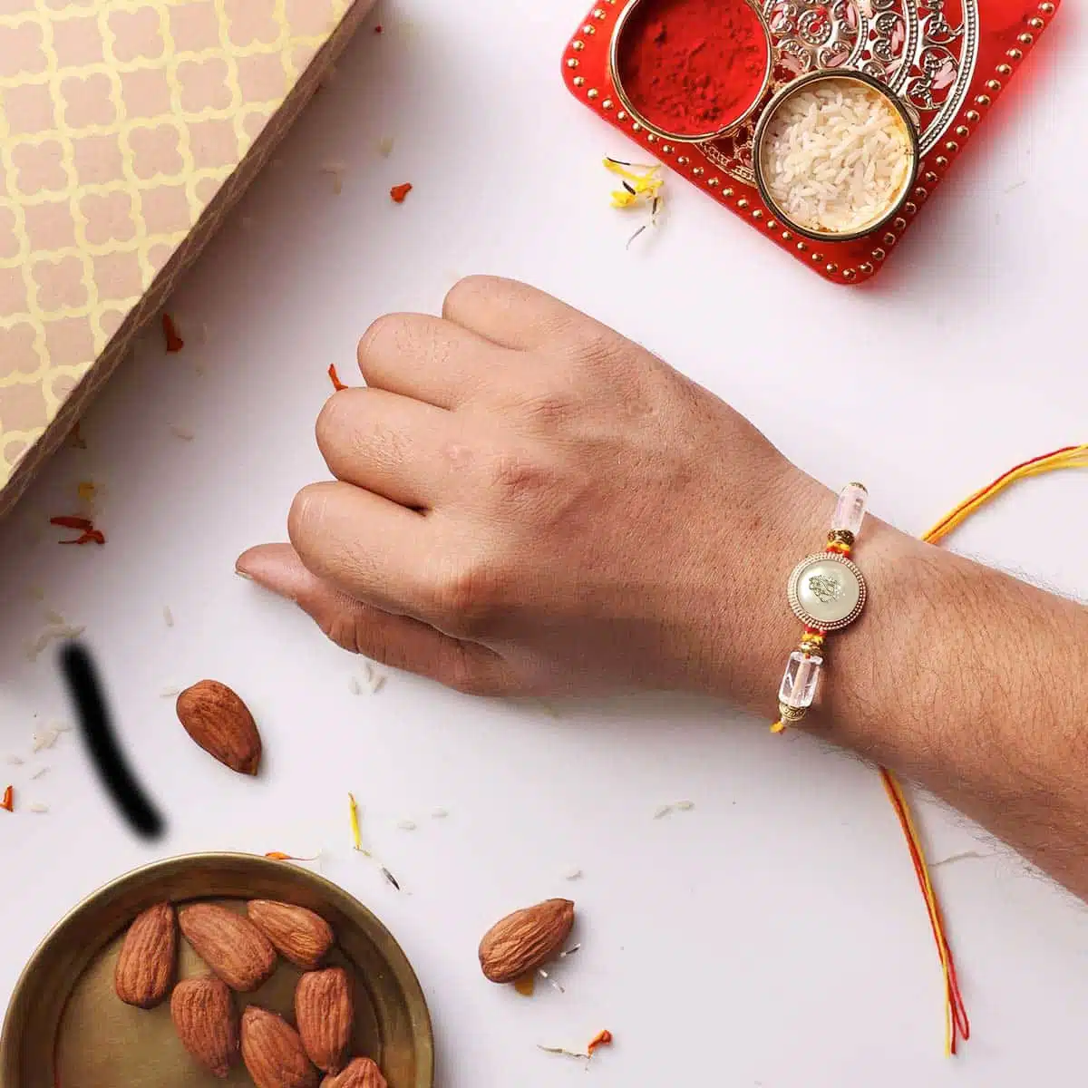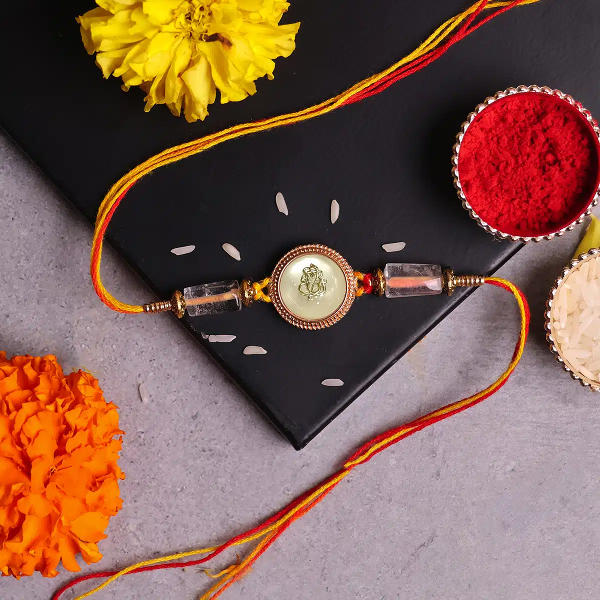 Ganesha Charm – Lord Ganesha symbolizes wisdom, peace, and divine protection. His presence in the rakhi invokes blessings, removes obstacles, and ensures a serene, spiritually guided path for your Bhaiya and Bhabhi.