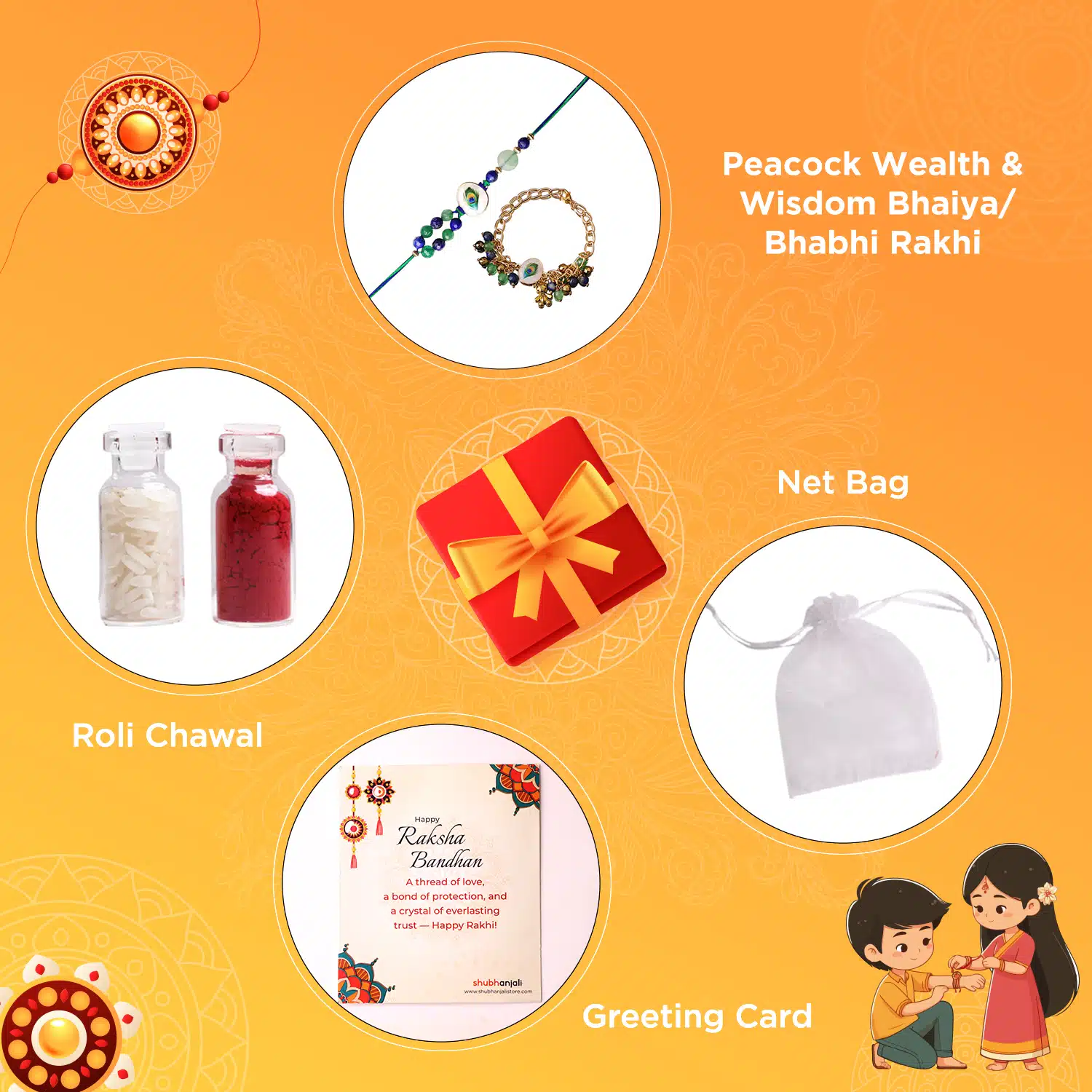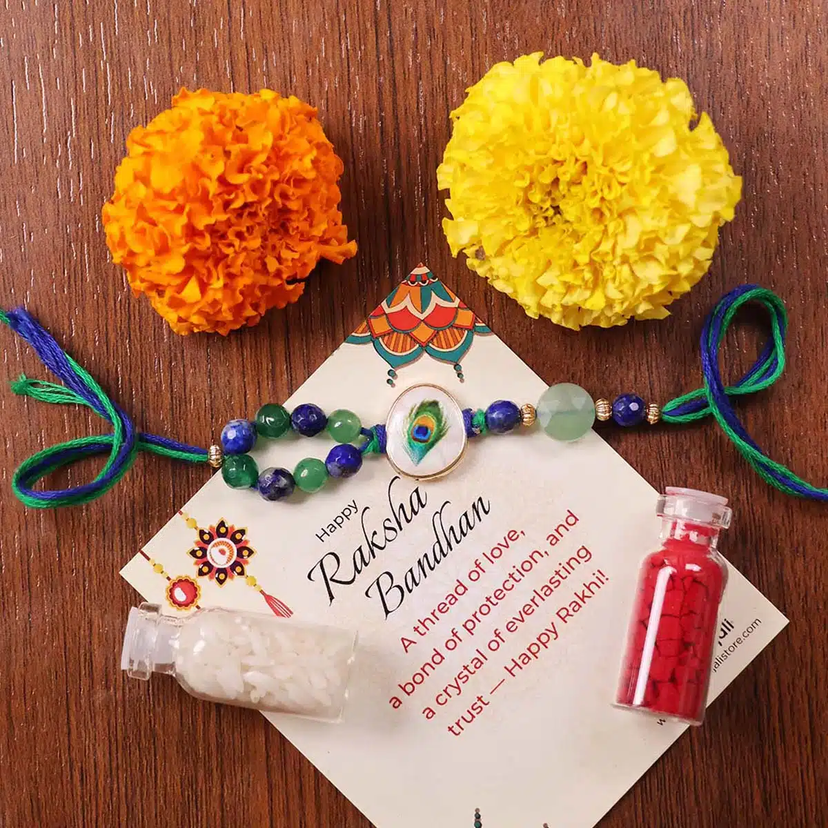 - With Box – Rakhi, Chawal-Kumkum, 2 chocolate coins, and a Rakhi card packed in a festive gift box.
