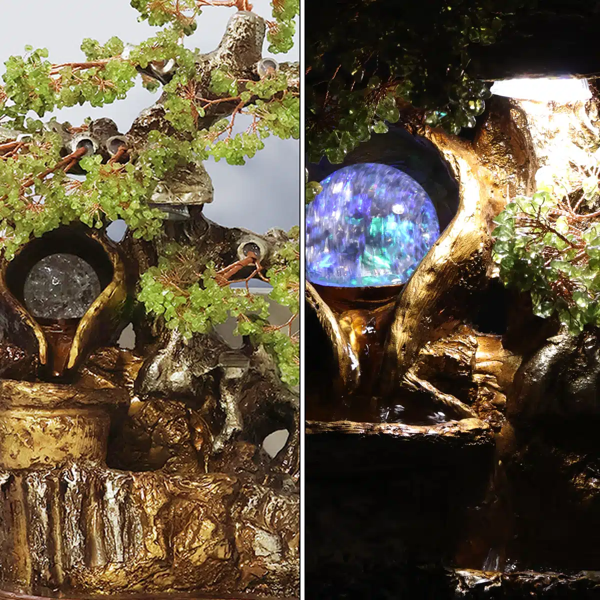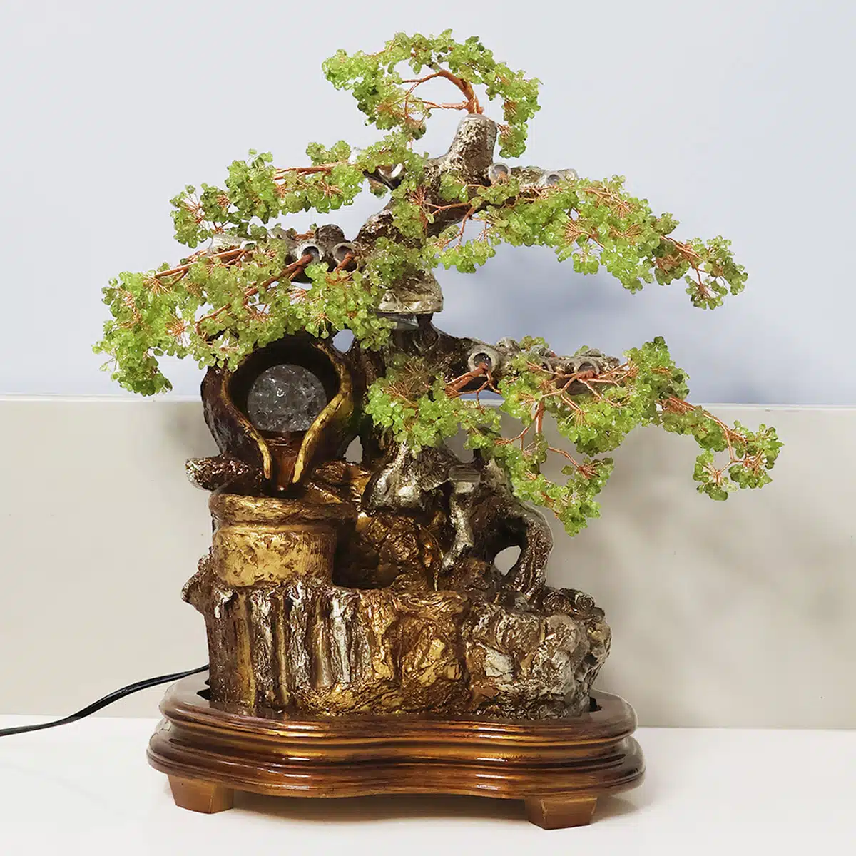 - The peridot tree incorporates a water fountain feature, where water is pumped to flow over the peridot chips, creating a gentle and soothing sound as it cascades down the structure.