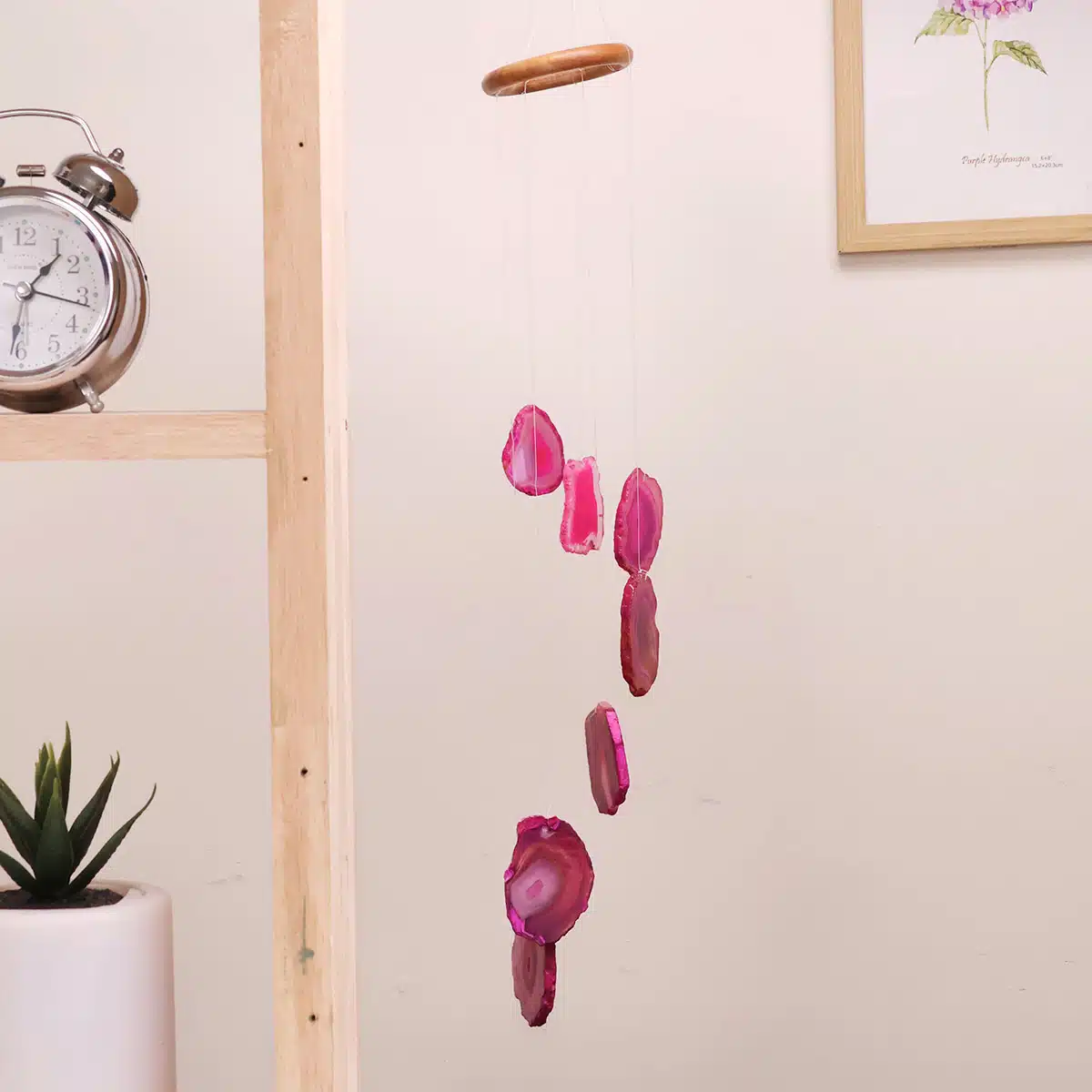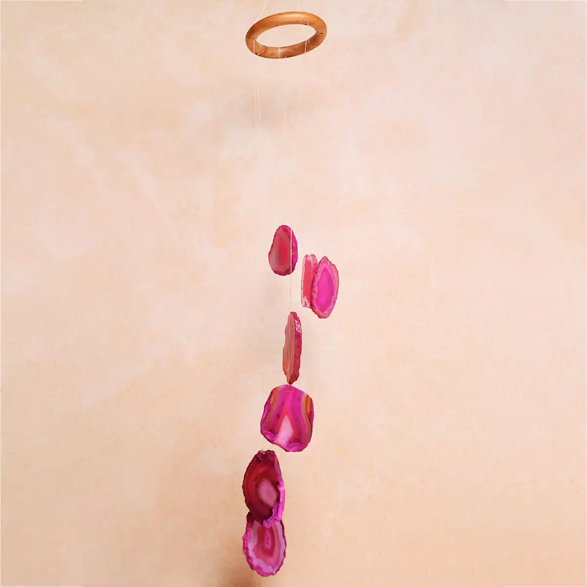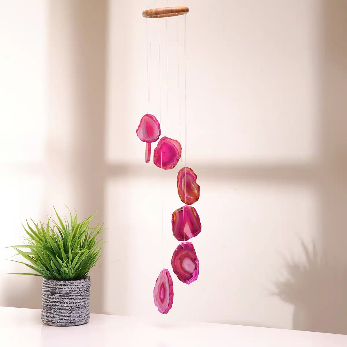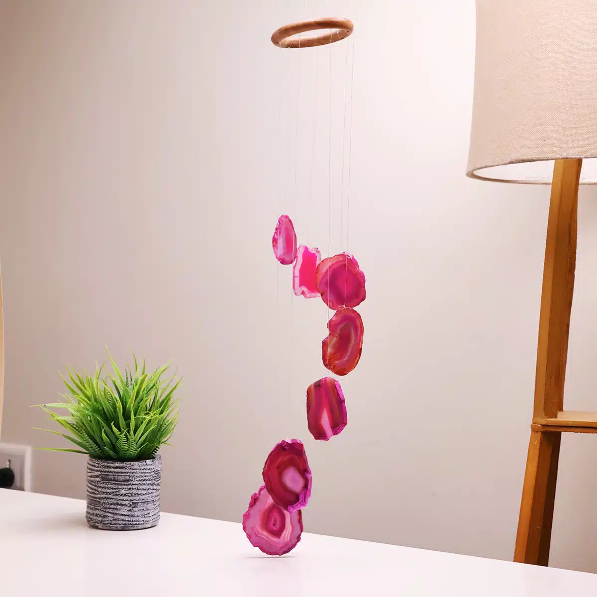 - Product Package:-1 Pink Agate Slice Windchime with 7 Agate geode slices with a drilled hole, secured to a wooden ring for a beautiful, musical display.