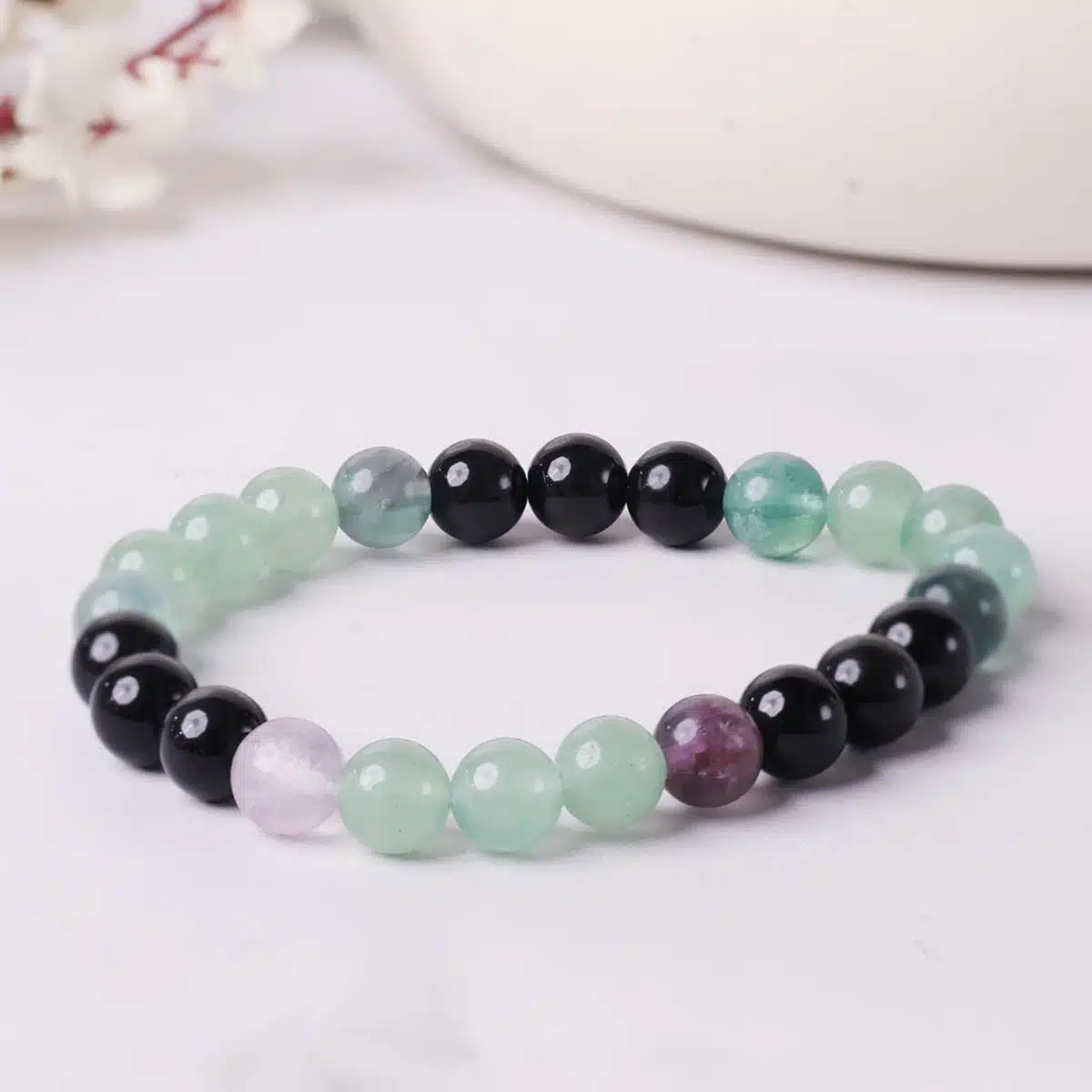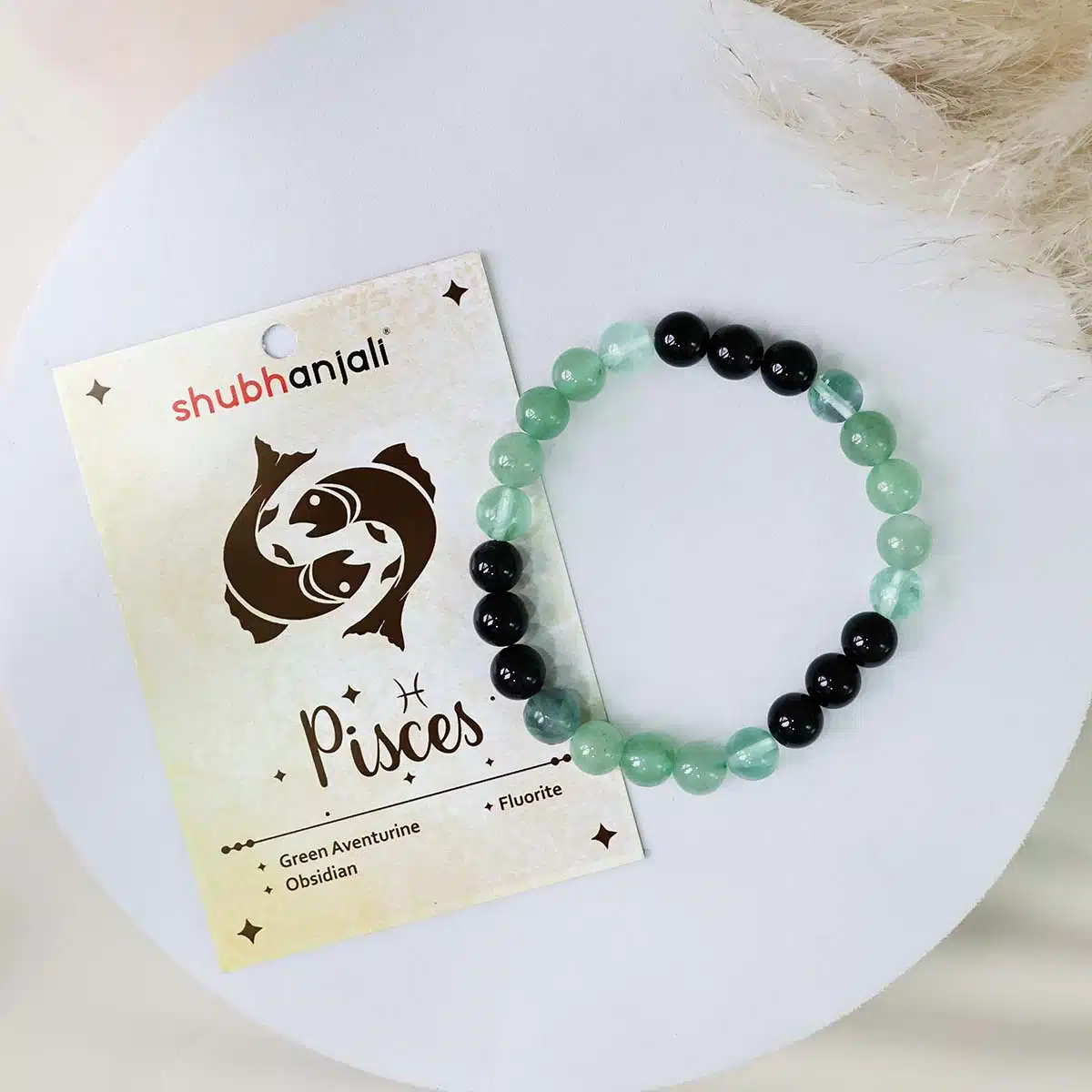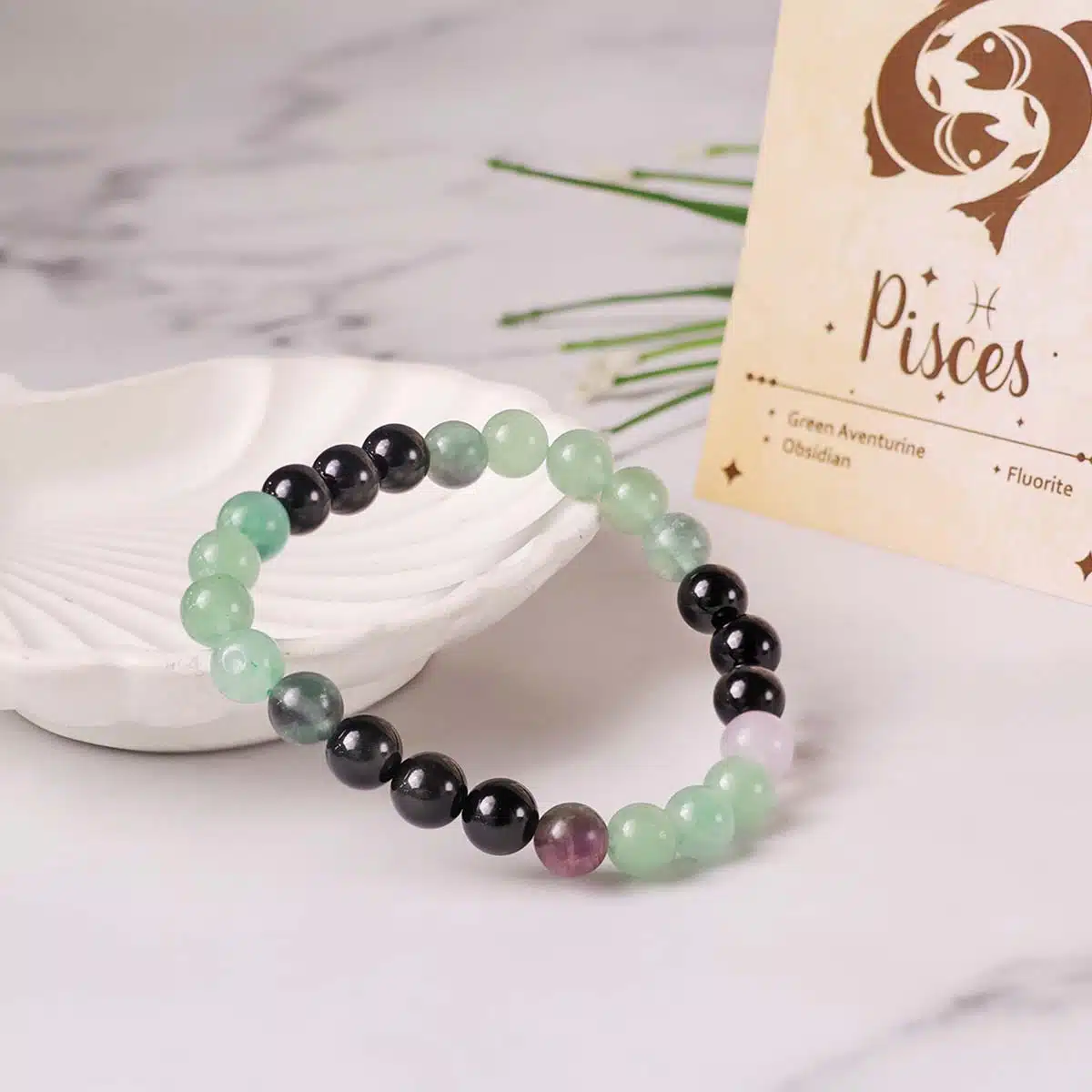 This Pisces Bracelet is made using the following quality power healing beads 8mm Fluorite,Obsidian,Green Aventurine.The bracelet made using strong jewellery elastic and will comfortably stretch to fIt’sizes.