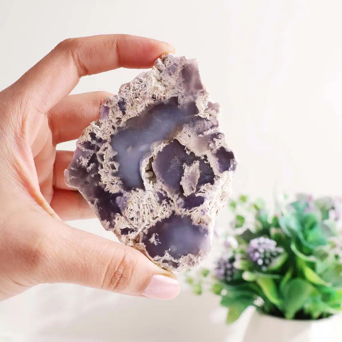 - Purple Chalcedony is deeply nurturing, helping to dissolve negative emotions like fear, anger, and self-doubt. It gently supports emotional recovery, forgiveness, and balance.