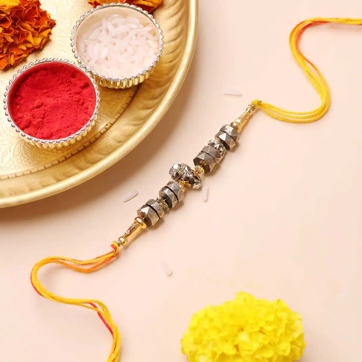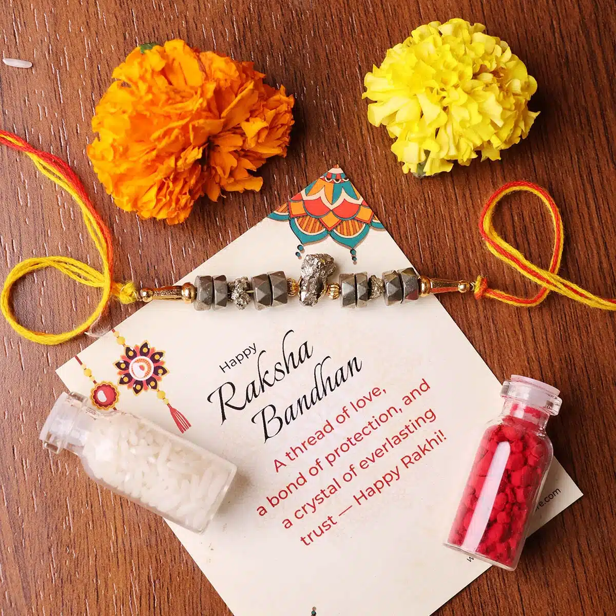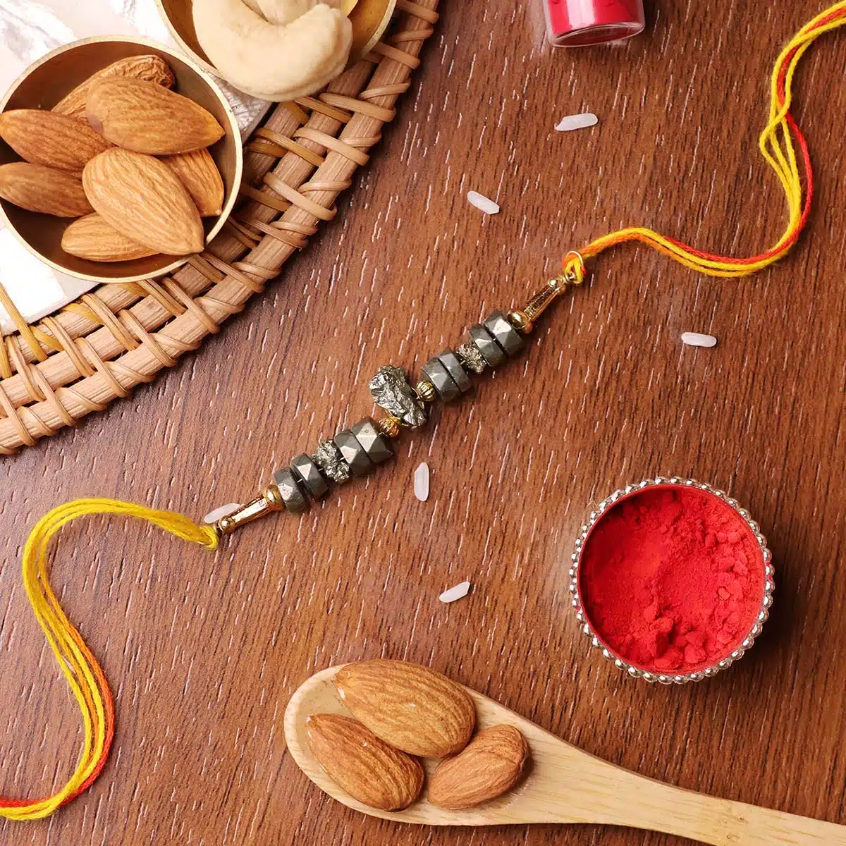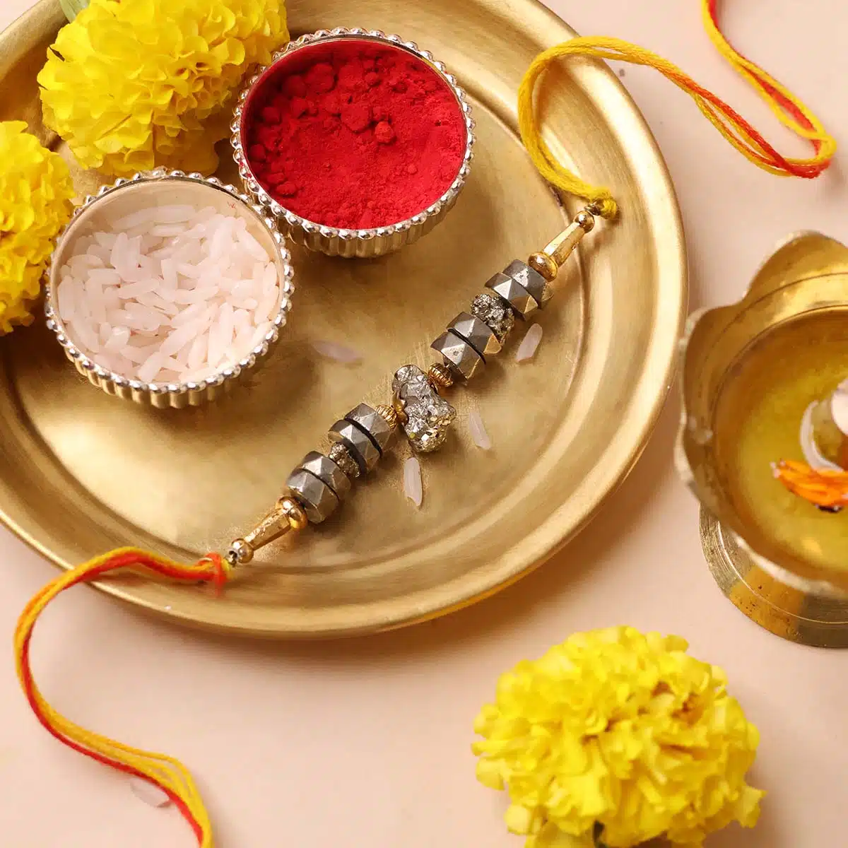 - With Box – Rakhi, Chawal-Kumkum, 2 chocolate coins, and a Rakhi card packed in a festive gift box.