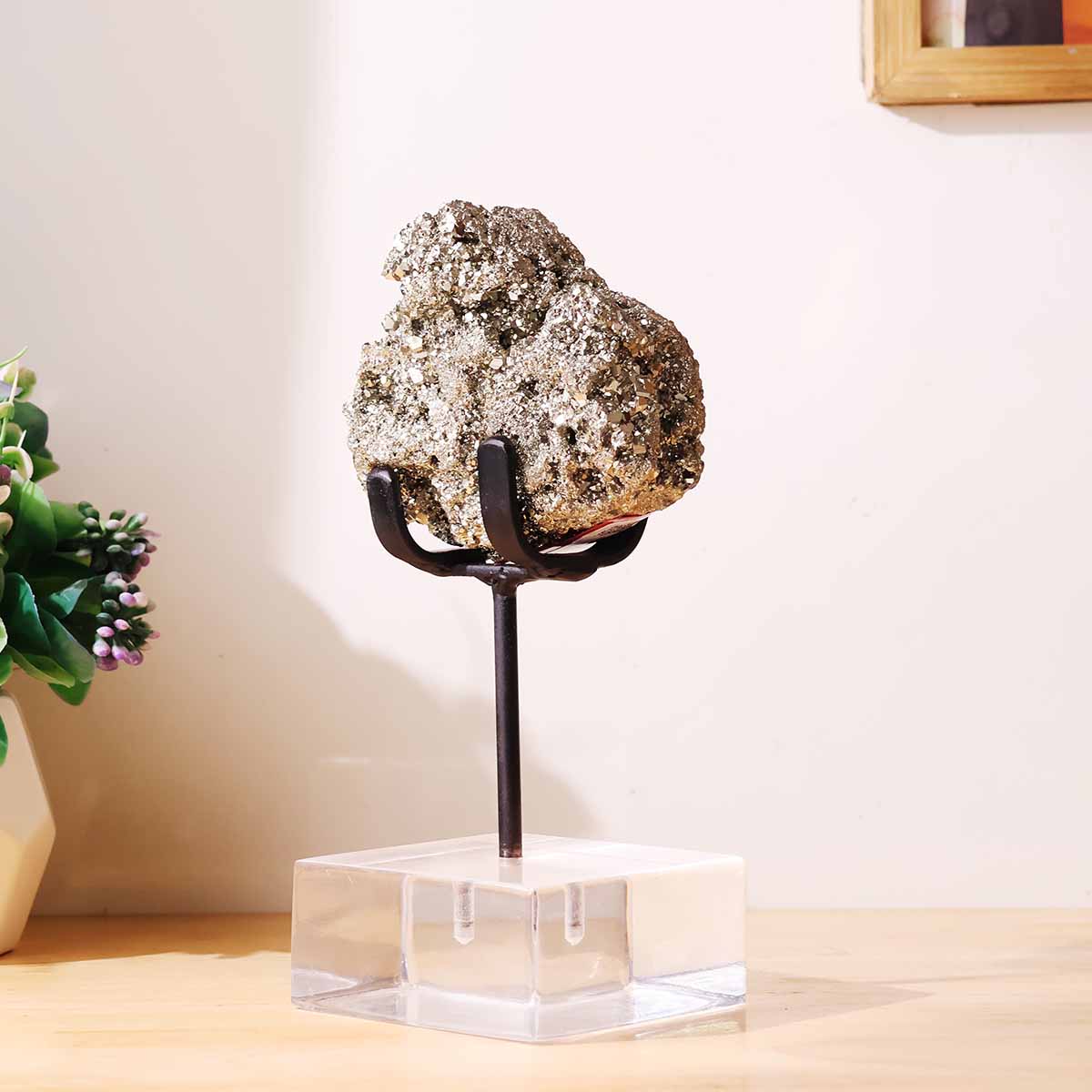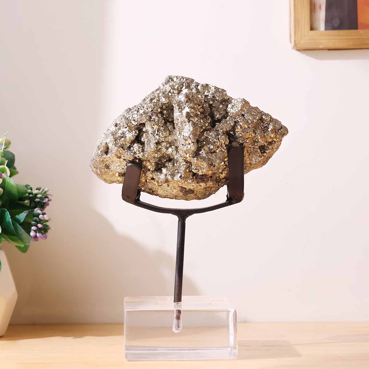 You will receive one Pyrite cluster with stand similar to the one shown. Each piece is natural and unique, so slight variations in shape, size, and metallic shine may occur. Images represent typical quality.